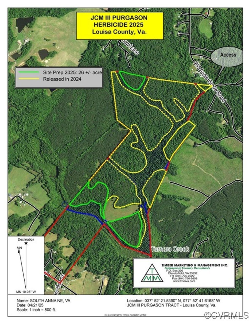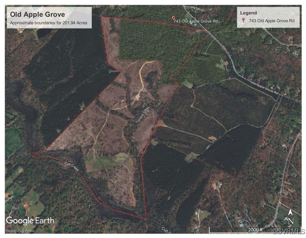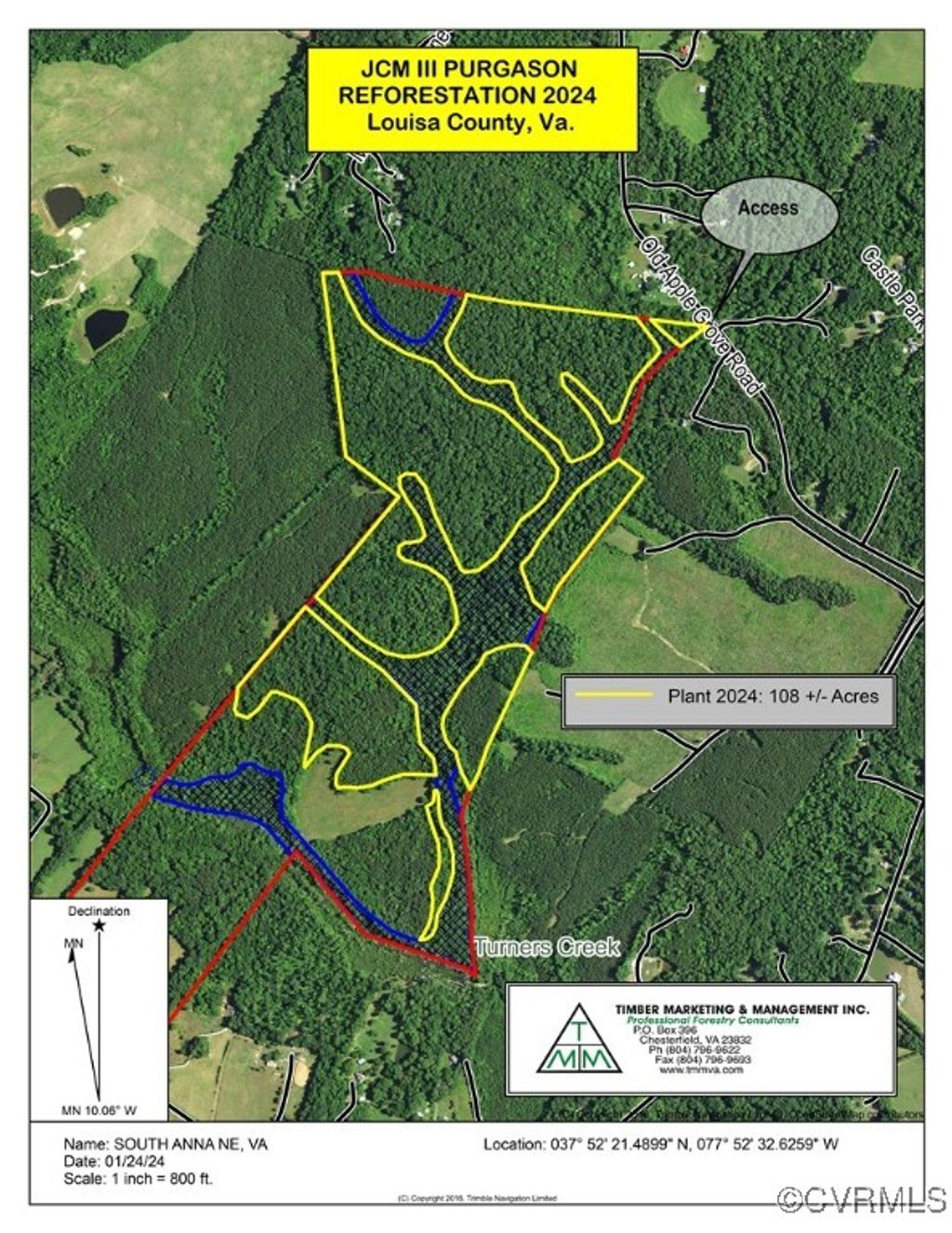 Welcome to Old Apple Grove Road. This beautiful piece of land is comprised 201.94 acres of gently rolling hills, numerous streams & bold creeks, a secluded 8 acre field, 4500' of internal road, hardwoods, young pine plantation, and a swamp along the rear boundary. The property was just surveyed in June of 2025 saving you thousands and making the boundaries easily identifiable. The owner recently installed a gravel turnaround and driveway leading several hundred feet into the property. Beyond the gravel they had a hunting/recreational road installed complete with a very wide travel area and culverts at each creek. The road leads through several SMZ areas before ending at the 8 acre secluded field. The SMZ and swamp cover roughly 59 acres of the property offering great wildlife corridors, tree stand options, food sources, turkey roost, and the swamp hopefully will hold a few ducks. The clear cut area is in two stages. Stage 1 is 108 acres of pine plantation established & sprayed in 2024 while stage 2 is 26 acres that was sprayed in 2025 and still needs to be planted. This tract offers privacy, seclusion, and even easy access back to I-64. The property is at a perfect stage to view for future planning. Its a blank slate and you can see how the land rolls. Now is the time to get in there and plan the food plots, additional clearings, any other trail system you'd want, future homesites etc, you can actually see things. The property hosts an abundance of wildlife and I believe is well situated for the outdoor enthusiast. It is bound on 2 sides by large creeks, Turners Creek & Cub Creek, is surrounded by other large parcels, has a variety of landscape features, & a diverse forestry makeup. There aren't many tracts of this size or type available these days. Come take a look before it's too late.