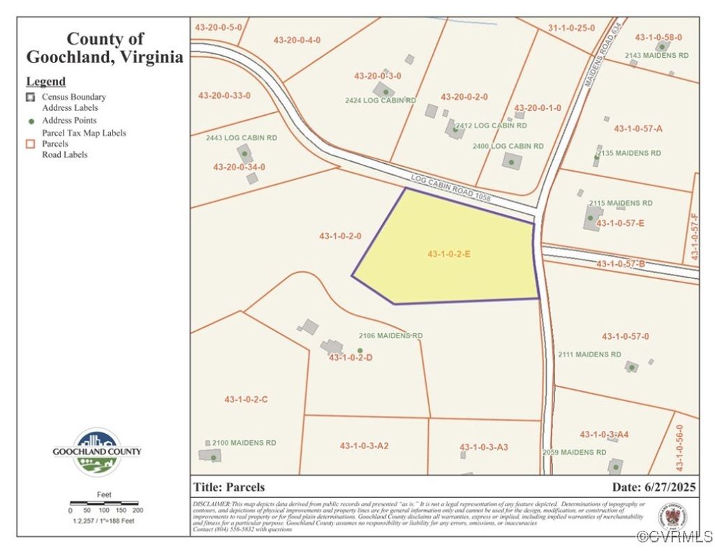 New homesite totaling 3.074 acres. Property is covered in mature 80+ year old hardwoods. Located in the Lickinghole District, it's 2 miles from Goochland's new elementary school, middle, and high school, 1.5 Miles to J. Sergeant Reynolds Community College & YMCA, 14 Miles to Short Pump. The parcel is perked for 4 bedroom home. On the corner of Log Cabin Rd or Maidens Rd. NO HOA! Comcast service and power hookup at road. Seller has multiple builders available upon request.