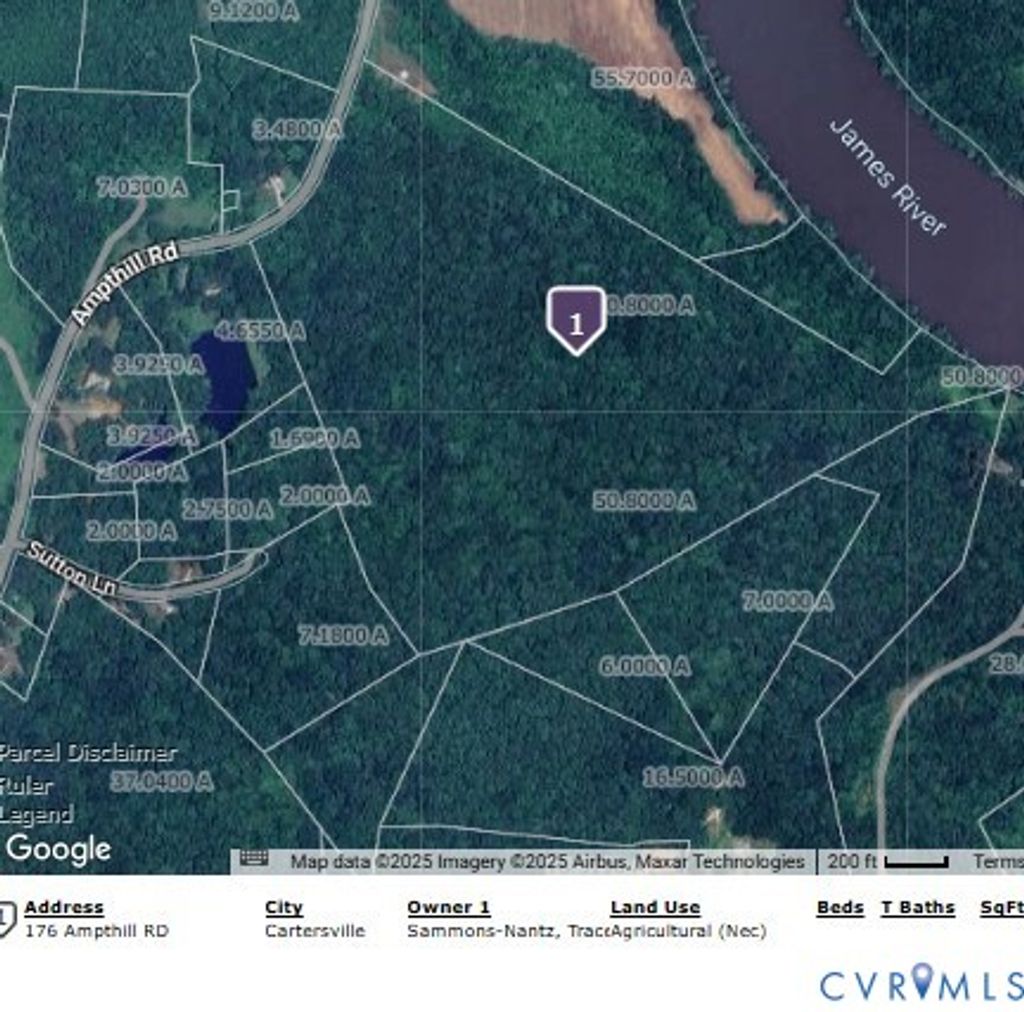 STUNNING 56.60-acre JAMES RIVER property at 176 Ampthill Road in Cartersville, VA, features mature hardwoods"”white and red oak, walnut, hickory, poplar, and birch"”two old homesites with wells, septic systems, driveways with new culverts, and RIVER FRONTAGE. The land includes creeks, offers prime opportunities for building the home of your dreams, hunting, fishing, and outdoor recreation. Located about 45 minutes West of Richmond. New Survey and Timber Value are Coming Soon. Two Parcels combined 18-A-22 & 18-A-6 DON'T MISS THIS ON OF A KIND RIVER-FRONT PROPERTY! Utilities:Dominion Power onsite with Firefly Fiber Optic Cable available.