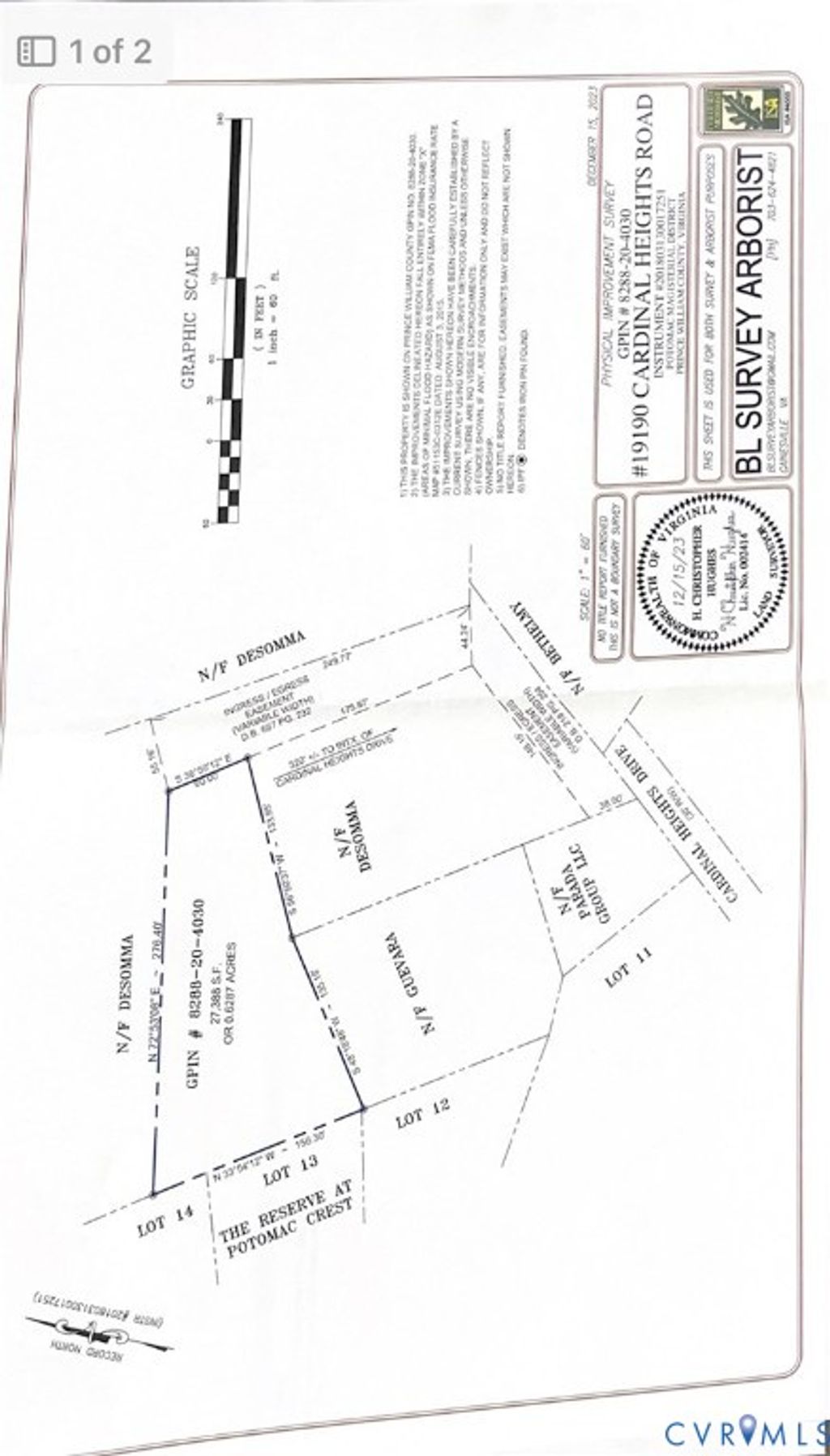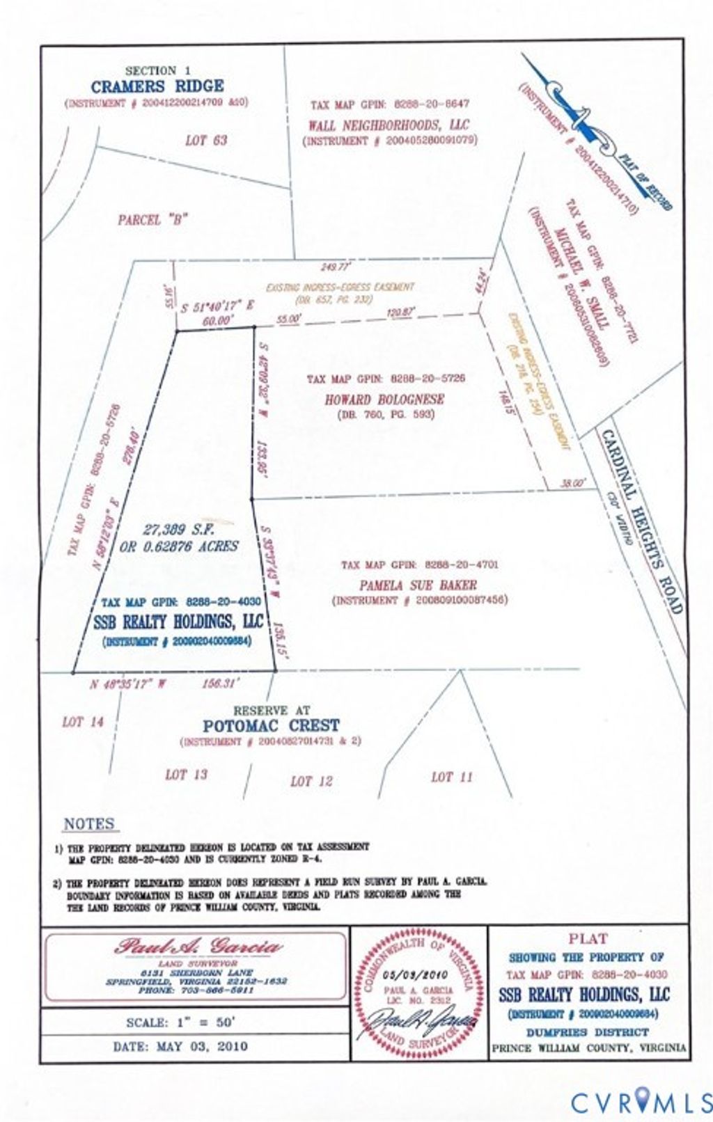 Looking for land to build your next home in Triangle near Quantico? Here's your chance! This large beautiful lot (.629 acres) is ready for you to bring your builder! No HOA!!! Home does have an access easement at the end of Cardinal Heights Rd, see listing pictures for images of the survey and for how to access. Water/sewer/electric all at the road. Purchaser to perform their own due diligence.