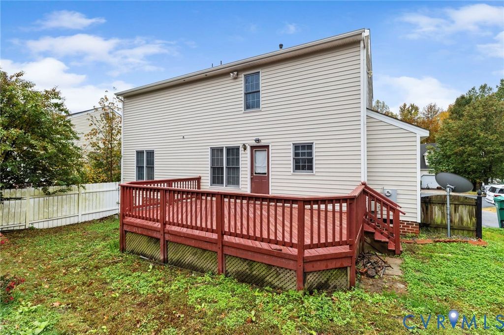 Welcome to this charming four-bedroom, 2½-bath home in the desirable Pemberton Creek community of Henrico County just listed under $400K. Offering 1,728 sq. ft. of comfortable living space, this home boasts a beautiful transitional exterior with a full front porch that sets the tone for the inviting interior within. Step inside to find a spacious family room featuring bamboo wood floors and a cozy gas fireplace with a decorative mantle, the perfect spot to relax and unwind. The well-appointed kitchen showcases new stainless steel appliances, abundant counter and cabinet space, and rear deck access for easy indoor-outdoor entertaining. A bright adjacent dining area is ideal for family meals, while a convenient laundry room with built-in shelving adds function and organization. A versatile flex room on the first floor, complete with a ceiling fan, offers endless possibilities, ideal for a home office, playroom, or additional living space. Upstairs, the primary bedroom features dual closets, a ceiling fan, and a private en suite bath with a vanity and tub/shower combo. Three additional bedrooms each offer plush carpeting, oversized closets, and ceiling fans, sharing a full hall bath. Outside, enjoy a large rear deck overlooking the fenced backyard, perfect for gatherings or quiet evenings outdoors. Additional storage can be found in the above attic space and detached shed. This delightful Pemberton Creek home combines comfort, versatility, and style, ready to welcome you home!