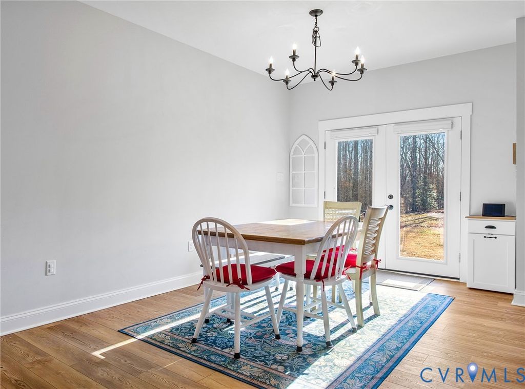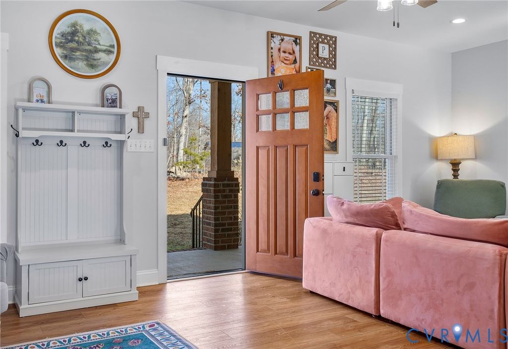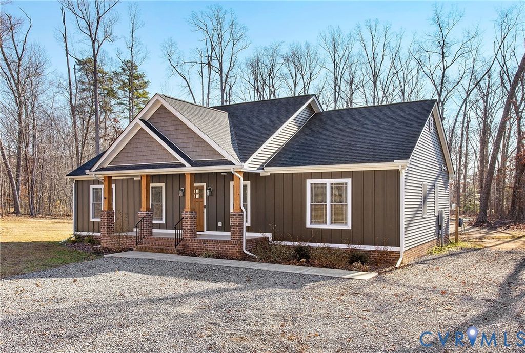 Welcome to this beautiful New Construction home on 2 acres in Goochland! This 1-story living home is only 2 miles from I-64, 25 minutes from Short Pump and 30 minutes to Charlottesville. Built only a couple years ago, this home still has a brand new feel and has been extremely well maintained. The home welcomes you with a brick and concrete front porch and into a large open family room and open concept kitchen space. The entire home has hardwood style commercial grade LVP, that not only looks amazing but is extremely durable. The kitchen includes quartz countertops, white cabinets, stainless steel appliances, recessed lighting and beautiful pendant lights over the kitchen island, perfect for hosting guests or serving dinners. The Primary suite is just off of the family area and includes a huge walk-in closet and bathroom en-suite. The Primary bathroom is large and spacious, including a soaking tub, stand up shower, double vanity with granite countertops, and separate water closet. Opposite the family room, you will find the two additional large bedrooms and additional full bathroom with granite countertops and tub shower. The rear of the home opens up to an amazing private, large back yard that is spacious and open. The lot extends beyond the tree line and provides a very nice privacy buffer; this yard is large enough and has the perfect layout for future additions such as a playground area, large gardens, a detached garage and/or a pool.