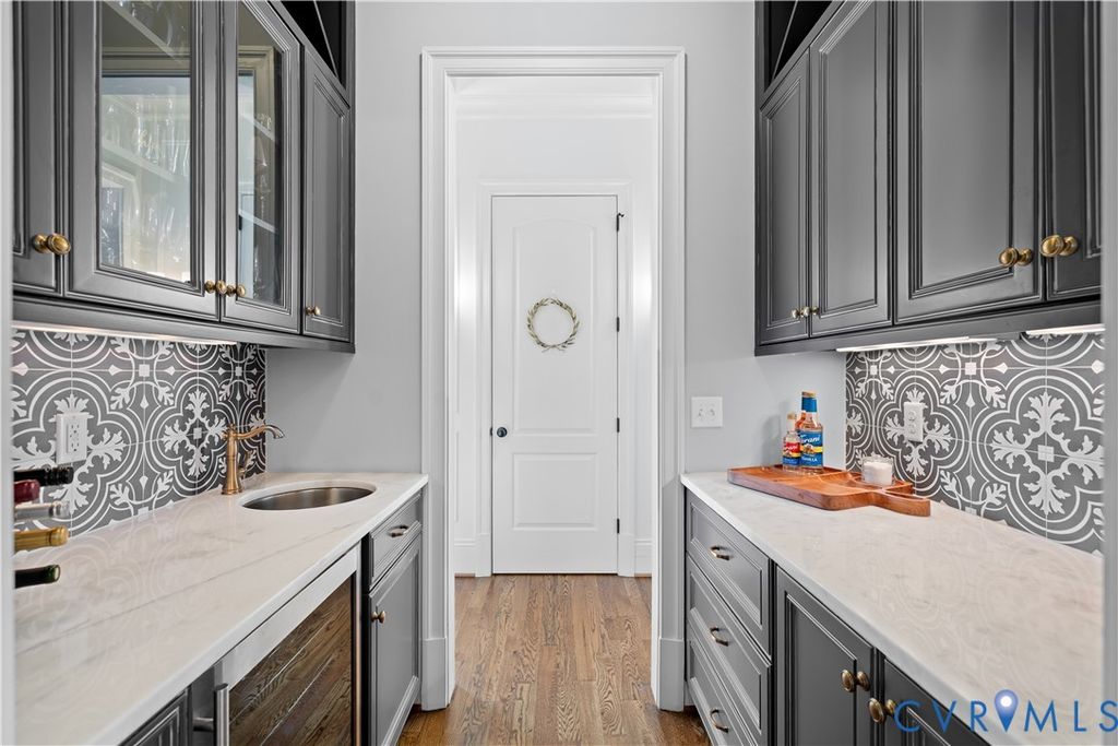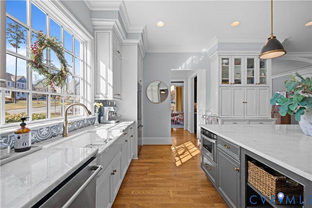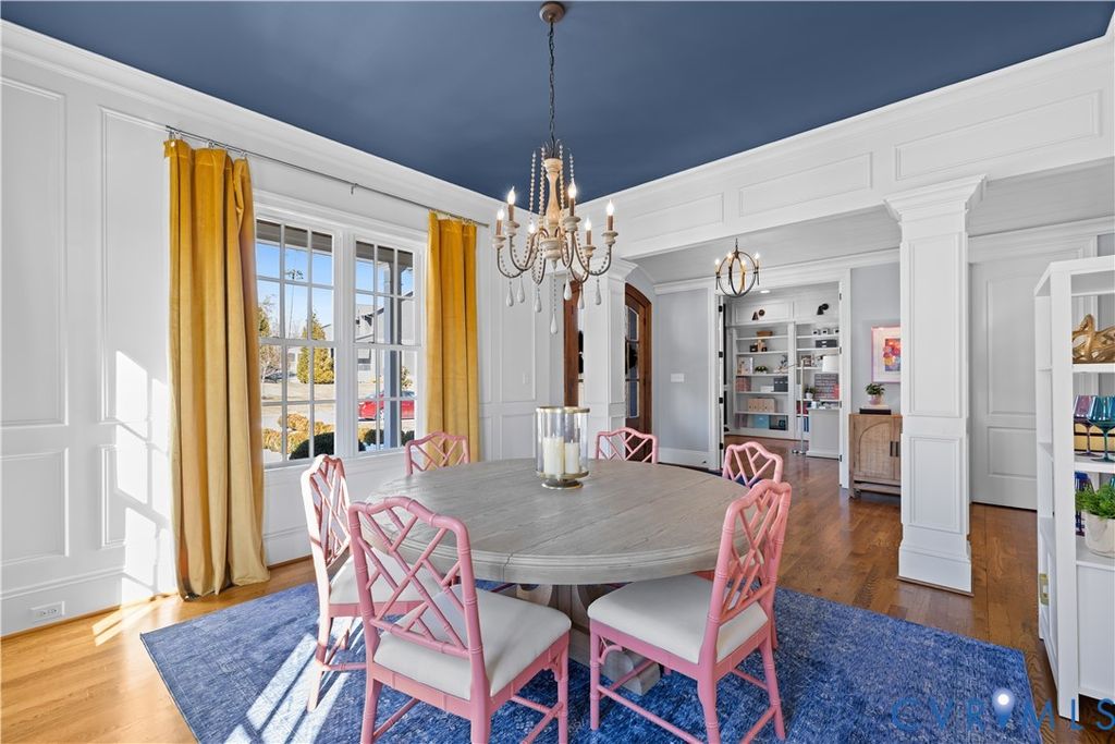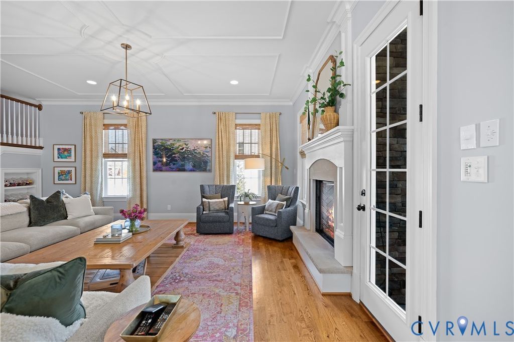 Magazine-worthy design, architectural distinction, and exceptional detail define this stunning custom home. Every space is intentionally crafted for refined comfort, effortless entertaining, and enduring style. A dramatic barreled ceiling foyer creates an unforgettable first impression. A private home office with custom millwork offers an executive workspace, while the formal dining room showcases designer finishes and elegant architectural accents. The chef's kitchen features custom cabinetry, striking backsplash, oversized island, upscale appliances, and sophisticated lighting. A premium walk-in pantry provides elevated storage, and the butler's pantry with wet bar and glass-front cabinetry connects seamlessly to the dining room for effortless entertaining. The light-filled family room with coffered-style molding ceiling, crown trim, and recessed lighting centers around a dramatic double-sided fireplace extending to the covered rear patio, creating integrated indoor-outdoor living. The primary suite is a private retreat with statement accent wall, sitting area, custom window bench, and spa-inspired ensuite complete with a freestanding soaking tub, oversized glass shower with dual shower heads, dual vanities, and refined finishes. A well-appointed guest bedroom enjoys its own private bath. Two additional bedrooms "” including one styled as a home fitness studio "” share a beautifully designed Jack-and-Jill bath. Upstairs, a spacious loft with half bath offers flexibility for media, study, or lounge space. A charming under-stair hideaway features a built-in desk, bench seating, sconces, and media setup. A well-designed drop zone with built-ins keeps daily living organized. The finished garage offers a professionally installed epoxy floor and custom organization. Situated on a premium corner homesite with fenced backyard, kids play gym and covered front and rear porches, this residence delivers elevated design and lifestyle at its finest. A rare opportunity to own a truly curated, architecturally distinctive home.