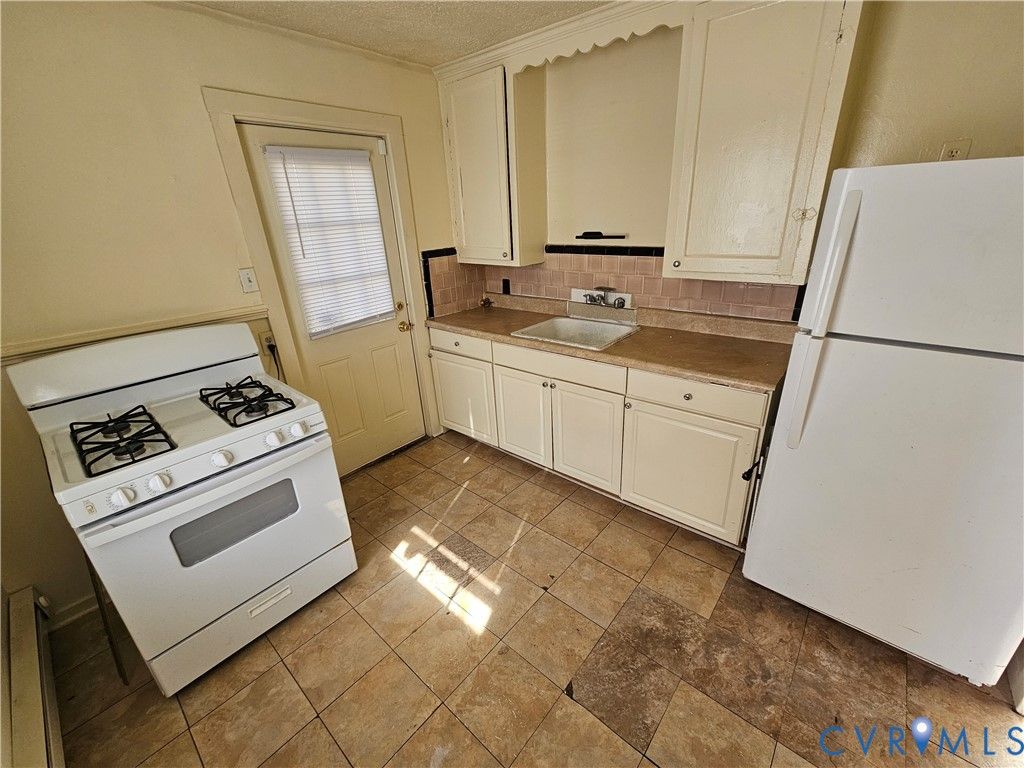 Two bedroom home with living room, kitchen, stove/refrigerator, 1 full bath w/new sheet flooring, rear bedrooms with new carpet, and electric base heat!
