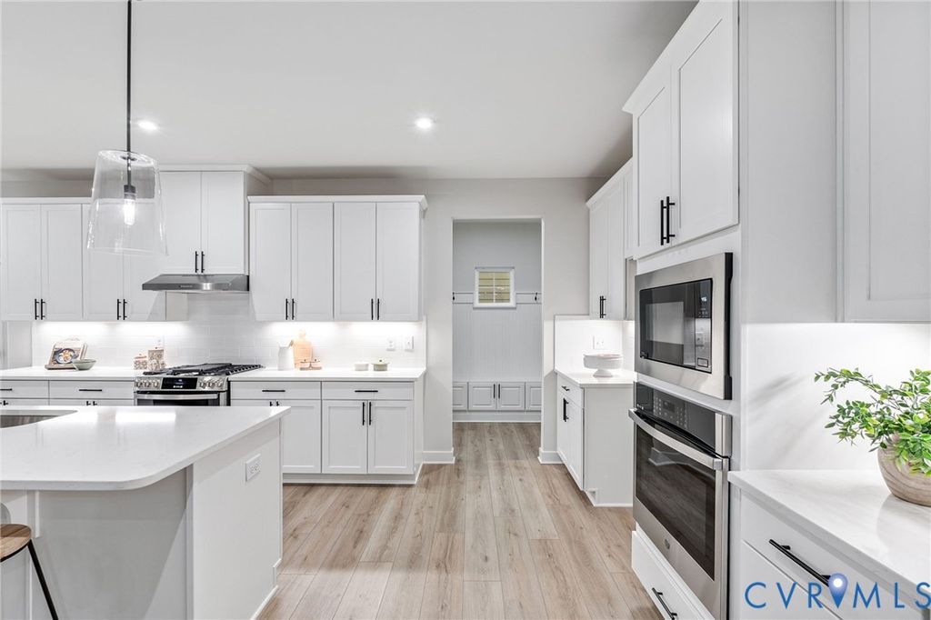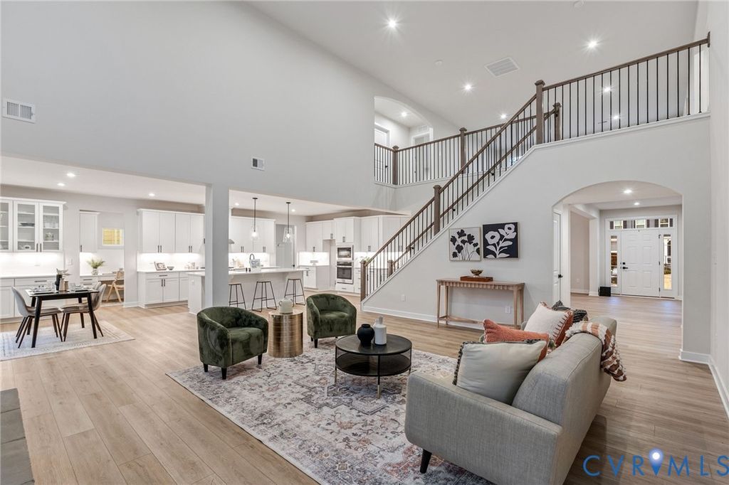 Welcome to refined living in Magnolia Green. This newly built, move-in ready home blends timeless design with thoughtful functionality. The foyer opens to an office and formal dining room before unfolding into a breathtaking two-story living room highlighted by a floor-to-ceiling stone fireplace. Designed for connection, the living room, kitchen, and breakfast area flow seamlessly together. The expansive fully upgraded kitchen features white cabinetry, hawthorne quartz countertops, under cabinet lighting, white tile backsplash and abundant storage. A built-in office nook, and a generous drop zone off the garage to simplify daily life. The main living areas feature upgraded LVP flooring. A versatile first floor bedroom features LVP flooring with a full bath with walk in shower and private deck provides endless possibilities. A separate deck off the breakfast area creates additional outdoor living space. Getting to the second floor, the upgraded oak stairs with black balusters lead to a central loft which offers an additional living space. The primary suite impresses with tray ceilings, a walk-in closet, and a luxurious bath with high-end finishes. Two bedrooms share a hall bath, while a fourth bedroom enjoys its own private bathroom that features a walk in shower. This is effortless, elevated living at its finest.