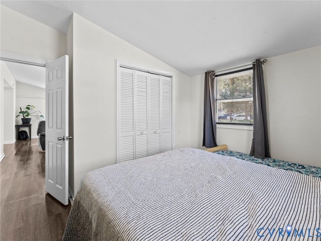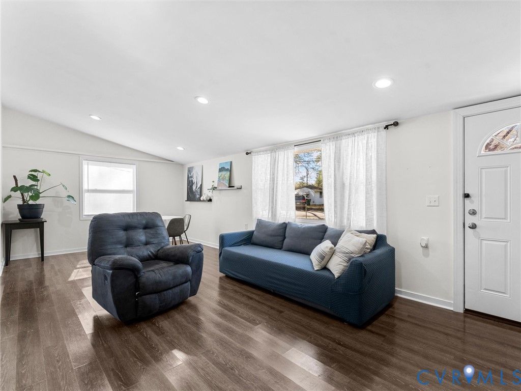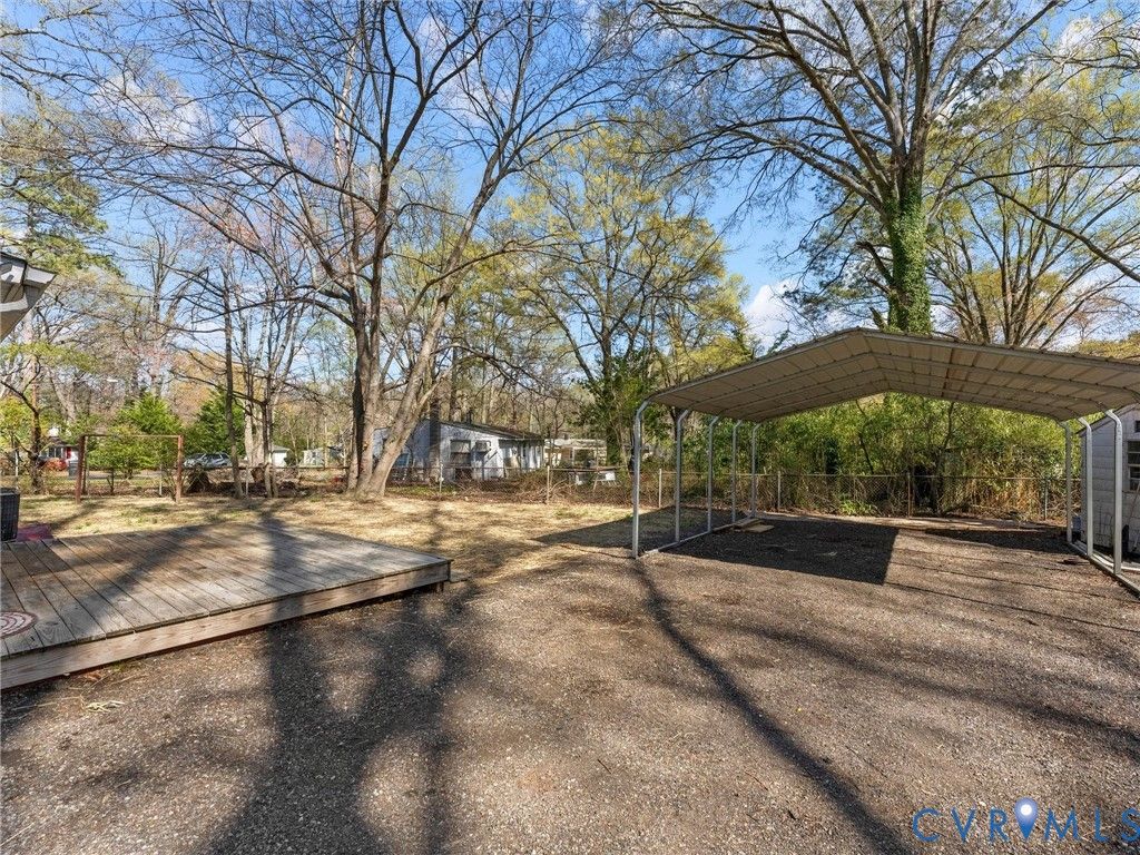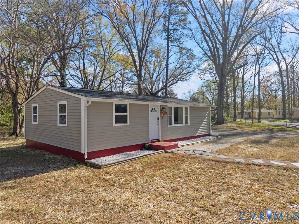 Welcome to 1401 Bramwell Rd. This 2 bedroom, 1.5 bath home is situated on a spacious corner lot and offers a large, mostly fenced yard that wraps around the home, along with a detached shed and a carport for additional parking. The exterior features vinyl siding, vinyl windows, fresh mulch and rock beds, plus a 30 yr. Dimensional shingle roof replaced in 2019. Inside the home has been freshly painted a crisp Alabaster White and includes LVP flooring throughout. The living room welcomes you with vaulted ceilings, recessed lighting, and a brand-new vinyl picture window. The dining area flows into a spacious, open-concept kitchen featuring vaulted ceilings, recessed lighting, two-tone cabinetry, updated countertops, and a custom built coffee bar with additional storage. There is also backdoor access to a large deck, along with a conveniently located stacked washer/dryer area and a tankless water heater. The half bath is complete with an updated vanity, updated tile flooring, updated mirror and lighting. The home offers a primary bedroom with recessed lighting and LVP flooring, plus a second bedroom with vaulted ceilings and a double-door closet. The full bath includes tile flooring, a walk-in shower with tile surround, and an updated vanity, mirror, and lighting. Enjoy the outdoors in your huge corner lot with tons of potential! Convenient access to Hull St. and Chippenham Pkwy.