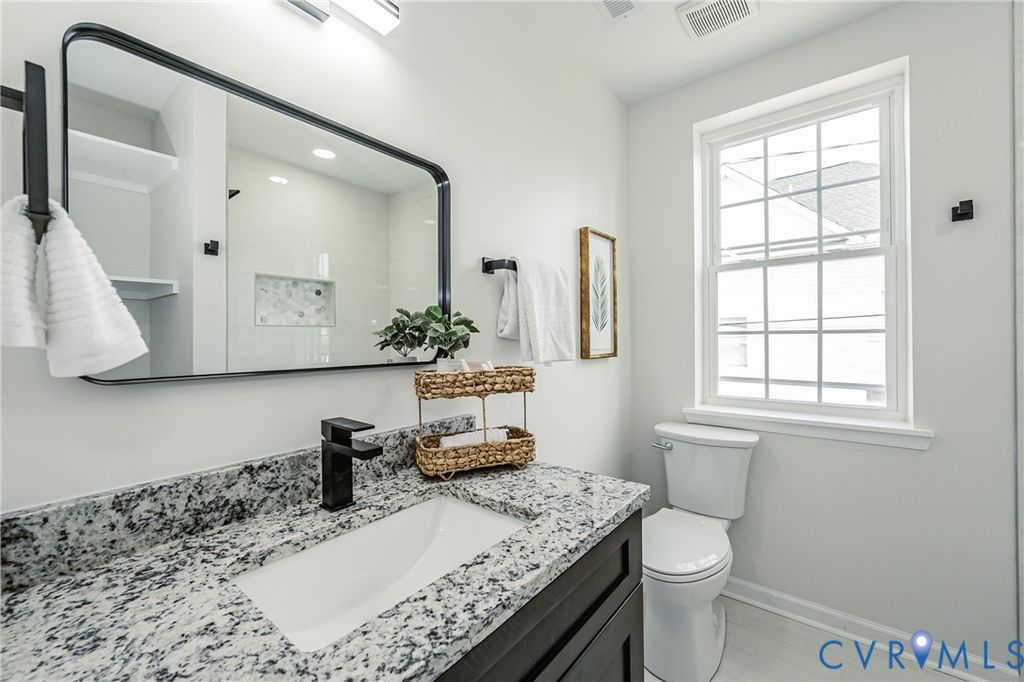 WOW!!... Step into this meticulously rehabilitated brick Colonial where timeless durability meets contemporary sophistication. Properties like this simply don't come around often, you won't want to miss this one. This home stands apart with its solid brick construction and time-tested, durable slate roof, a combination that's nearly impossible to find today. Beyond those enduring elements, virtually everything else is brand new. No expense was spared, no corner was cut, and the result is a home that feels both classic and completely refreshed. Offering 1,638 square feet + bonus living in area in the basement, the home combines timeless character with modern updates throughout. Improvements including a fully updated New Kitchen, New Full Bathrooms, new plumbing, new drywall, enhanced insulation, and two brand-new Trane HVAC systems. New Bella hardwood flooring in a hickory finish runs throughout, along with 9-foot ceilings and recessed lighting on both the first and second floors. The new kitchen features new cabinets, granite countertops, new appliances, and a large island with bar seating. On the first floor, there is a spacious bedroom that can serve as a primary bedroom, guest room, or office, along with a fully updated full bath featuring a granite countertop and tiled shower. Upstairs, both bedrooms have private full luxury bathrooms and spacious closets, creating two true suites. As a bonus, the newly finished basement adds additional living space that is not only suitable for a bedroom, but may be ideal for a rec room, gym, media room, or flex space, and includes a new washer and dryer tucked into the laundry closet. Situated on a corner lot, the exterior offers a newly built front porch and a large fenced backyard with brand-new privacy fencing. Conveniently located near Richmond dining, shopping, parks, and downtown access, this move-in ready home offers quality updates, space, and location. This property is ready for it new owner and is sure not to last.