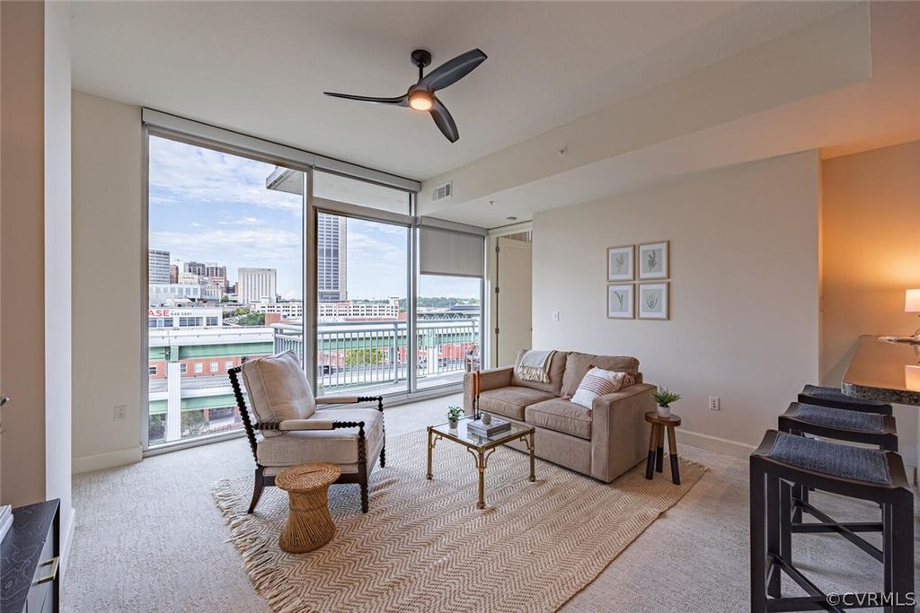 Welcome home to this stunning condo with breathtaking canal and city skyline views! This condo features two bedrooms and two full bathrooms. Ceramic tile in the kitchen and bathrooms. The kitchen features stainless steel appliances and electric cooking. Vistas on the James is the perfect location if you're looking for serenity while being just steps away from downtown, the central business district, Shockoe Slip and The James River Park System. Enjoy restaurants, bars, hiking, walking trails, and kayaking all in your backyard! The building features a gym, secured parking with two deeded space (# 10 & 19), and one deeded storage unit (# 1-8). Manned security, cable/internet and all building maintenance are also included in the HOA fee. Other upgrades include New HVAC (2022), new dishwasher (2022), new carpet (2022)