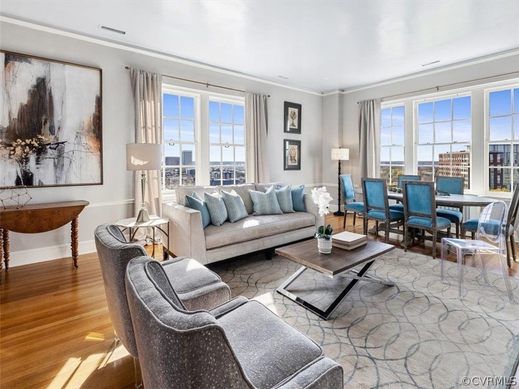 The Prestwould, a landmark building overlooking Monroe Park, and Altria Theater and The Cathedral, was designed in the 1920s by noted English architect Alfred Bossom as the first NYC-style highrise in Richmond. This gorgeous top-floor condo is light-filled and has 10' ceilings, impressive millwork, and original hardwood floors throughout. At 1,837 sq ft, it is the petite penthouse of the building with magnificent views from every window. The entry foyer is noted as a 'gallery hall' on original plans with picture moulding and space for your art collection. Formal rooms are light-filled and flexible with great flow from living room, dining area, family room, morning room and chef's kitchen with granite countertops and stainless steel applicances. There are two spacious bedrooms and a charming original classic grey and white tile bath with a soaking tub, and an additional half bath. Today, this sophisticated condo offers the highest level of services available including gated parking, on-site management, security, maintenance, elevators, paid water & gas, heat, door service for mail & packages, and trash collection. Gather in the communal courtyard or step out to all the city offers!