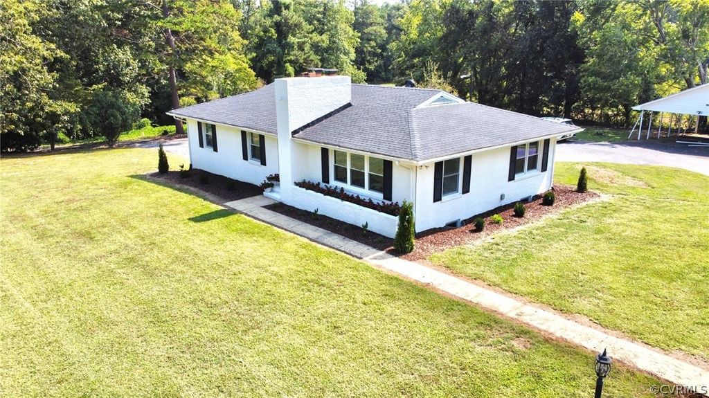 GORGEOUS renovated rancher on 2.5 acres in Dinwiddie!! This home has been beautifully redone - 1,504 square feet, 3 bedrooms, 3 full baths, lovely open floor plan including living room with cozy brick fireplace and hardwood floors leading to the spacious eat-in kitchen with granite counters, stainless steel appliances, and center island. There is a heat pump and central air, a primary bedroom with hardwood floors and private full bath with awesome ceramic tile flooring, and 2 additional good-sized bedrooms and another full updated bath. There is a NEW roof, NEW HVAC, NEW lighting, NEW plumbing, NEW windows, NEW well pump, a detached 2-car carport and a paved wrap-around drivway. There is also a FULL unfinished basement with garage access and another full bath - so much potential there! Close enough to surrounding cities to be convenient, rural enough to be peaceful and quiet. Check it out!