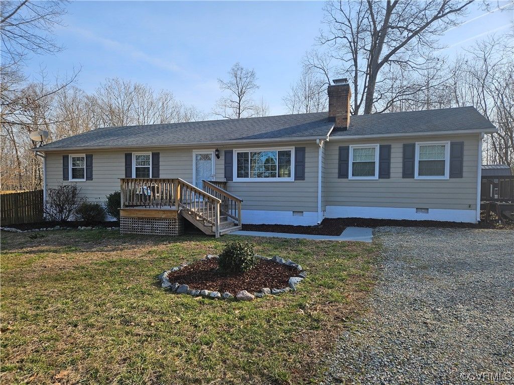 Work from home with high speed comcast internet from this charming move in ready ranch home which is nestled in a serene and quiet neighborhood in coveted eastern Powhatan off Red Lane, only minutes from Westchester and 288. You enter a cozy Family Room that's had the wall separating it from the Kitchen removed creating an 'Open Concept' feel. The kitchen boasts bright and sunny mornings. There are many recent upgrades to this kitchen such as new cabinets, stainless appliances, tile backsplash, Corian counters, pantry, and recessed lighting. Adjacent to the kitchen is the Laundry Room offering lots of storage space via beautiful white cabinets which leads out to a HUGE rear deck. A true entertaining space for those outdoor get togethers including a patio with a fire pit and ample parking for guests. On the opposite side of the kitchen is the entry into the primary En-suite with and a full primary bath. The primary bedroom is spacious and light w/vaulted ceiling and a sliding glass door that exits to the side deck which wraps around to become the back deck. There are 3 more bedrooms... one of which has a half Bath attached. There is also a newly renovated full hall bath. Exterior offers a large level landscaped lot with established perennials backing to a mature wooded view. Sunsets are spectacular from the front porch. There are 3 detached storage sheds to add to the already amount of storage in this home. Don't miss this opportunity!