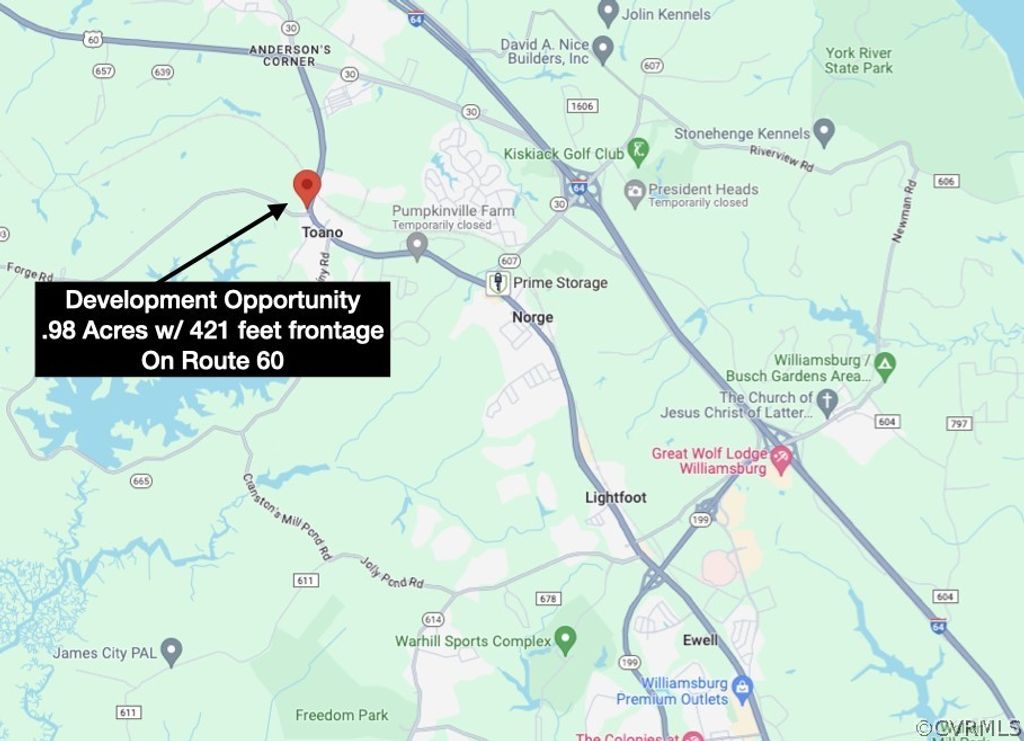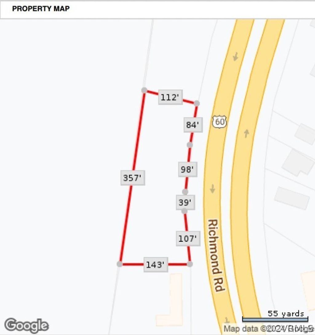 Prime Development Opportunity Along Major Thoroughfare. High visibility and accessibility from Rte 60/Richmond Road. Benefit from flexible B1 zoning regulations that accommodate a variety of commercial uses, including but not limited to professional services, retail establishments, and office spaces. Take advantage of a growing surrounding community enriched with a diverse array of amenities such as shopping centers, dining establishments, and recreational facilities. The setback for a building on the parcel is 50 feet. However, with approval of the planning director, it could be reduced to as low as 25 feet. Lot is wooded and would require clearing. Powerlines run above the property. Dimensions: 129.87 x 421 x 86.45 x 452.17. Excellent road frontage on Rt 60/Richmond Hwy; 328 feet.