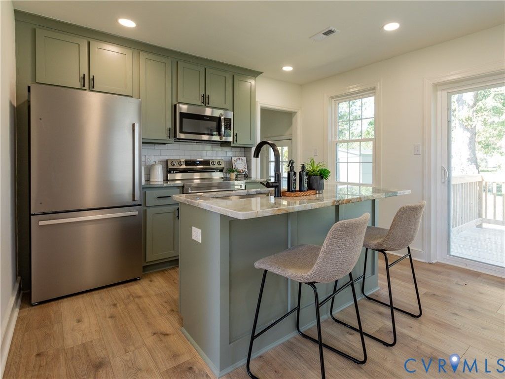 Cute Fulton Hill Brick Cape with 3 beds and 2 full baths! Kitchen features an island, locally-made-solid-wood cabinets, high level granite counters and upgraded appliances. Waterproof laminate flooring, tile and carpet throughout. Eat-in kitchen, living room, new thermal windows, new dimensional roof, new heat pump, new water heater and more! First level offers 2 bedrooms and one full bath, and the second floor is the primary bedroom and additional private full bath. Very convenient location, just around the bend from Church Hill, Virginia Capital Trail, Breweries (walk to Triple Crossing Beer) and all that RVA has to offer. READY-TO-MOVE-IN WITH ALL APPLIANCES INCLUDING WASHER, DRYER AND FRIDGE. Large, fenced yard with a shed and small deck, perfect for a dog and autumn fire pit.