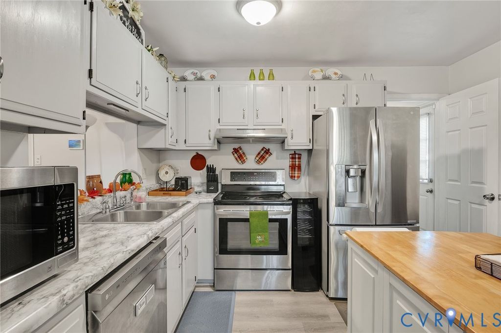 Welcome to Kings Forest! This charming ranch-style home sits on a fantastic lot and offers 3 bedrooms and 2 full bathrooms. Highlights include a timeless eat-in kitchen with vinyl plank flooring, a butcher block island, and newer carpet throughout. The cozy living room features a new ceiling fan, while the spacious great room with a ceiling fan provides plenty of room for entertaining or relaxing. The primary bedroom boasts an updated en-suite, and the additional bedrooms are generously sized with ceiling fans. The large utility room offers ample storage and side entry. Outside, the expansive backyard features a deck and a storage area with electricity for outdoor fun. Notable updates include a rear roof (2024), HVAC (2018), carpet (2021), and vinyl plank flooring (2023). With newer appliances, a great location, no HOA, a paved driveway, natural lighting, an attached shed, a front porch, and a security system, this home is conveniently close to highways, shopping, and restaurants.