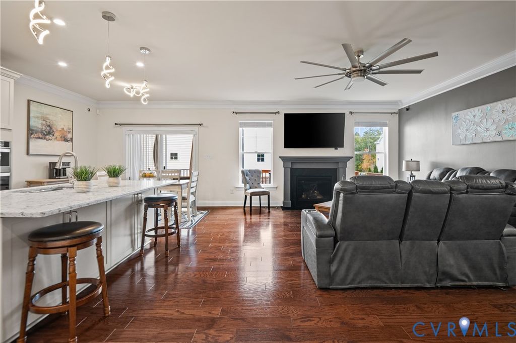 Welcome to this stunning, 2019-built tri-level home in the heart of Harpers Mill, offering 3,445 sq ft, 5 bedrooms, and 4 full baths. Thoughtfully crafted and designed for both everyday life and entertaining. Step into an open-concept kitchen with granite countertops, a generous island, pendant lighting, and a cozy eat-in area flowing into the family room anchored by a gas fireplace. For ultimate convenience, the first floor features a private guest suite, along with a French-doored office ideal for work-from-home flexibility. Upstairs, you'll find a primary suite connected to a spacious rec room perfect as a secondary "suite wing." Additional bedrooms include generous walk-in closets. A dedicated laundry with built-in cabinetry elevates everyday functionality. Outside, enjoy relaxing on the inviting front porch, a screened rear porch, and a deck overlooking a fenced backyard. Living in Harpers Mill means more than a home, it's a lifestyle. Community amenities include a clubhouse, resort-style pool, playgrounds, walking trails, and more. Top-rated Winterpock Elementary School is within the community; Deep Creek Middle School & Cosby High School serves older students. Experience modern living, privacy, and neighborhood charm all in one package. Schedule your private showing today and see why this home is one of Harpers Mill's finest.