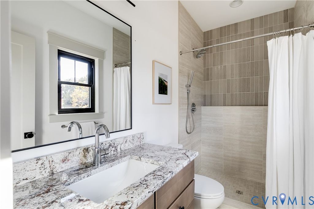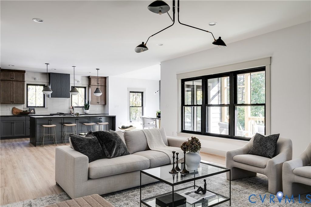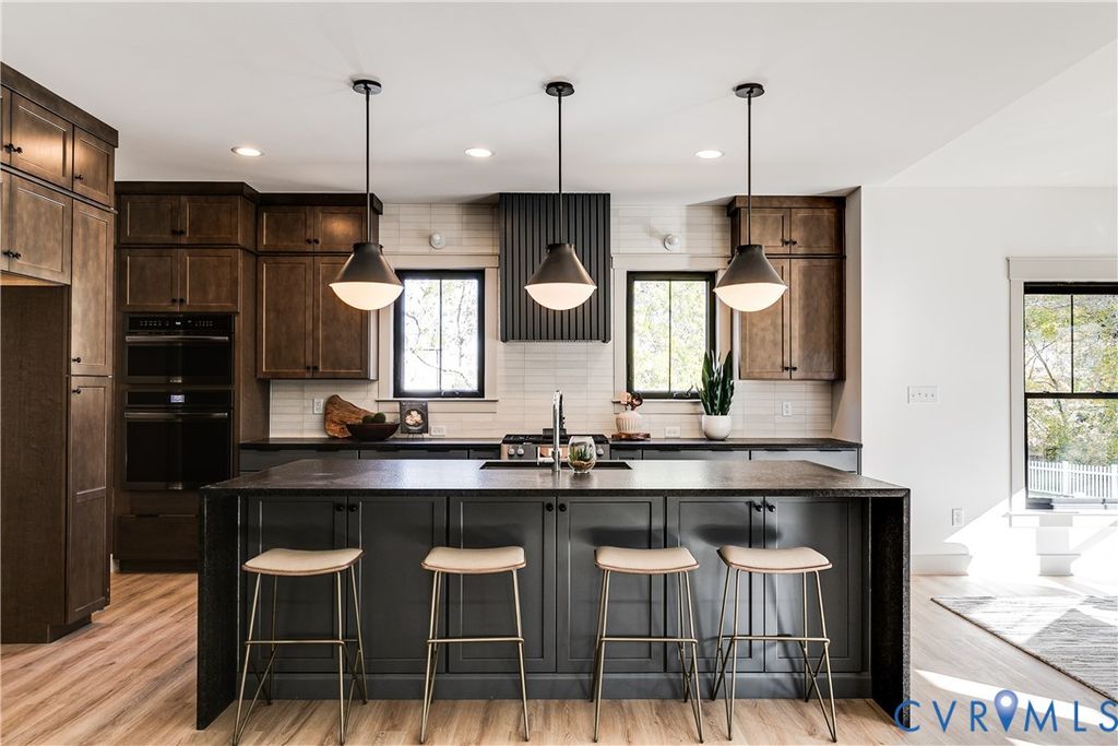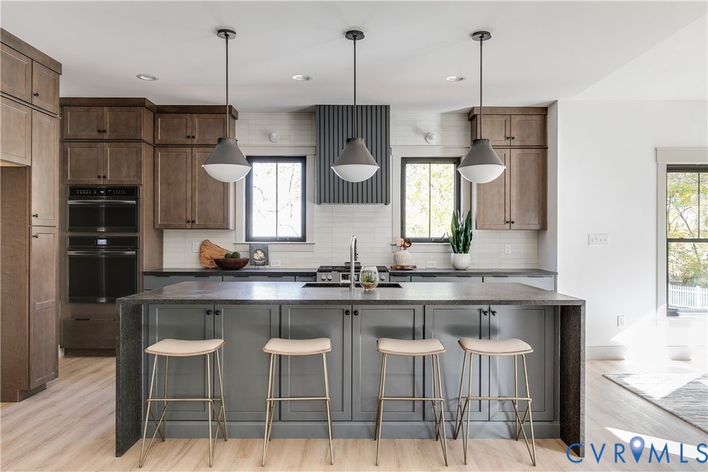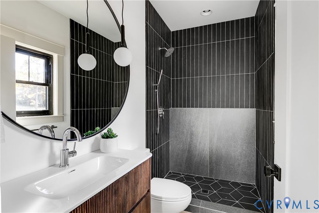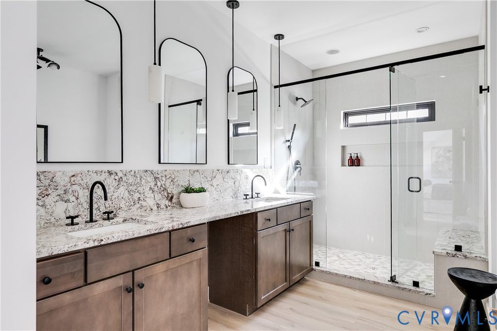 Modern design meets timeless warmth in this transitional farmhouse masterpiece"”crafted with designer precision and positioned on nearly half an acre in one of Manakin-Sabot's most convenient and private enclaves just off Hockett Road. Minutes from Short Pump, GreenGate, and Kinloch Country Club, this premium location offers the rare combination of serenity, accessibility, and no HOA"”giving you the freedom to add a pool or personalize your property as you wish. The exterior's dark charcoal monochrome palette"”black windows, stained-wood front and garage doors, and soft beige brick"”creates a look as refined and timeless as a charcoal suit. Warm natural textures, a stained porch ceiling, and detailed craftsmanship balance the bold palette with inviting character. Inside, every element has been curated by a California-based luxury designer featured on HGTV, blending natural materials with dramatic tone. The first floor centers on a spacious living room with a fireplace finished in Roman clay, built-ins, and floating shelves. The chef's kitchen features a massive waterfall island in leathered black granite, custom cabinetry with an aged-oak finish, a custom hood, gas range, wall oven with air-fryer function, and a dry bar with floating shelves and under-cabinet lighting. A light-filled dining area opens to the covered screened porch, while a first-floor suite doubles as a guest room or office with a private full bath. Upstairs, the primary suite impresses with a beamed ceiling, oversized walk-in closet, and a spa-level bath featuring a freestanding tub, frameless glass shower, and dual vanity with a central seated makeup area topped in granite and lit by stone pendant lighting. Three additional bedrooms include a private suite and Jack-and-Jill bath, plus a loft and connected pass-through laundry room. The third floor offers a 500+ sq ft bonus room with half bath and walk-in attic. Every finish was intentionally selected"”proof that this home is far more than a typical new build.
