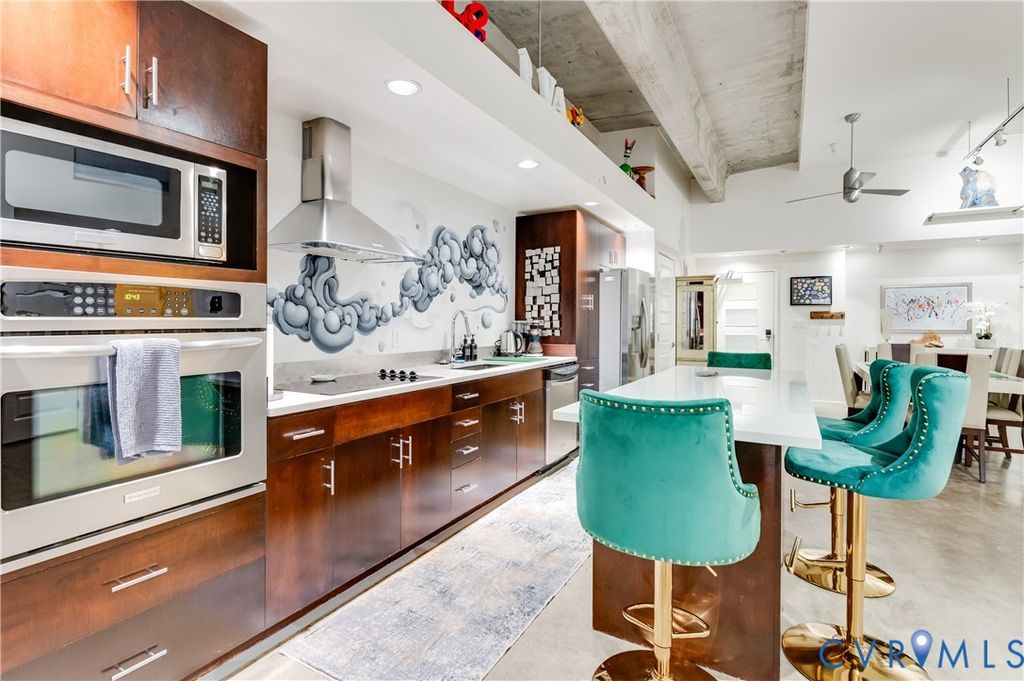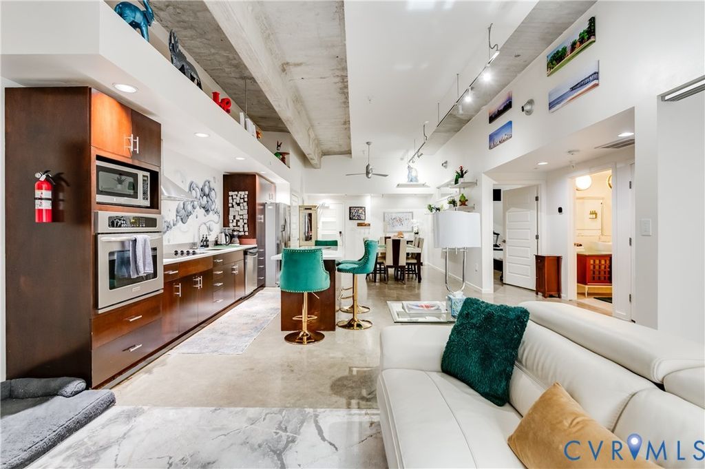 Experience urban living at its best in this industrial-chic condo located in the heart of Richmond's historic Jackson Ward neighborhood. This open concept 2-bedroom, 1.5-bath unit features polished concrete floors, 11+ ft ceilings, and striking custom wall murals that add one-of-a-kind personality. The kitchen offers wood cabinetry, quartz countertops, and SS appliances. The main bathroom showcases tile floors, a tiled tub/shower, and modern finishes, while the half bath adds convenience for guests. Enjoy assigned additional storage in the basement and the security of coded entry building. Walk to nearby stores, restaurants, coffee shops, and bars "” so many options just steps from your door. New heat pump installed January 2024. Parking spots at 110 E Clay available for rent at $100/month.