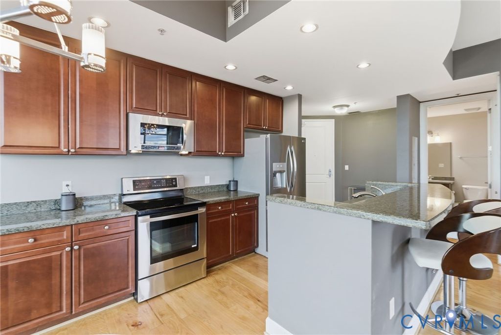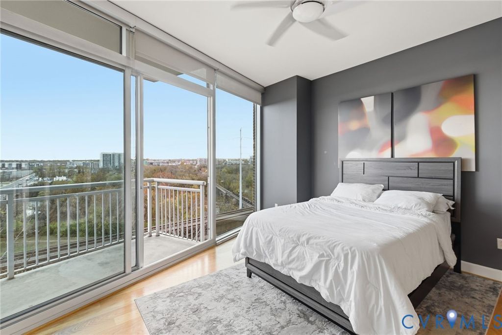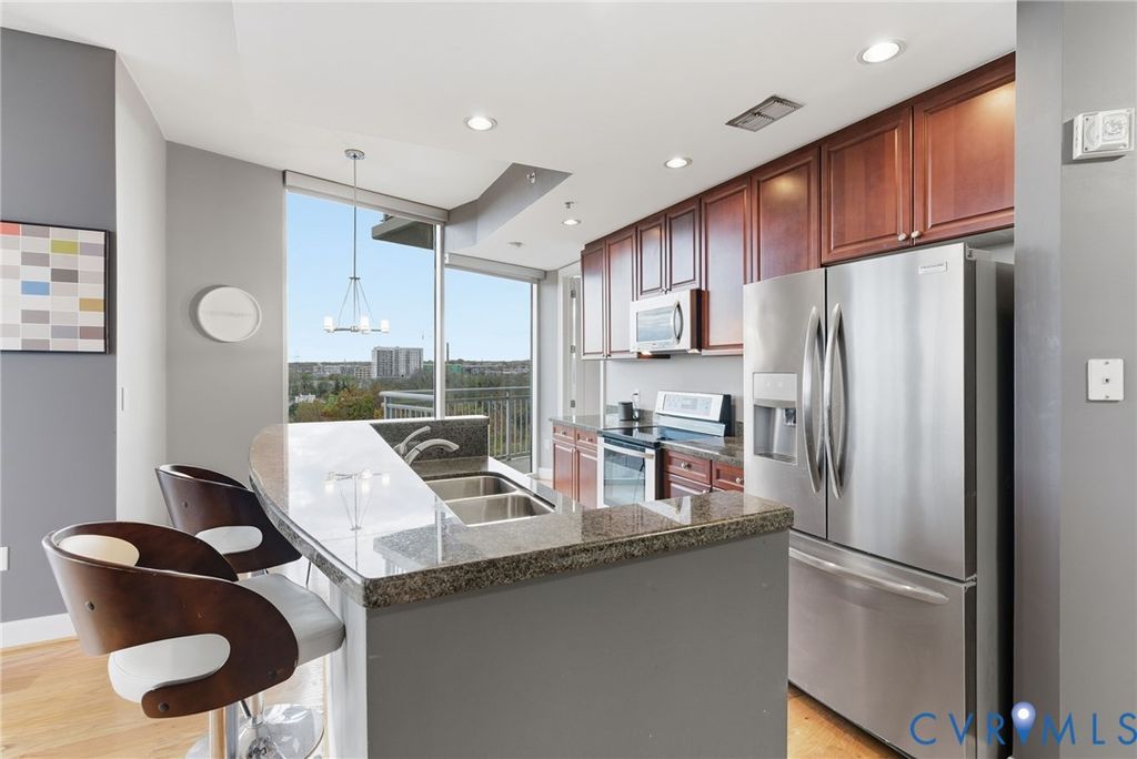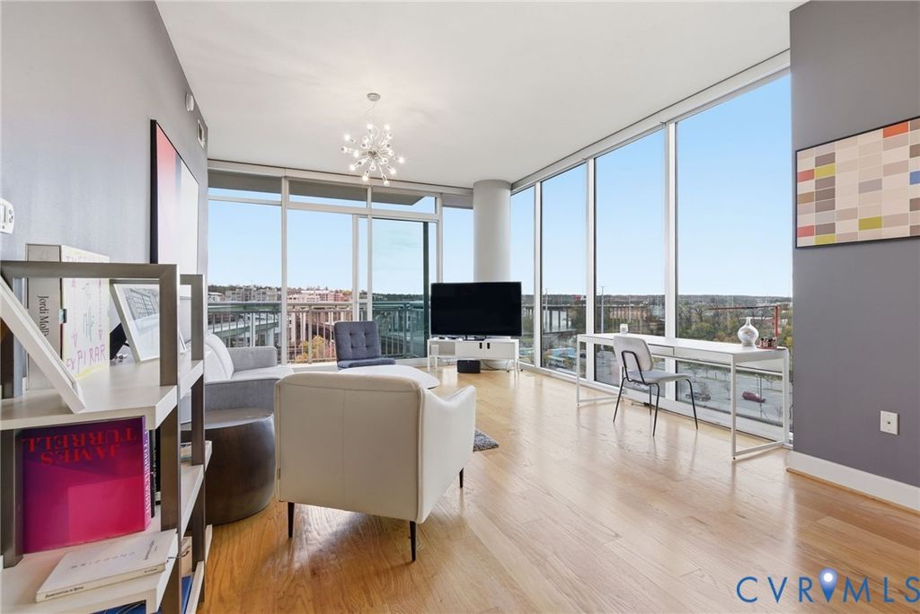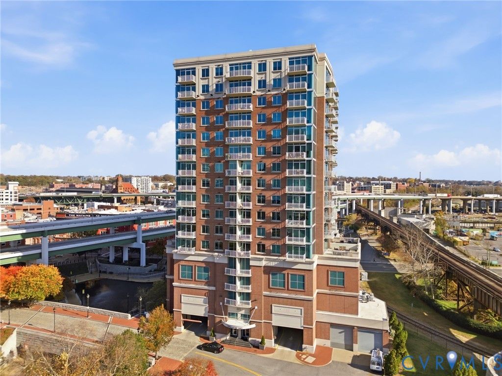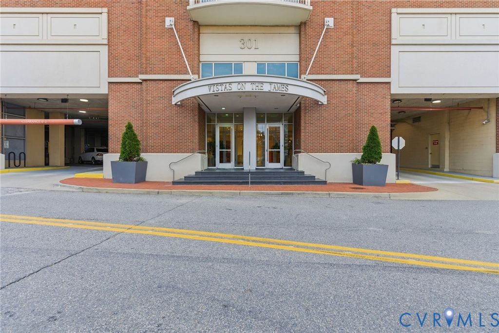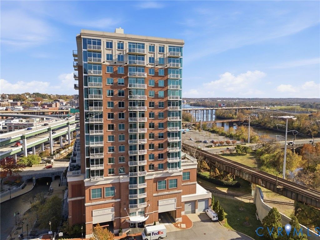 WELCOME TO VISTAS AT JAMES RIVER UNIT 714: The ultimate urban living experience for the discerning professional. This corner 2 BR, 2 BA high-rise on the 7th floor offers breathtaking, panoramic views of the James River & downtown skyline from floor-to-ceiling windows and two private balconies. This is one of the only units featuring floors throughout the main living areas, newly refinished for a luxury feel, complemented by new carpet in the bedrooms. The open floor plan flows seamlessly from the living area to the kitchen, featuring granite counters & SS appliances. The primary suite is a private retreat w/ its own balcony, WIC, & spa-like bath (double vanity, soaking tub, sep shower). Step outside & you're in the heart of RVA's riverfront: walk to top dining, coffee (Blanchard's), the Canal Walk, & Capital Trail access. Commuters will appreciate the quick access to I-95/I-64. The condo fee delivers unmatched value, including 24-hr staffed security, two secured garage pkg spaces, fiber-optic internet, premium cable/streaming TV (HBO Max/Showtime), a state-of-the-art fitness center, & equipped residents' club room. Don't miss this rare corner unit where convenience meets luxury living.
