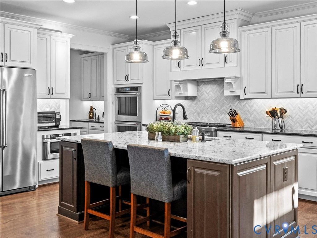 Welcome to this beautiful 4-year-young home in the perfect 55+ community. Here is where upgrades abound and comfort is clear. Upon entering, you will immediately notice the beauty and depth of the bright, open floor plan. The office greets you on the left of the open foyer with wood flooring and generous built-in bookcases which offer plenty of storage - a fantastic use of the space. Wood flooring and 9' ceilings throughout the downstairs living areas create beauty and warmth. Enjoy the welcoming dining room with wainscoting, tray ceiling, and plenty of natural light. You will fall in love with the chef's kitchen, complete with beautiful solid cabinetry, granite countertops, stainless steel double ovens, 6-burner gas cooktop, microwave, and refrigerator. The large island completes the inviting kitchen - perfect for entertaining friends and family. Don't miss the walk-in pantry with solid shelving and the butler's pantry with a sink and granite countertops. The spacious adjacent family room boasts hardwood flooring and a lovely fireplace. Steps away, relax while enjoying your coffee or an evening beverage in the morning room which affords you access to the fenced back yard and patio. The laundry room and powder room are tucked away but easily and readily accessible along with the entry to the large 2-car garage. Retreat to the primary suite which is located on the main level and includes a very spacious walk-in closet and very well-appointed bath designed for ease and relaxation. The large, upgraded shower with a frameless door and separate "his and her" vanities make the primary bath the envy of many . Upstairs you will find a generous landing and 2 additional bedrooms that provide plenty of space for visitors or family. A large finished "rec room" rounds out the 2nd level which is perfect for games, music, exercise, or just hanging out. Set within a vibrant 55+ community, this home is ready to welcome you to a lifestyle of comforting and low-maintenance living.