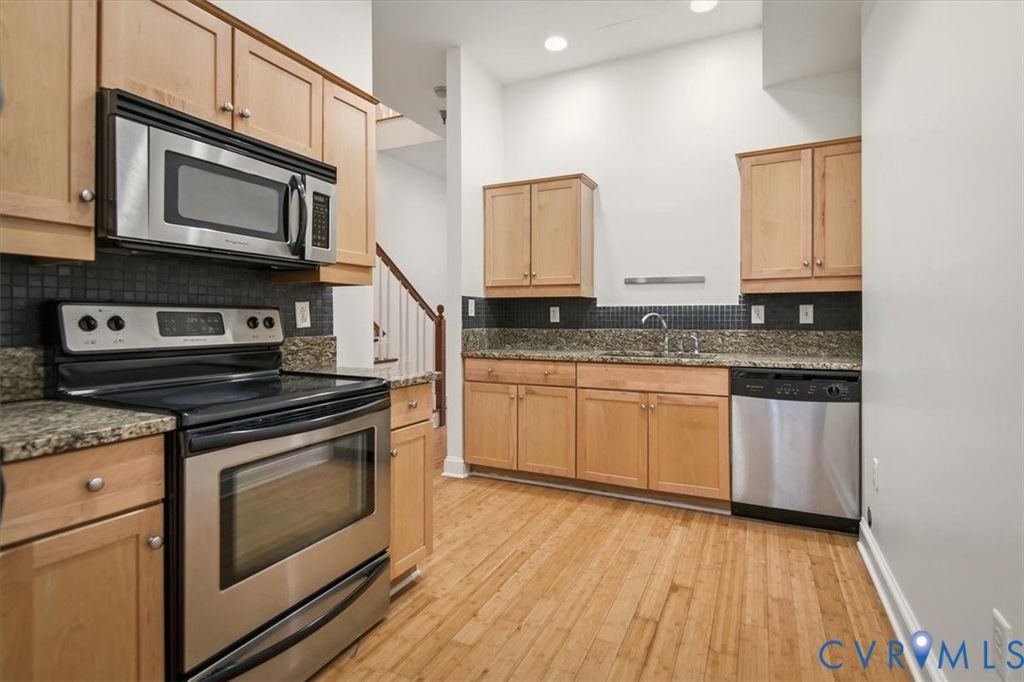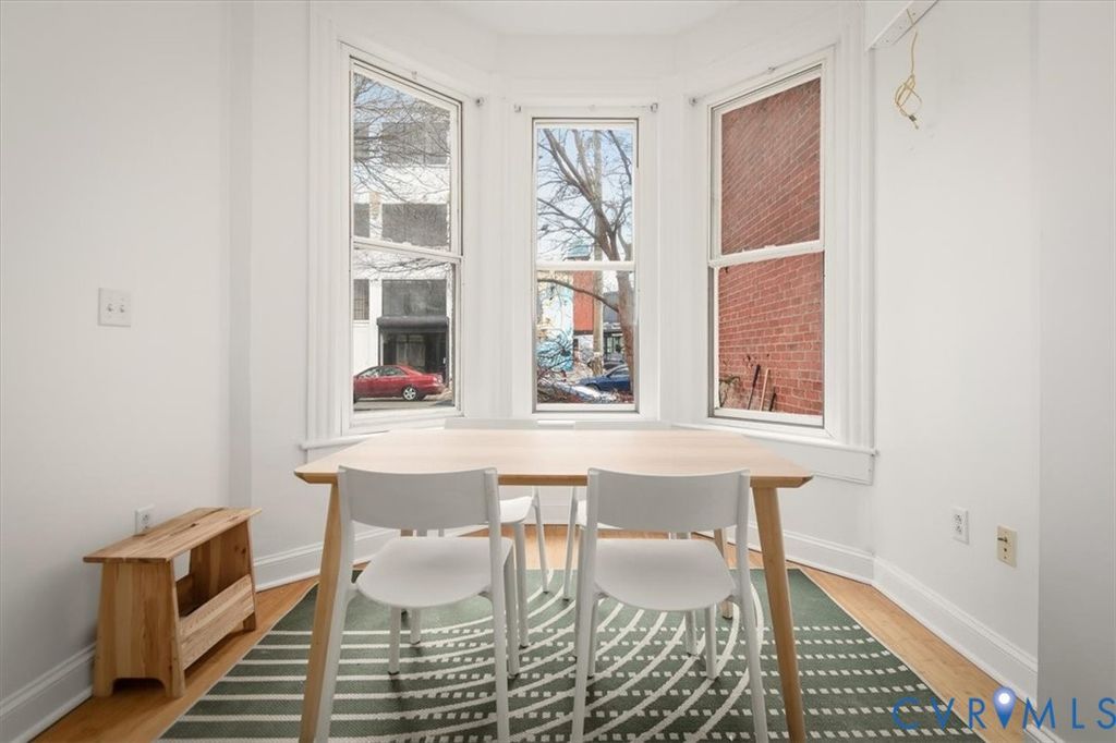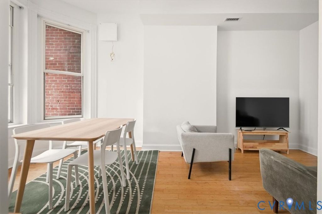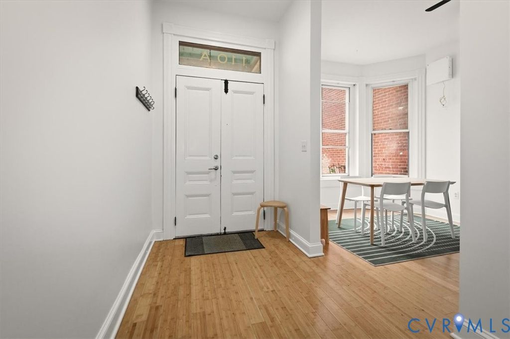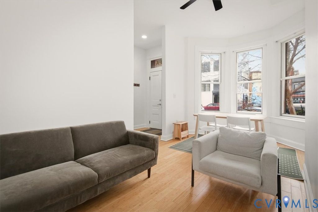 Unique 2-Story renovated Historic Victorian row house condo in Jackson Ward. Enter from the lovely front stoop into the foyer boasting 10 ft ceilings & bamboo floors throughout the first floor. The Southern exposed light filled living room features a bay window & is connected to the kitchen by a pass through window. Maple cabinets, granite counters, tile backsplash & stainless appliances are a few features found in the renovated kitchen. A half bathroom & laundry area complete the first floor. Ascend the hardwood staircase to the 2nd floor illuminated by natural sunlight from two skylights. Continue to the primary bedroom highlighted by a bay window & large walk in closet. The 2nd bedroom includes ample closet & the full bathroom is shared by the two rooms. Enjoy amenities of Marshall Street Condos, including the fitness center, roof deck, courtyard & reserved compact parking in gated garage. Also, water, sewer & trash collection are included. This beautiful home is located amidst art galleries, award winning restaurants & of course the National Historic Landmark District booming with architectural appeal!