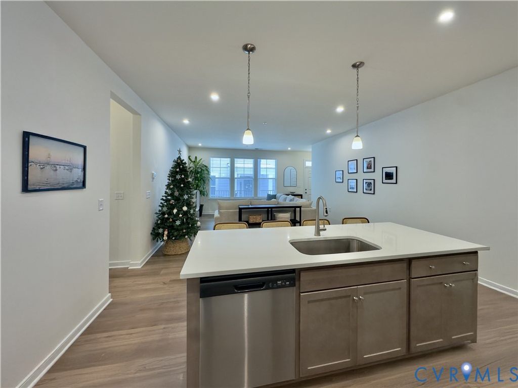 Welcome home to this beautifully maintained Lincoln model, by HH Hunt Homes, offering the comfort of like-new construction without the wait. Completed in early spring 2025, and gently lived in for only a few months, this first-floor end unit condo blends modern design with everyday convenience. Step inside to an inviting open-concept living, dining, and kitchen area, highlighted by 9-foot ceilings that enhance the natural light, and make the space easy to move through. The kitchen offers direct access to the attached one-car garage, creating a seamless transition when bringing in groceries or unloading the car. A generous kitchen island, stylish countertops, and a beautifully crafted backsplash create a stunning focal point, while the spacious pantry and abundant cabinetry make cooking and storage effortless. The spacious covered front porch provides a cozy place to enjoy fresh air while staying protected from the elements. Inside, the private bedroom layout features two comfortable bedrooms and two full baths. The primary suite stands out with abundant natural light, a generous walk-in closet, and a well-appointed bathroom featuring a double vanity and walk-in shower. Built on a slab foundation with no interior stairs, this home offers an appealing layout for anyone seeking ease of access and low-maintenance living. Nightly doorstep trash collection adds to the convenience. With new construction units still months from completion, this highly desirable model is move-in ready and shows beautifully throughout. A wonderful opportunity to enjoy contemporary finishes, thoughtful design, and a location that continues to grow in demand.