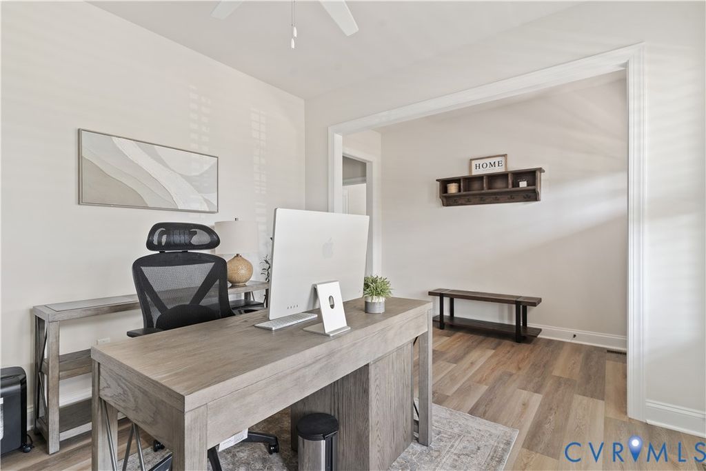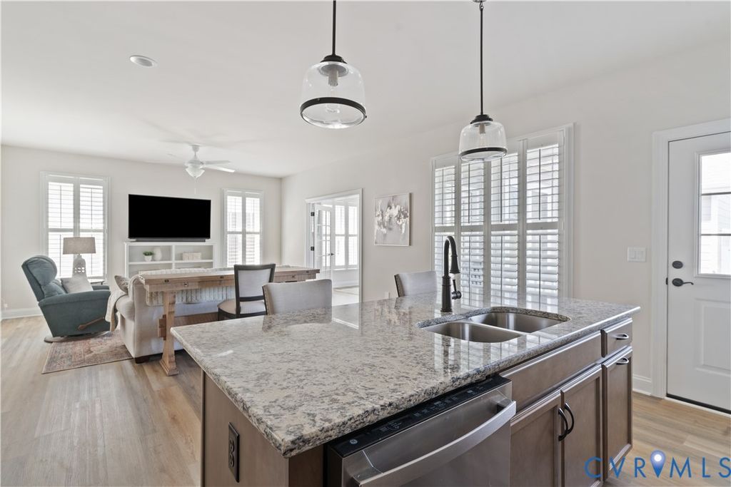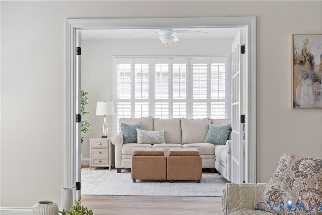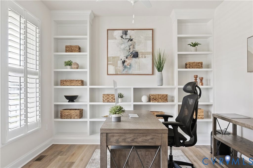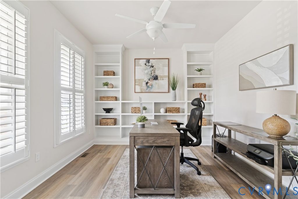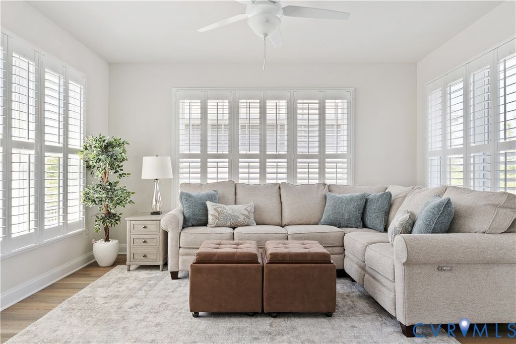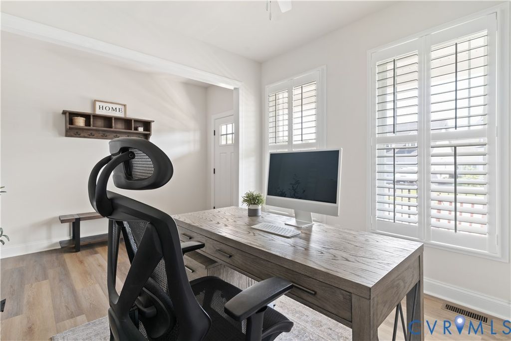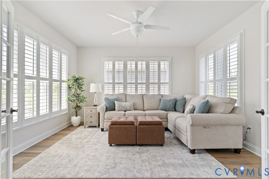Welcome to this beautifully maintained single-story ranch, ideal for anyone seeking easy single-floor living or looking to downsize without compromise. Located in Lauradell, a desirable low-maintenance community where lawn care is included, this home lets you spend more time enjoying life and less time on upkeep. Inside, you'll love the bright, sun-filled interior, enhanced by plantation shutters on every window. Luxury vinyl plank flooring flows through the main living areas, while plush carpeting adds comfort in the bedrooms. The spacious Florida room opens to a delightful screened-in porch, accessible from both the kitchen and Florida room"”perfect for relaxing, entertaining, or enjoying peaceful mornings. The kitchen features granite countertops, a smooth-top range, vented microwave, dishwasher, and newer stainless steel appliances. A separate laundry closet houses the washer and dryer, keeping noise and clutter out of the main living space. Just off the kitchen, the family room offers built-in shelving and a ceiling fan, creating a warm and functional gathering area. The primary suite includes a walk-in closet and an ensuite bath with double sinks and a shower stall with grab bars. Additional bedrooms feature ceiling fans, and the front office includes custom built-ins, ideal for working from home or flexible living needs. The second full bath is thoughtfully designed with grab bars and a built-in shower seat. Outside, a fenced area between the screened porch and detached two-car garage provides a secure space for pets. The garage offers pull-down attic stairs for extra storage, while the encapsulated crawlspace adds energy efficiency and peace of mind. This Lauradell home blends comfort, functionality, and low-maintenance living"”perfect for those seeking single-level ease in a welcoming community.