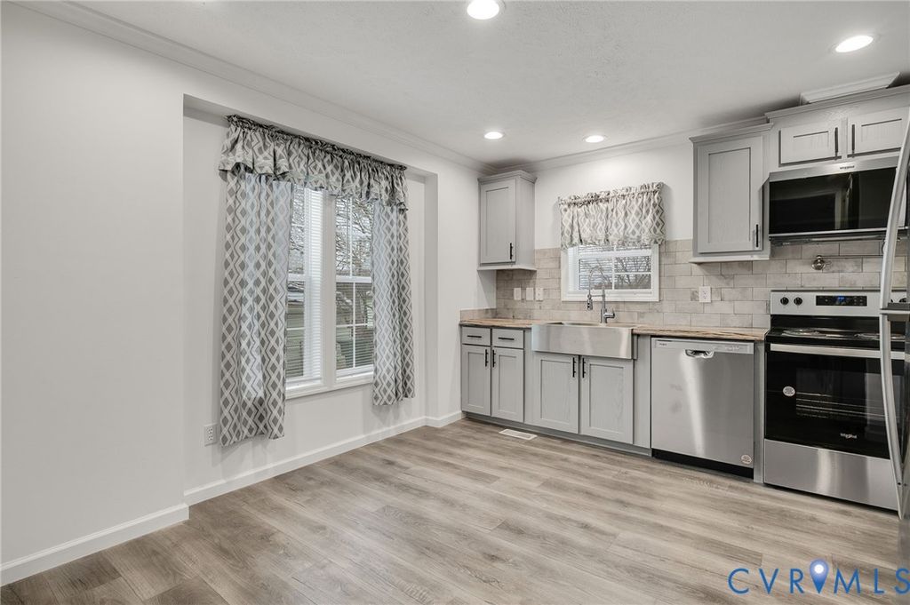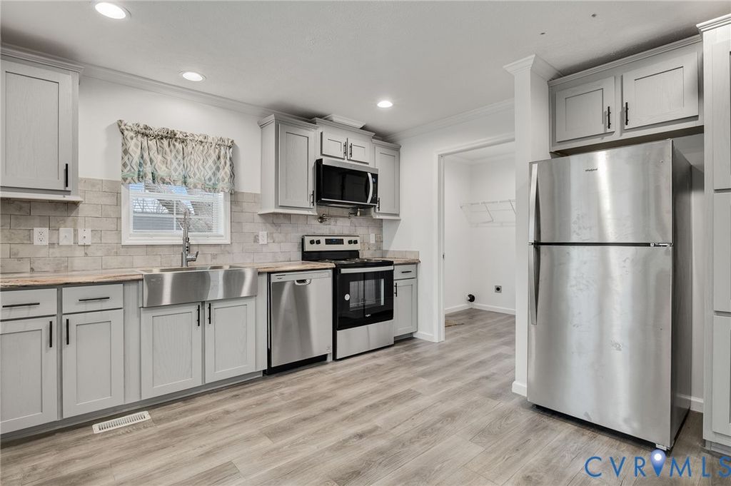 Welcome to this beautiful brand-new construction single-story home offering the perfect blend of charm and modern convenience. Featuring a spacious open layout, this home includes a stylish kitchen with stainless steel appliances, a farmhouse sink, and sleek subway tile backsplash. The light gray cabinetry and wood-look countertops create a warm, contemporary feel, complemented by recessed lighting and durable laminate flooring and carpet throughout. Additional features include a full suite of appliances refrigerator, stove, microwave, dishwasher, washer, and dryer all included. Whether you are a first-time buyer or looking to downsize, this home offers comfort, style, and value in one turnkey package.