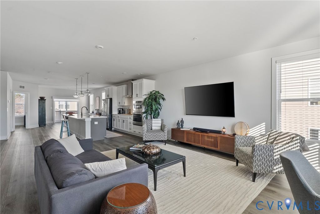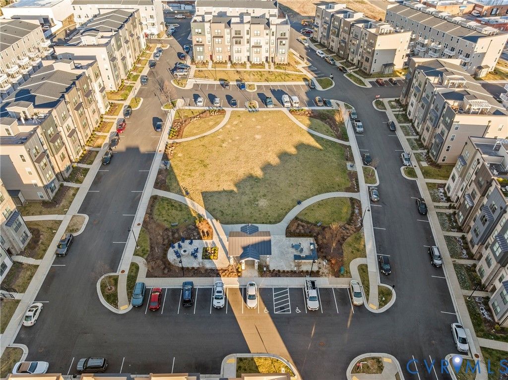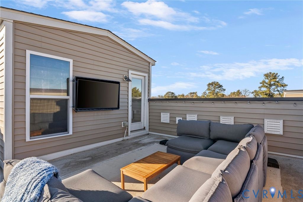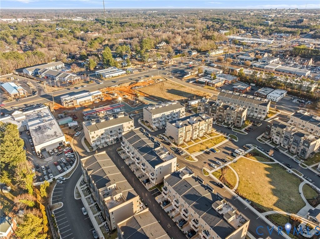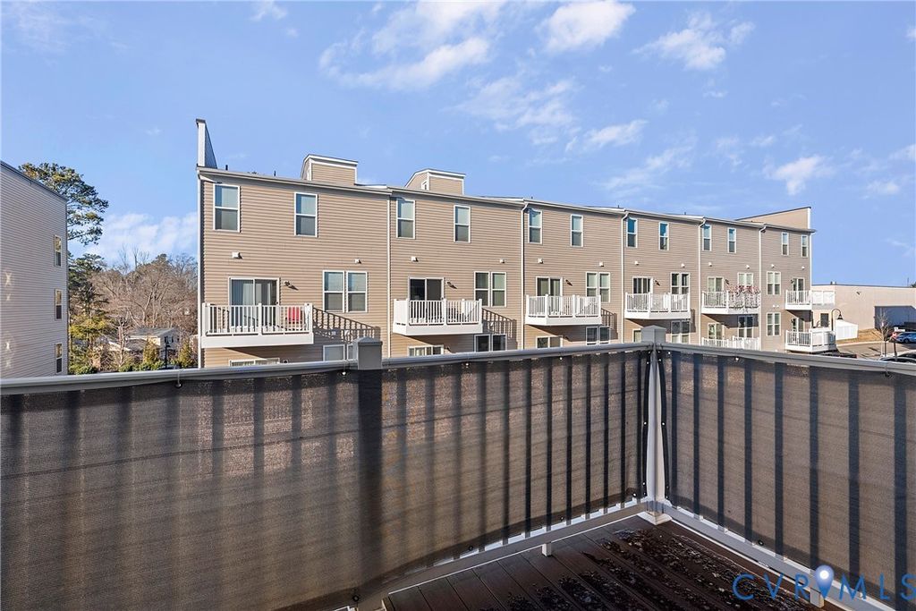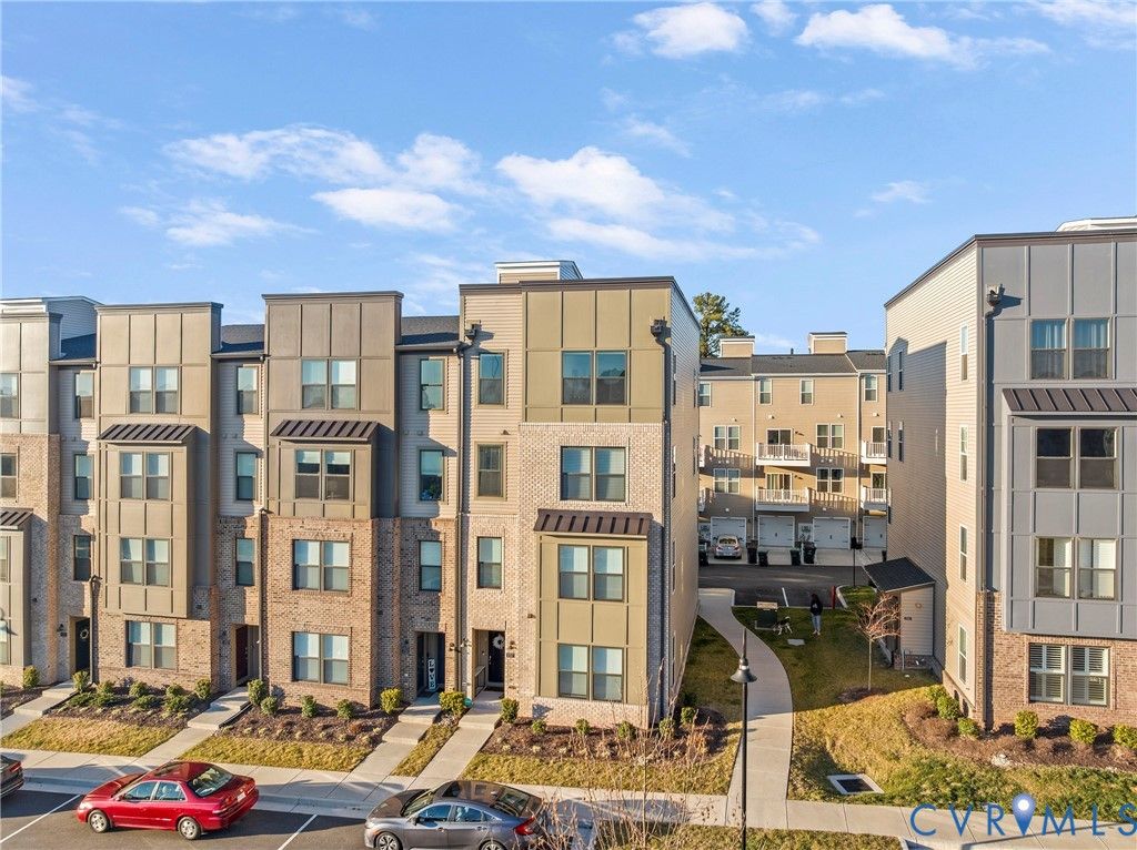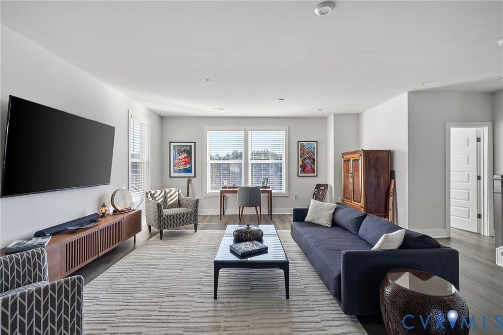 Welcome to this bright top-floor, end-unit home in West Broad Village offering 3 bedrooms, a dedicated office/gym, 2.5 baths, 2,450+ sq ft, a 1-car garage, and a private rooftop deck. Enjoy an unbeatable location walking distance to restaurants (incl Starbucks!), grocery/markets, & minutes from I-64, Shops at Libbie, and recently announced Trader Joe's (2028). Inside, the open-concept main level is filled with natural light; featuring LVP flooring, recessed lighting, and thoughtful upgrades throughout - including an EV charger, smart lock, ring doorbell, motion sensing entry lights, 2" faux wood blinds in living areas, and blackout shades in all bedrooms. The spacious den with bay window, perfectly sized for a sectional & loveseat, flows seamlessly into the kitchen and dining area - perfect for everyday living and entertaining. The kitchen is a standout with quartz countertops, tile backsplash, stainless steel appliances, a vented hood, a built-in microwave, built-in pull-out shelves in bottom cabinets, a 6' x 5' walk-in pantry, and a 12' island with seating overhang. The dining area opens to a balcony ideal for morning coffee, and a dedicated office sits just off the main living space for work-from-home flexibility. Upstairs, the master suite offers plush carpeting, ceiling fan, and a massive 7' x 16' WIC with custom built-ins. The en-suite bath features tile flooring, double vanities with granite countertops, a walk-in tile shower with semi-frameless glass, and a private water closet. Two nicely sized additional bedrooms (both with ceiling fans, one with WIC), spacious hall bath with double granite vanity & tiled tub/shower, and second floor laundry with flexible removable built-in storage shelves complete the level. The community space features gas grills & fire pit and a planned fenced-in dog park. Top it all off with a huge private rooftop deck - a fantastic entertaining space with sunset views and a built-in outdoor, weather-protected TV that conveys. Come see this one in person-you won't want to miss it!