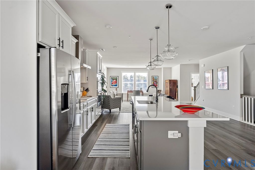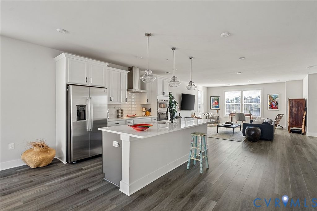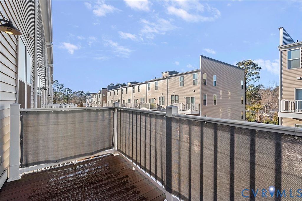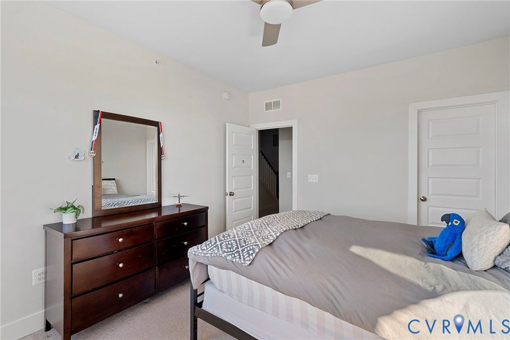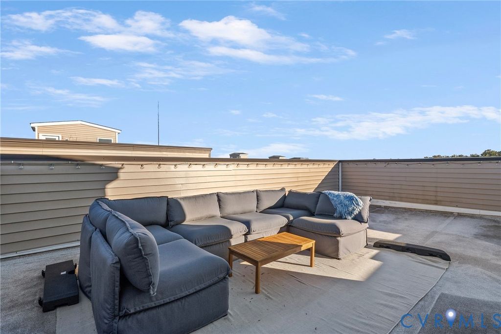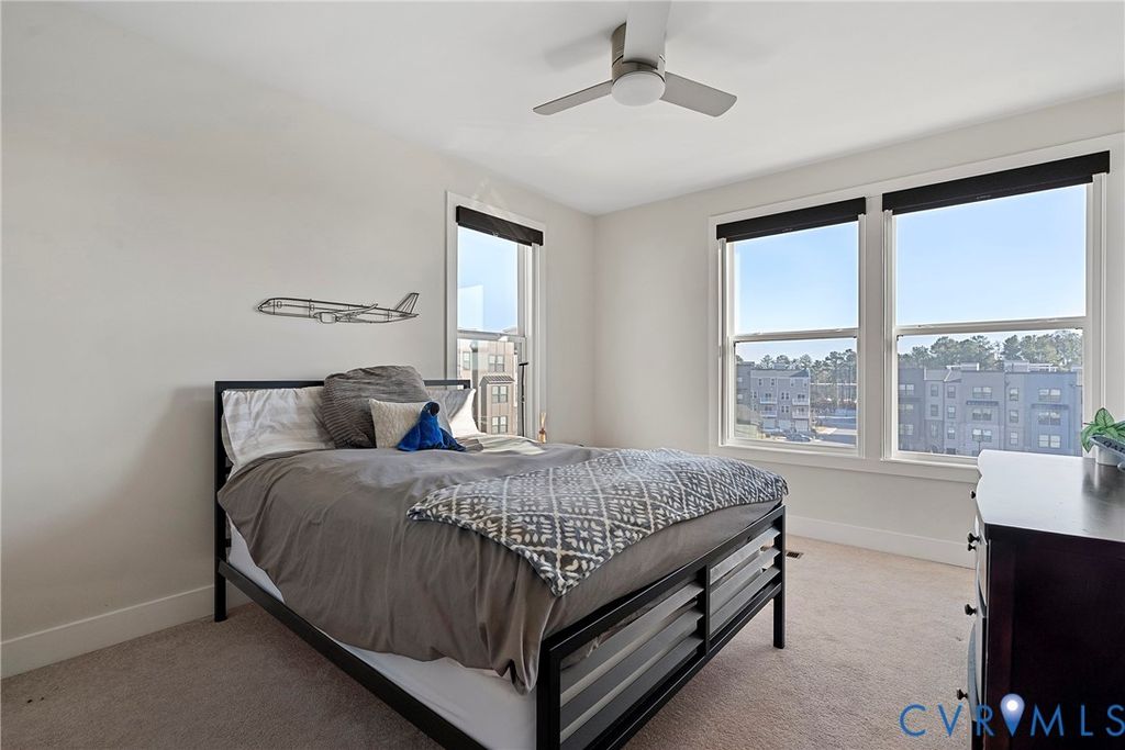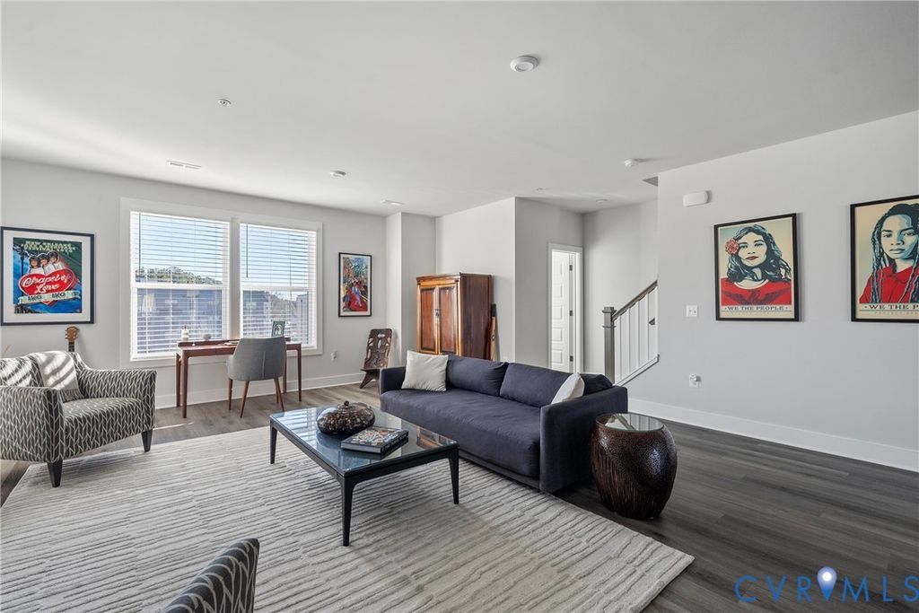 Welcome to this bright top-floor, end-unit home in West Broad Village offering 3 bedrooms, a dedicated office/gym, 2.5 baths, 2,450+ sq ft, a 1-car garage, and a private rooftop deck. Enjoy an unbeatable location walking distance to restaurants (incl Starbucks!), grocery/markets, & minutes from I-64, Shops at Libbie, and recently announced Trader Joe's (2028). Inside, the open-concept main level is filled with natural light; featuring LVP flooring, recessed lighting, and thoughtful upgrades throughout - including an EV charger, smart lock, ring doorbell, motion sensing entry lights, 2" faux wood blinds in living areas, and blackout shades in all bedrooms. The spacious den with bay window, perfectly sized for a sectional & loveseat, flows seamlessly into the kitchen and dining area - perfect for everyday living and entertaining. The kitchen is a standout with quartz countertops, tile backsplash, stainless steel appliances, a vented hood, a built-in microwave, built-in pull-out shelves in bottom cabinets, a 6' x 5' walk-in pantry, and a 12' island with seating overhang. The dining area opens to a balcony ideal for morning coffee, and a dedicated office sits just off the main living space for work-from-home flexibility. Upstairs, the master suite offers plush carpeting, ceiling fan, and a massive 7' x 16' WIC with custom built-ins. The en-suite bath features tile flooring, double vanities with granite countertops, a walk-in tile shower with semi-frameless glass, and a private water closet. Two nicely sized additional bedrooms (both with ceiling fans, one with WIC), spacious hall bath with double granite vanity & tiled tub/shower, and second floor laundry with flexible removable built-in storage shelves complete the level. The community space features gas grills & fire pit and a planned fenced-in dog park. Top it all off with a huge private rooftop deck - a fantastic entertaining space with sunset views and a built-in outdoor, weather-protected TV that conveys. Come see this one in person-you won't want to miss it!