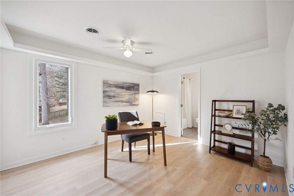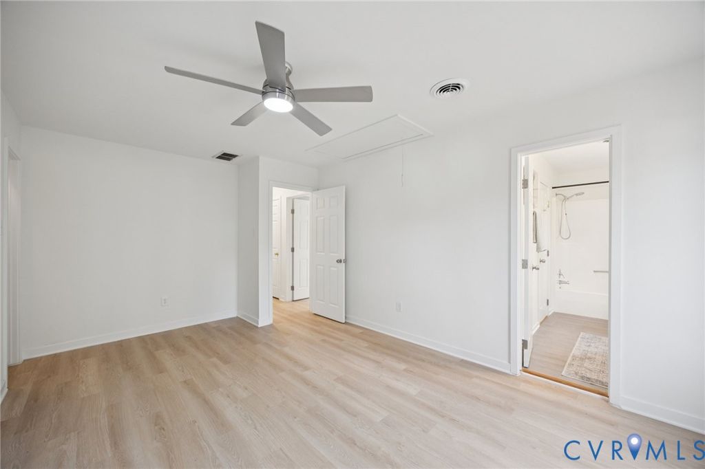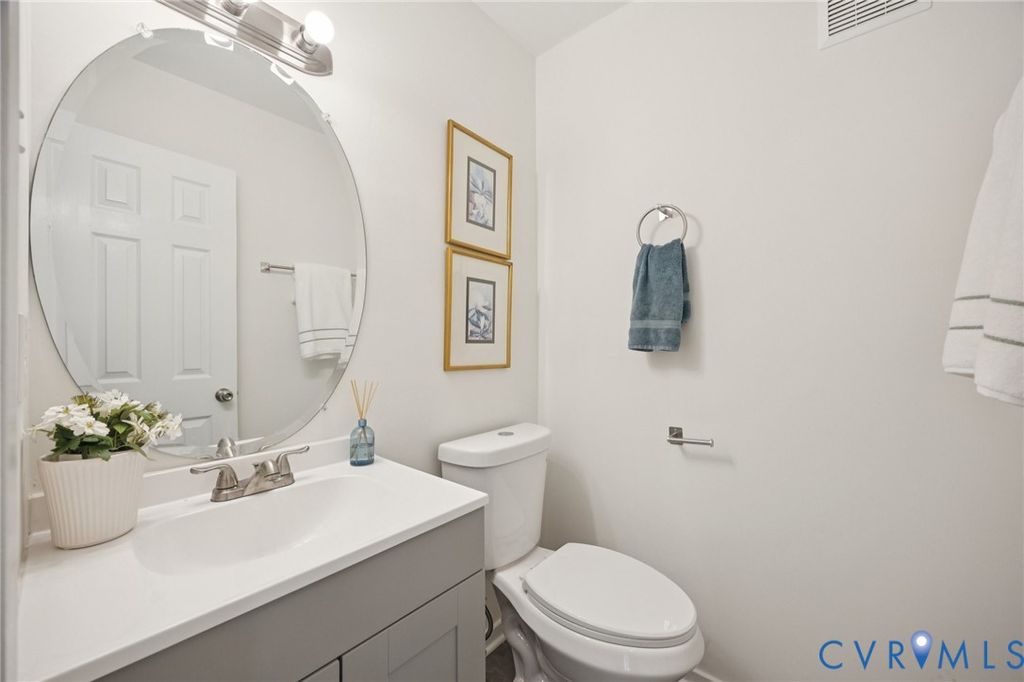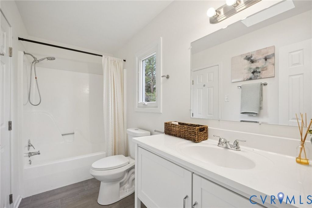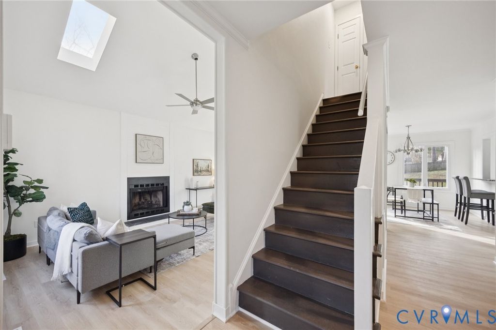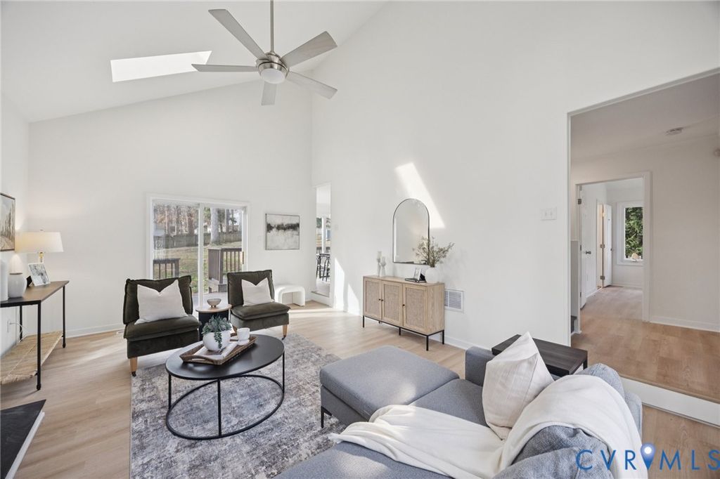 Mid-century charm meets modern luxury in this meticulously renovated North Chesterfield gem! Step inside to discover an airy, open-concept layout defined by soaring vaulted ceilings and multiple skylights that bathe the home in natural light. The heart of the living space features a cozy wood-burning fireplace, perfect for chilly evenings. Culinary enthusiasts will adore the refreshed kitchen, boasting freshly painted white cabinetry, sleek granite countertops, a built-in wall oven, and a dedicated countertop range. The entire home is finished with durable, brand-new LVP flooring and a crisp, neutral paint palette that complements any décor. Convenience is key with a desirable first-floor primary suite, complete with a private, fully updated ensuite bathroom. Upstairs, additional bedrooms offer flexible space for guests or a home office. Outdoor living is a dream here; a sprawling rear deck spans the entire back of the house, providing the ultimate stage for summer barbecues or morning coffee. The large, fully fenced backyard offers a secure oasis for pets, play, or gardening. Located in a quiet, established neighborhood, you are just minutes away from the shops and restaurants at Chesterfield Towne Center, as well as easy access to Midlothian Turnpike and Powhite Parkway for a quick commute to downtown Richmond. Nearby parks and recreational facilities provide endless opportunities for weekend adventures. Come experience the perfect blend of style and comfort, schedule your private tour today!