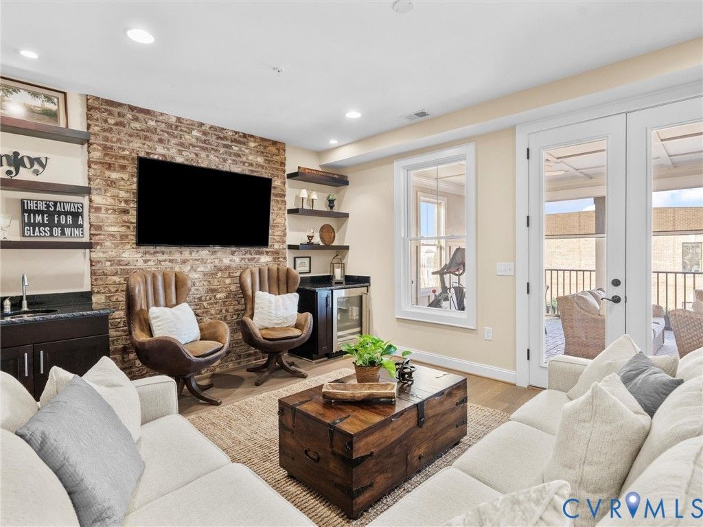 Welcome to this stunning, extensively upgraded townhome offering 3 bedrooms and 3.5 baths, each bedroom featuring its own ensuite full bath. Designed for effortless living, this home includes a private elevator servicing ALL floors and a street-level entrance, providing both convenience and accessibility. The main living level showcases top-of-the-line hardwood flooring, 10-foot ceilings, and beautiful craftsman trim. The sizable dining room includes a tray ceiling accented with reclaimed wood and a beautiful bay window, providing tons of natural light. The chef's kitchen is a true centerpiece and is outfitted with a Wolf Dual Fuel range, Sub-Zero refrigerator, and Sub-Zero wine cooler - premium finishes that elevate everyday cooking. You will fall in love! The adjacent family room is great for entertaining and includes eye-catching reclaimed wood beams, a work nook, and access to the spacious deck. Ascend the wide, open stairwell to find a large Primary Suite, complete with a massive walk-in closet; roomy bathroom; extra-large shower; private water closet; and adjoining laundry room. The must-see top level affords you exceptional entertaining space including a media room with bar and beverage center which opens to a covered terrace adorned with a fireplace and an electronic privacy screen - perfect for outdoor dining. Lower the screen and turn on the fireplace in the winter for cozy entertaining! Open the media room French doors to create a large indoor/outdoor social hub. In addition, a private bedroom features a distinctive exposed brick accent wall, adding architectural character and creating a virtual apartment on the 3rd level. This special townhouse is rounded out in the English basement with a bedroom including a great walk-in closet, ensuite bath, and linen closet. This level also provides a large storage closet and access to the 2-car garage. Every detail of this home reflects quality craftsmanship and thoughtful upgrades, offering an elevated townhome lifestyle with luxury and comfort at every turn.