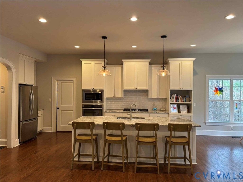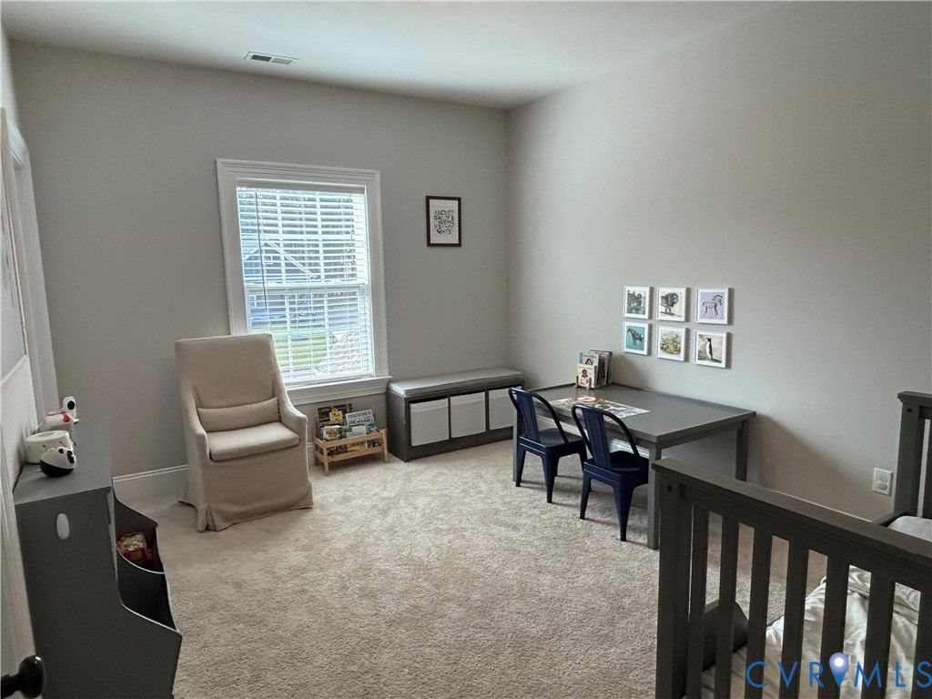 Situated in the beautiful Meadowville Landing neighborhood, this 5 bedroom, 4 bathroom house welcomes you with timeless street appeal. With almost 4,000 square feet of living space, the first floor offers 10 foot ceilings, hardwood floors and an open layout, with a stunning kitchen - quartzite countertops, custom cabinets, and stainless steel appliances (refrigerator, oven, microwave, dishwasher, and warming drawer). A huge walk-in pantry offers endless storage. The kitchen overlooks a morning room, and the living room features a gas fireplace and floor to ceiling built-in bookshelves. French doors lead into a library/office/playroom, which offers additional built-in bookshelves and cabinets for storage. The first floor is made complete with a bedroom, a full bathroom with a walk-in shower, and a large dining room. Two flights of stairs lead up to the second floor where four additional bedrooms are located. The owner's suite offers two large walk-in closets, a balcony, and an en-suite bathroom that includes a gorgeous clawfoot tub, two vanities with marble countertops, and a tiled shower. Two of the remaining bedrooms share a Jack and Jill bathroom with a double vanity and linen closet. The final bedroom has an en-suite bathroom, and access to the owner's suite (designed to be a nursery). The laundry room, office, a second linen closet, and unfinished storage space can also be found on the second floor. A two-car garage offers parking or storage along with an additional storage room connected to the house. Built to ENERGY STAR standards with a conditioned crawlspace, this home delivers comfort, efficiency, and long-term value. The mature landscaping surrounding the property enhances privacy and sets this home apart from newer sections of the neighborhood. Meadowville Landing residents enjoy amenities such as a pier, a pool with a slide and splashpad, a fitness center, sport courts, playgrounds, and walking paths - all just minutes from I-95, I-295, Richmond, and Fort Lee.
