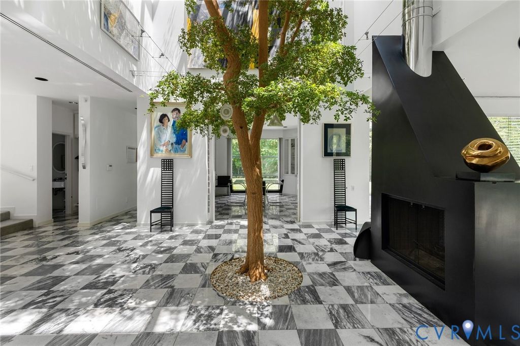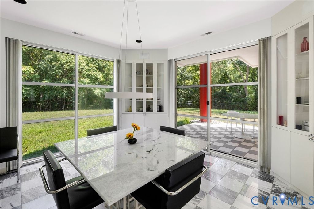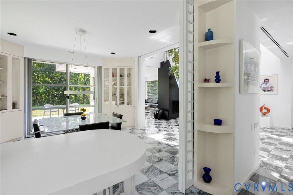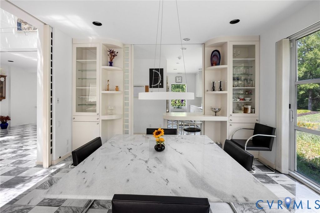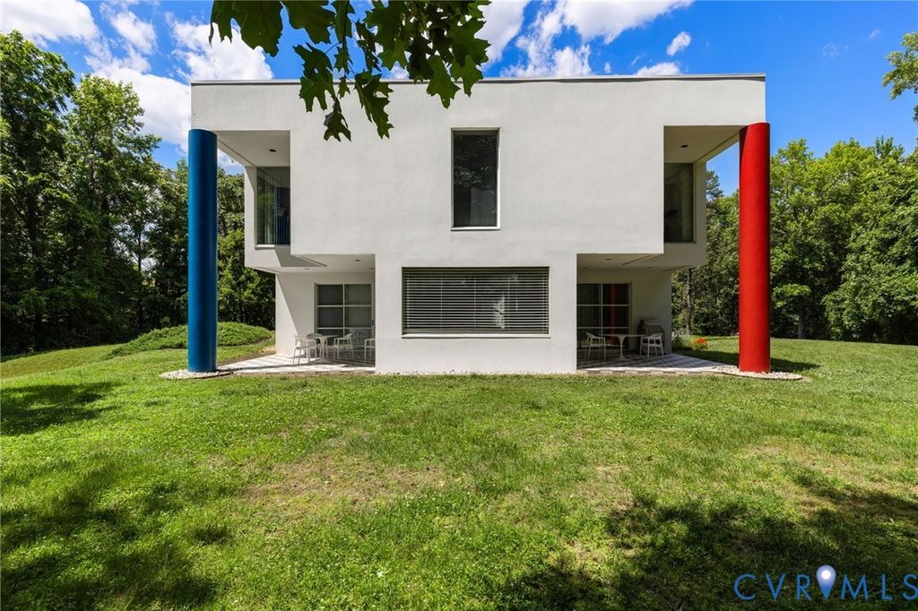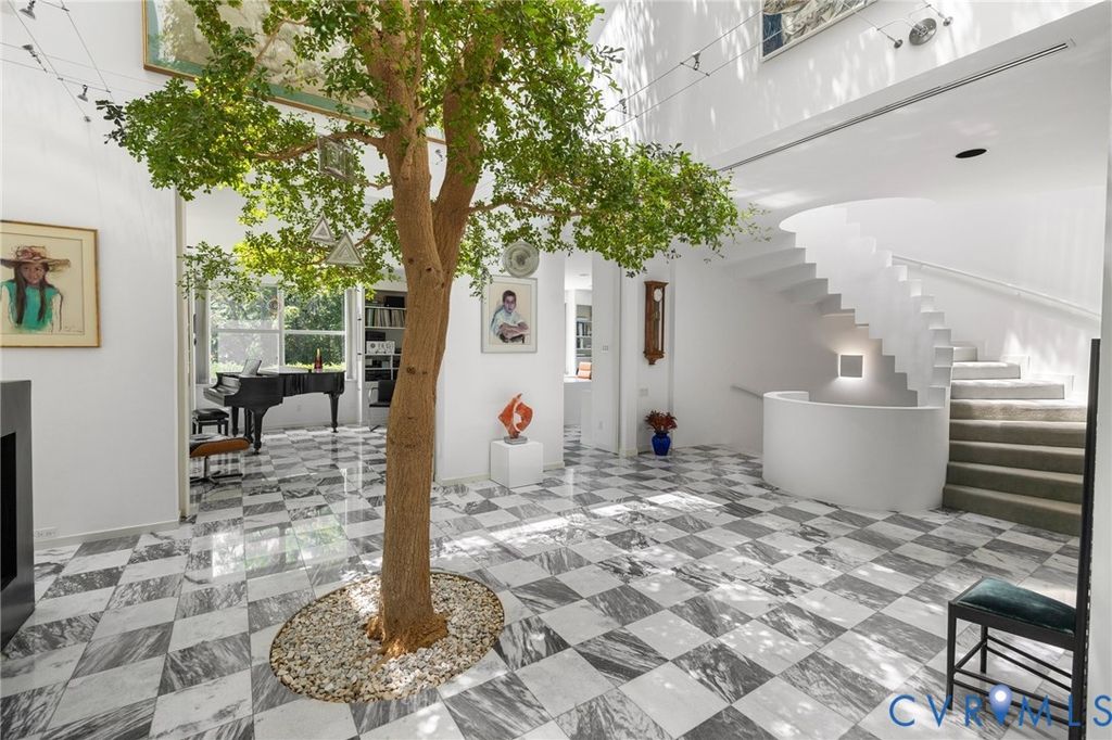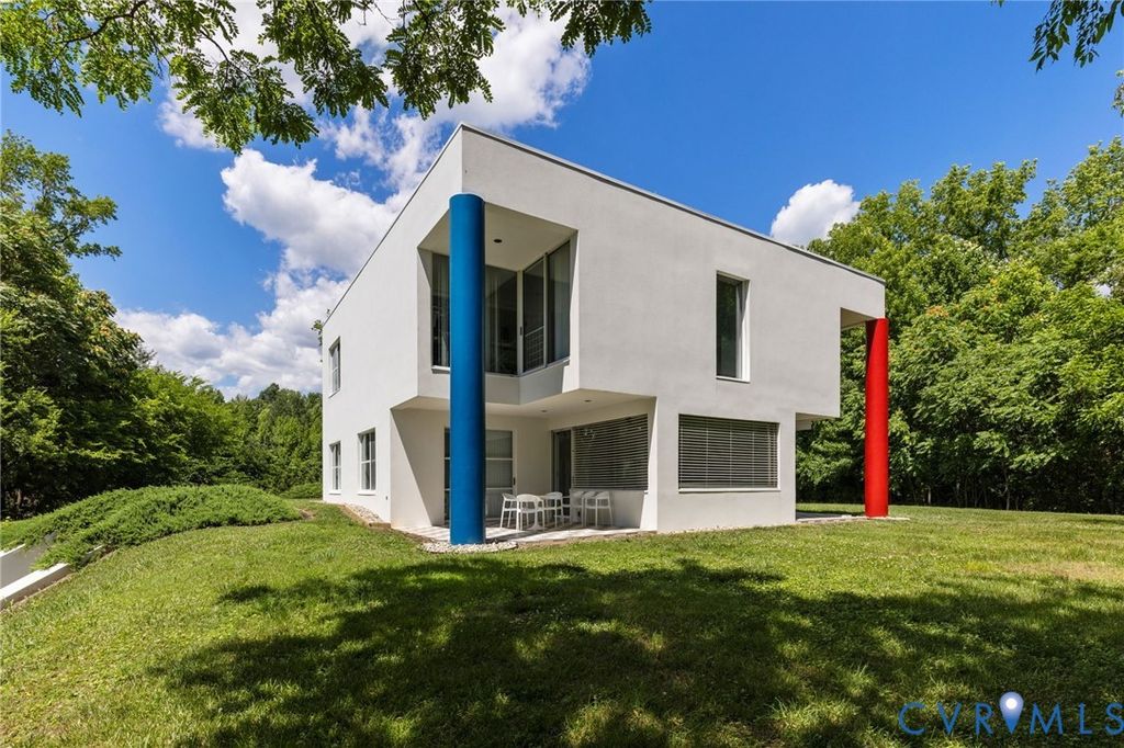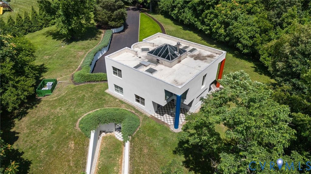 A rare opportunity to own a custom, contemporary-international style home in the coveted Pembroke neighborhood along the River Road corridor awaits. This home features large picture windows in all but two spaces in the home, bathing the interiors in light throughout the day and the night. Built w/ cutting-edge sustainable techniques at the time, the home remains energy-efficient and features a rooftop greenspace above the garage. Upon entering the marbled foyer, discover the first of 5 BRs, complete w/ an ensuite bath, built-in Murphy bed, and sliding glass doors that open to the outdoors, offering flexible use. To the left, the striking spiral staircase, crafted as a single piece of steel and poured concrete, is bathed in natural light from above. On the main level, marbled flooring in a gray & white checkerboard gives a formal finish to the open space. A 2-story sky-lit atrium anchors the 4 living spaces that flow freely into one another. Just beyond the double-sided fireplace, the LR is tucked in a square bay flanked by large windows. The kitchen and DR are stunningly simple and efficiently designed to serve their purposes. A home office w/ custom cabinetry connects seamlessly to a sitting room, also outfitted w/ custom built-in shelving. Glass and wood grid-patterned pocket doors can be utilized to separate the spaces. Following the natural light, the terrace off the dining area faces east, while the terrace off the LR faces west and is perfect for sunset entertaining. Follow the spiral staircase up to find 4 BRs, each w/ an ensuite bath. The primary suite features a wall of mirrored closet doors to reflect the westward facing view. A guest room features a built-in Murphy bed for flexibility to be used as an upstairs den if desired. Set on nearly 4 acres, this property offers unparalleled privacy, while still being part of a vibrant community with views and access to the James River. Don't miss this opportunity to own a truly unique and enduring property that brings intention and functionality together.
