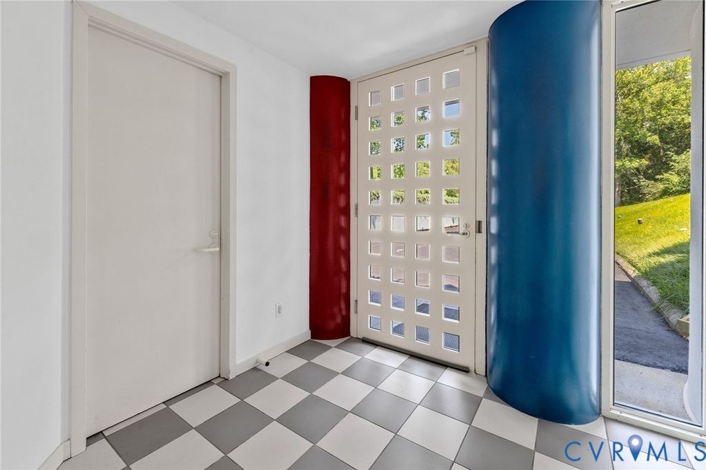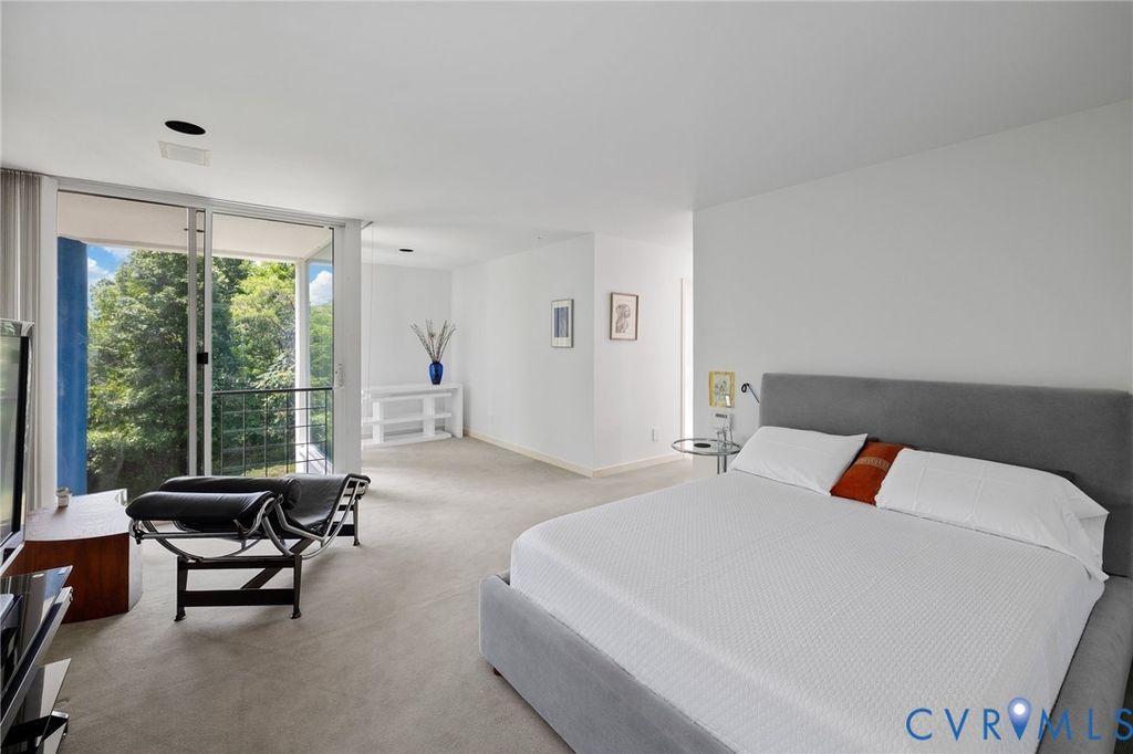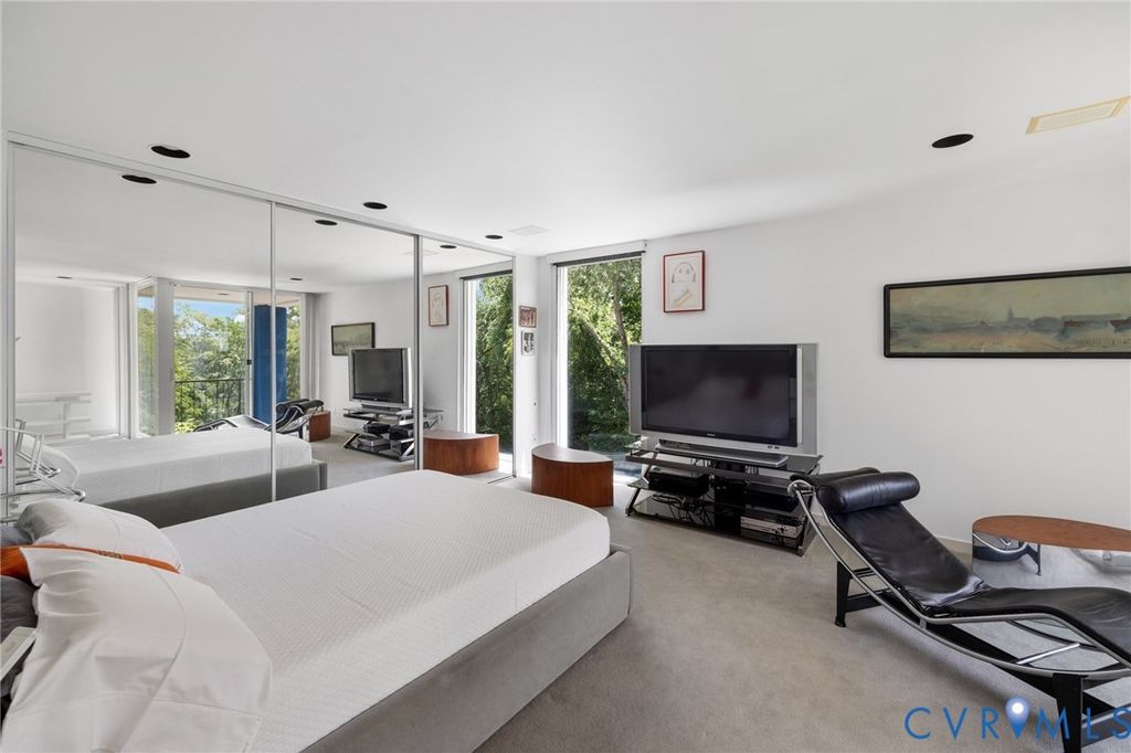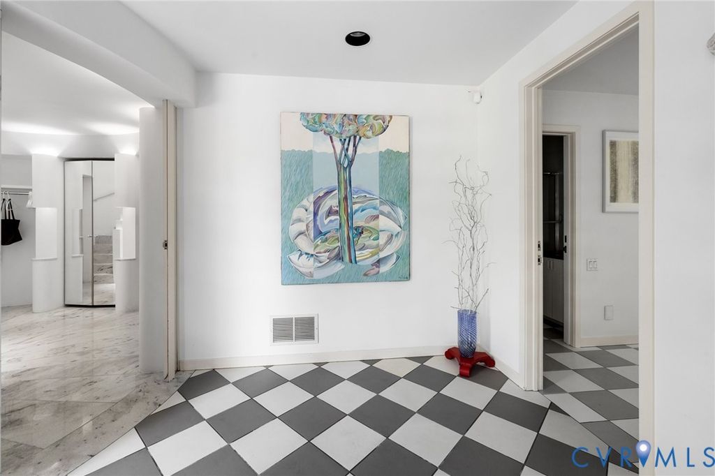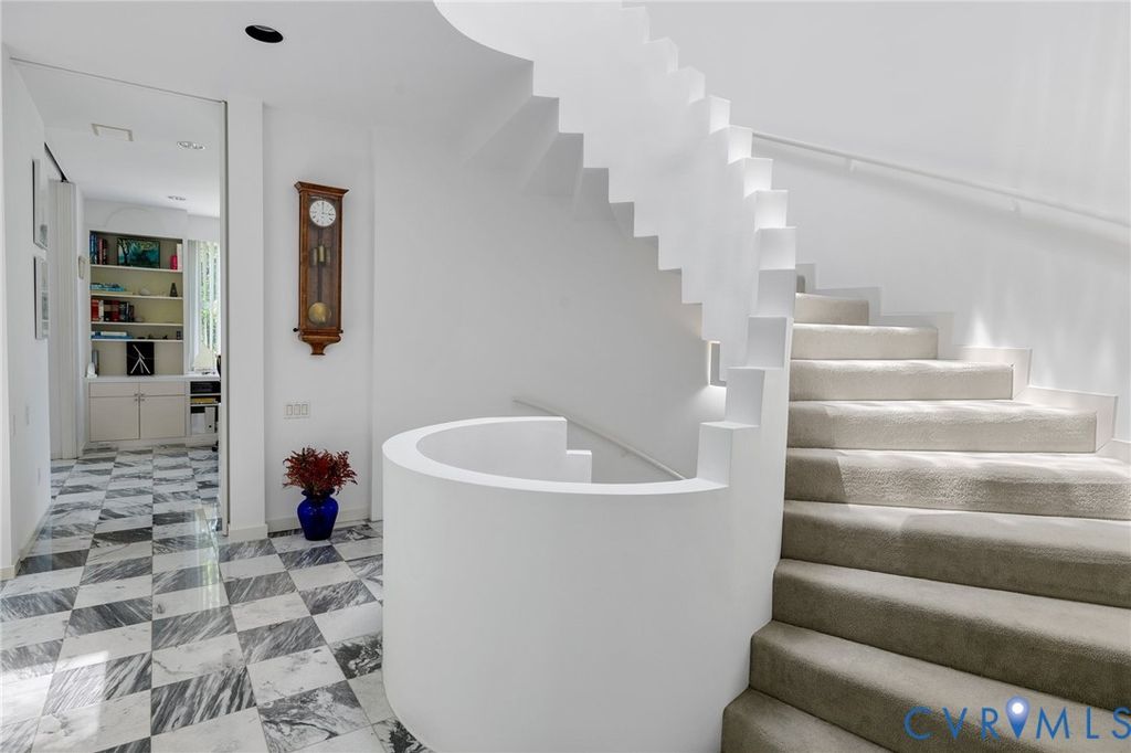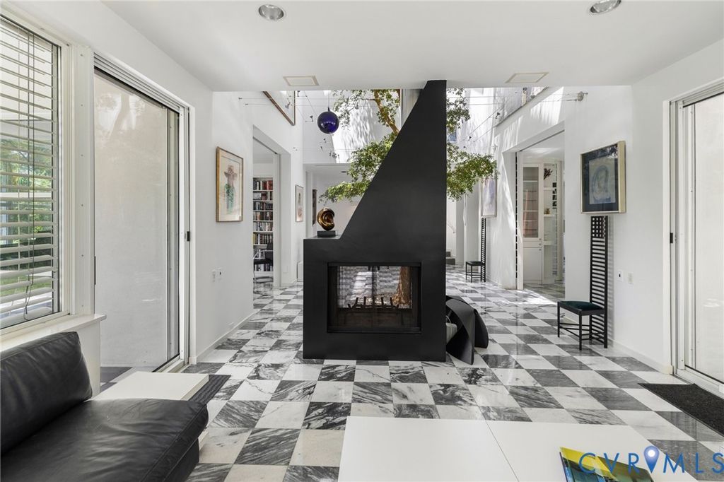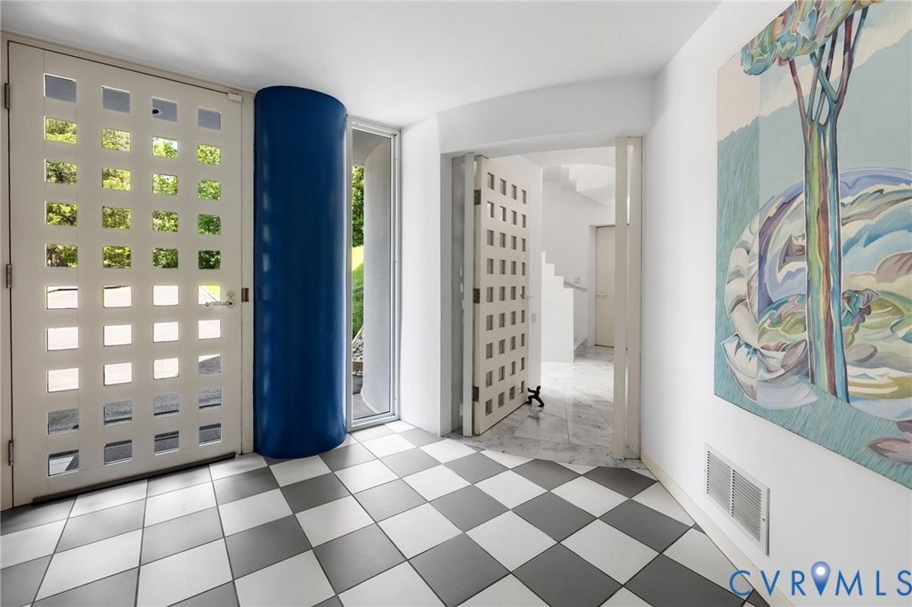 A rare opportunity to own a custom, contemporary-international style home in the coveted Pembroke neighborhood along the River Road corridor awaits. This home features large picture windows in all but two spaces in the home, bathing the interiors in light throughout the day and the night. Built w/ cutting-edge sustainable techniques at the time, the home remains energy-efficient and features a rooftop greenspace above the garage. Upon entering the marbled foyer, discover the first of 5 BRs, complete w/ an ensuite bath, built-in Murphy bed, and sliding glass doors that open to the outdoors, offering flexible use. To the left, the striking spiral staircase, crafted as a single piece of steel and poured concrete, is bathed in natural light from above. On the main level, marbled flooring in a gray & white checkerboard gives a formal finish to the open space. A 2-story sky-lit atrium anchors the 4 living spaces that flow freely into one another. Just beyond the double-sided fireplace, the LR is tucked in a square bay flanked by large windows. The kitchen and DR are stunningly simple and efficiently designed to serve their purposes. A home office w/ custom cabinetry connects seamlessly to a sitting room, also outfitted w/ custom built-in shelving. Glass and wood grid-patterned pocket doors can be utilized to separate the spaces. Following the natural light, the terrace off the dining area faces east, while the terrace off the LR faces west and is perfect for sunset entertaining. Follow the spiral staircase up to find 4 BRs, each w/ an ensuite bath. The primary suite features a wall of mirrored closet doors to reflect the westward facing view. A guest room features a built-in Murphy bed for flexibility to be used as an upstairs den if desired. Set on nearly 4 acres, this property offers unparalleled privacy, while still being part of a vibrant community with views and access to the James River. Don't miss this opportunity to own a truly unique and enduring property that brings intention and functionality together.