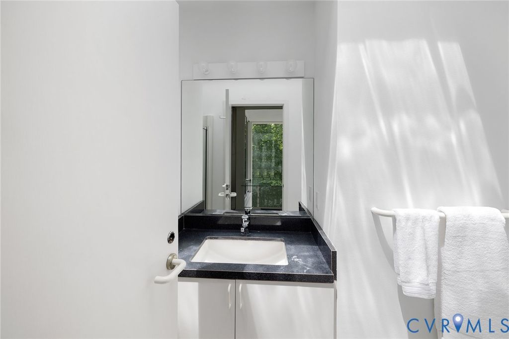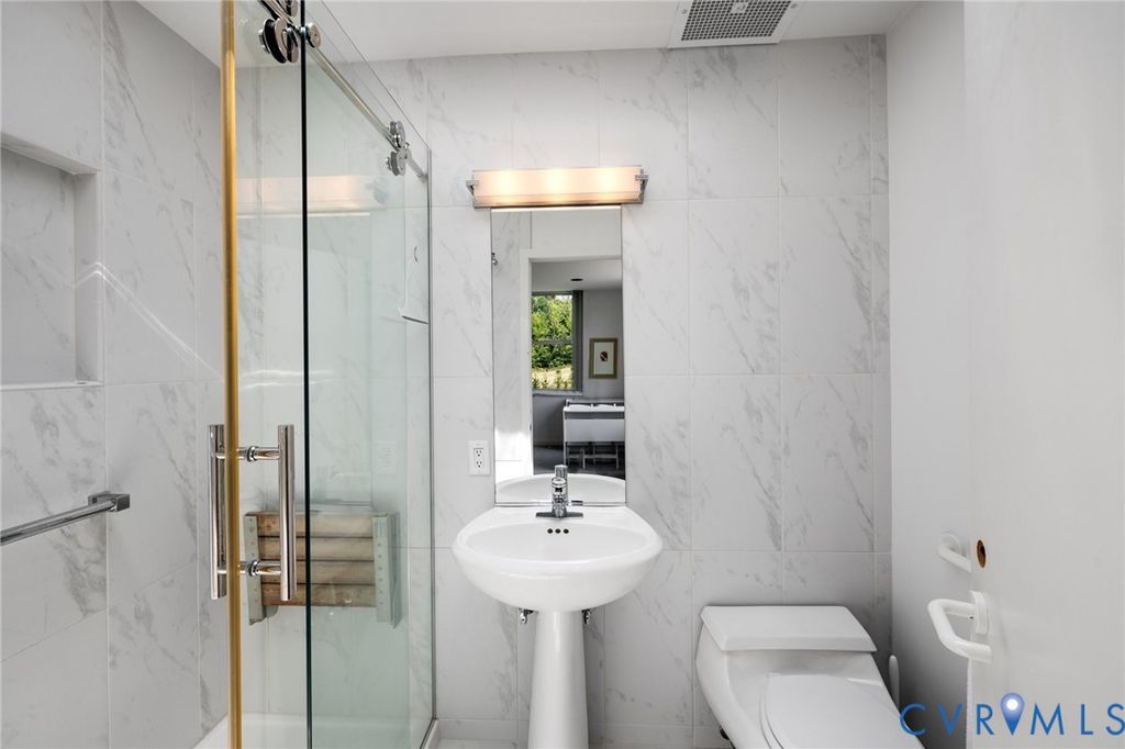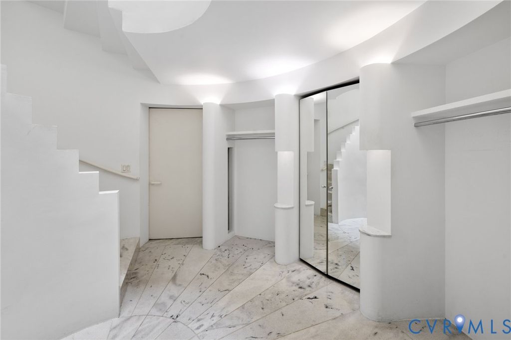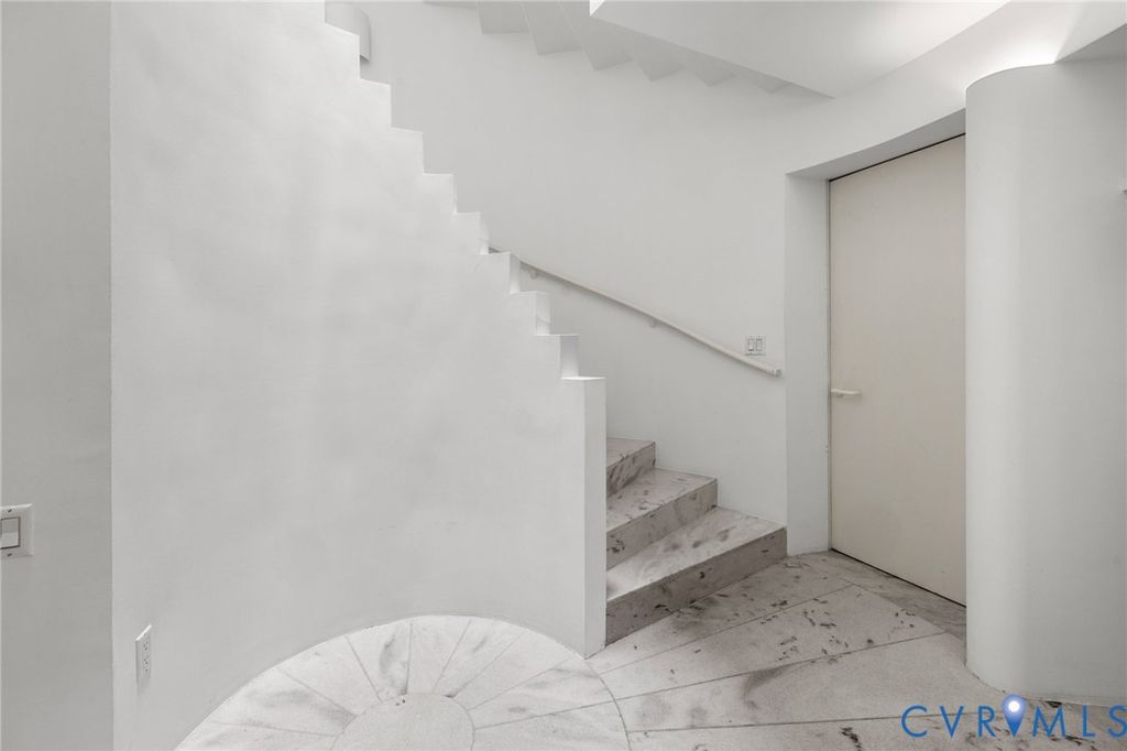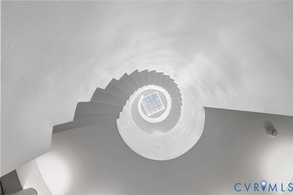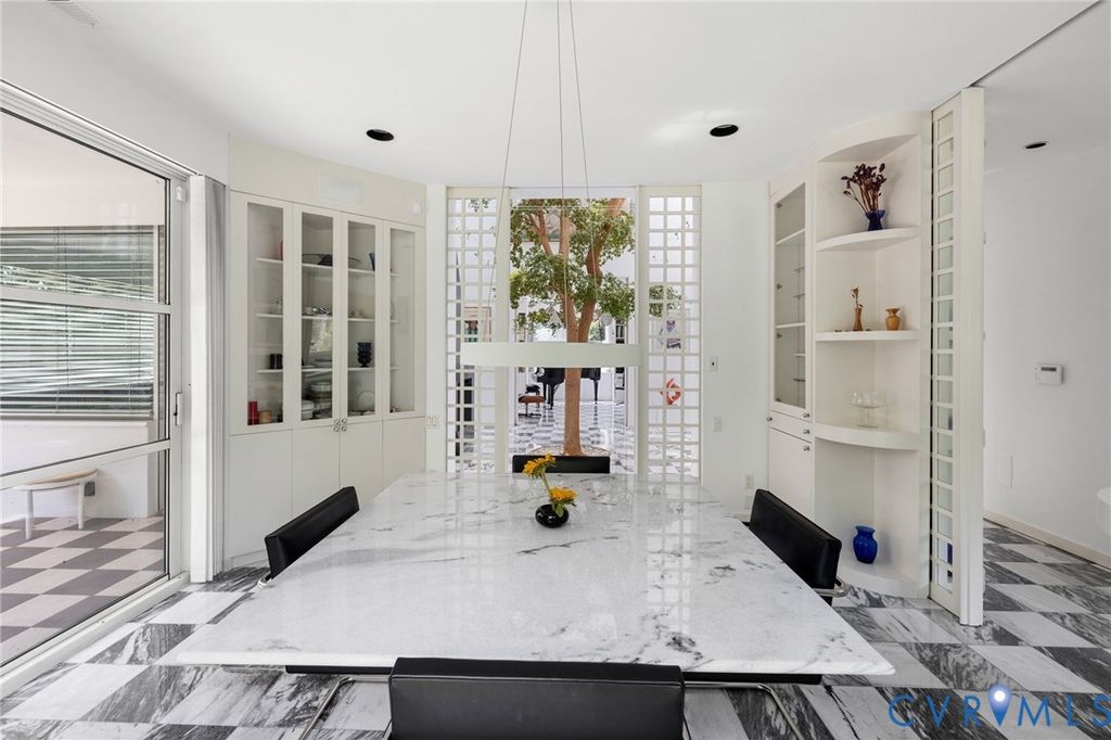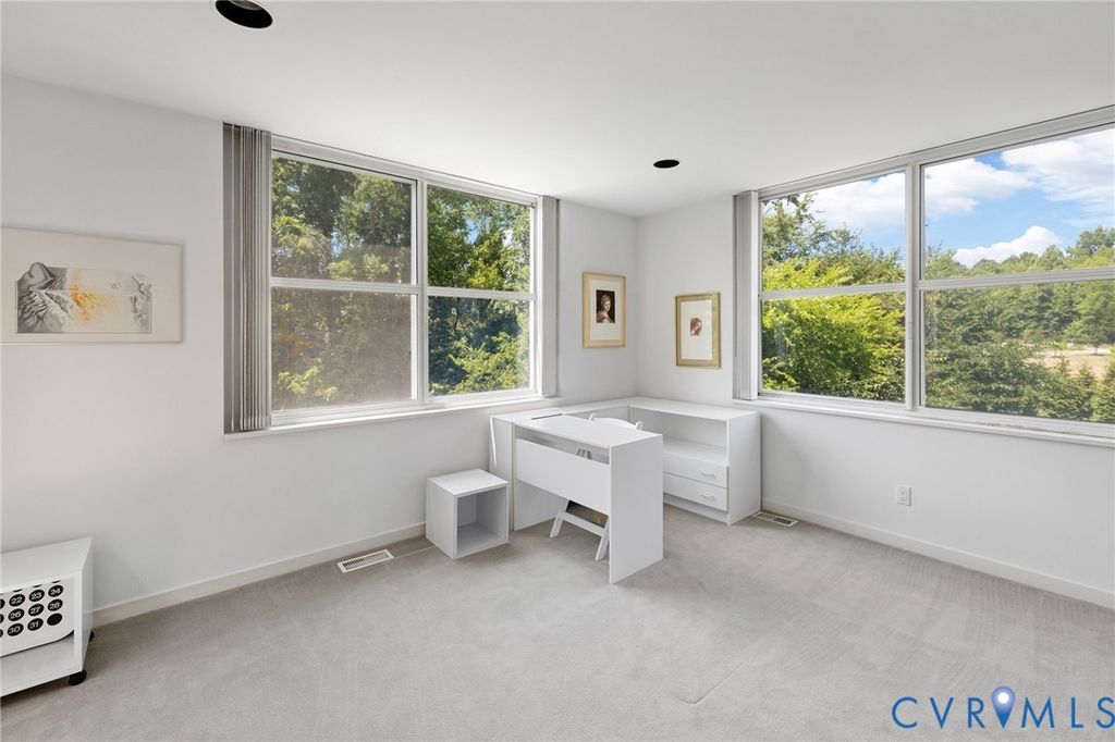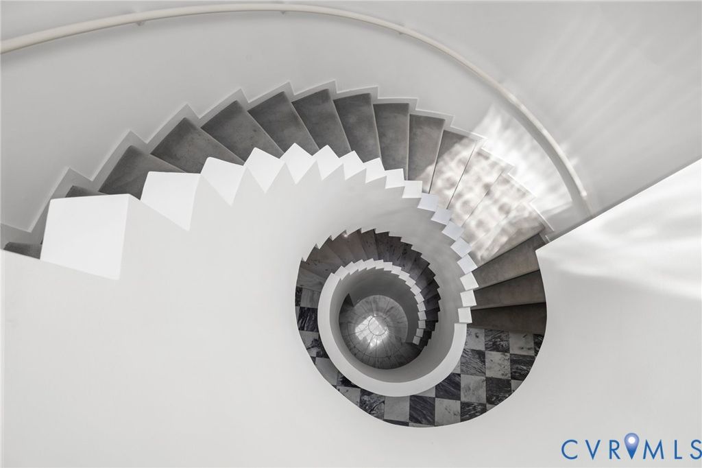 A rare opportunity to own a custom, contemporary-international style home in the coveted Pembroke neighborhood along the River Road corridor awaits. This home features large picture windows in all but two spaces in the home, bathing the interiors in light throughout the day and the night. Built w/ cutting-edge sustainable techniques at the time, the home remains energy-efficient and features a rooftop greenspace above the garage. Upon entering the marbled foyer, discover the first of 5 BRs, complete w/ an ensuite bath, built-in Murphy bed, and sliding glass doors that open to the outdoors, offering flexible use. To the left, the striking spiral staircase, crafted as a single piece of steel and poured concrete, is bathed in natural light from above. On the main level, marbled flooring in a gray & white checkerboard gives a formal finish to the open space. A 2-story sky-lit atrium anchors the 4 living spaces that flow freely into one another. Just beyond the double-sided fireplace, the LR is tucked in a square bay flanked by large windows. The kitchen and DR are stunningly simple and efficiently designed to serve their purposes. A home office w/ custom cabinetry connects seamlessly to a sitting room, also outfitted w/ custom built-in shelving. Glass and wood grid-patterned pocket doors can be utilized to separate the spaces. Following the natural light, the terrace off the dining area faces east, while the terrace off the LR faces west and is perfect for sunset entertaining. Follow the spiral staircase up to find 4 BRs, each w/ an ensuite bath. The primary suite features a wall of mirrored closet doors to reflect the westward facing view. A guest room features a built-in Murphy bed for flexibility to be used as an upstairs den if desired. Set on nearly 4 acres, this property offers unparalleled privacy, while still being part of a vibrant community with views and access to the James River. Don't miss this opportunity to own a truly unique and enduring property that brings intention and functionality together.
