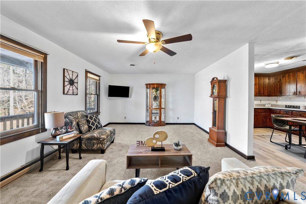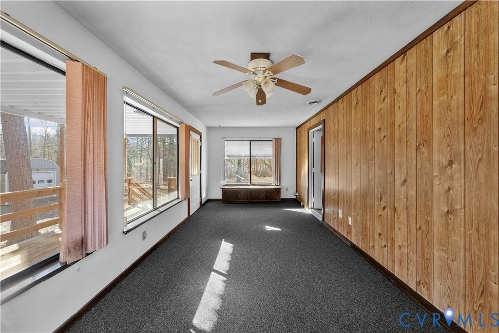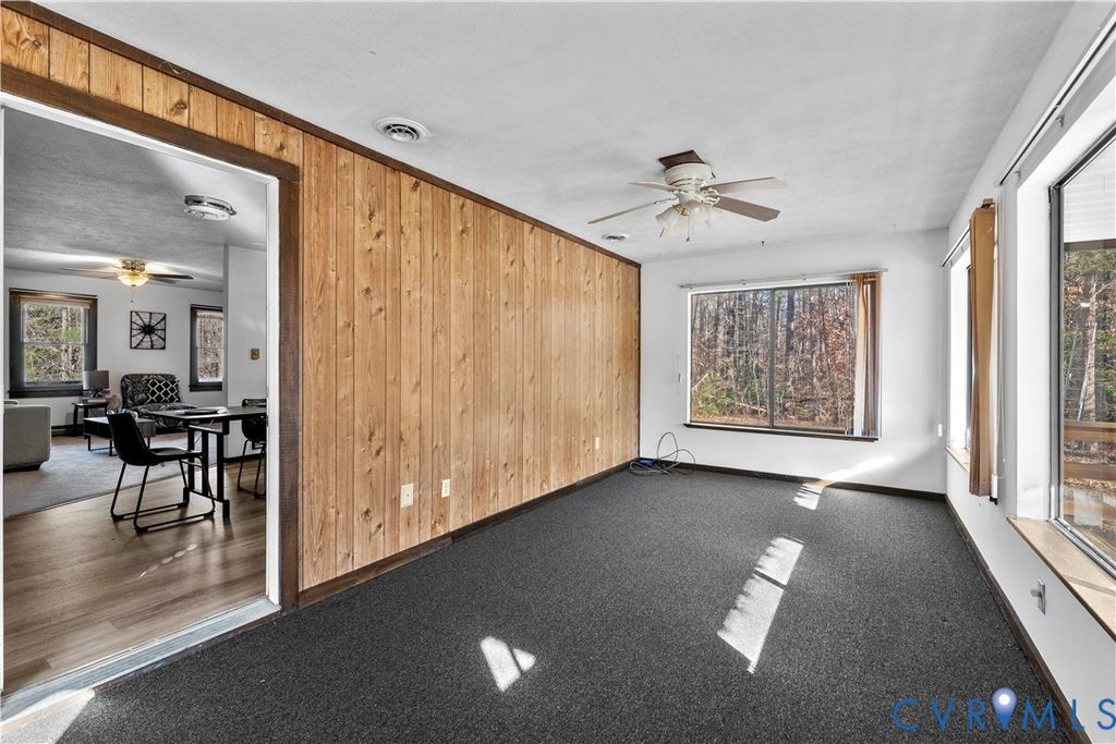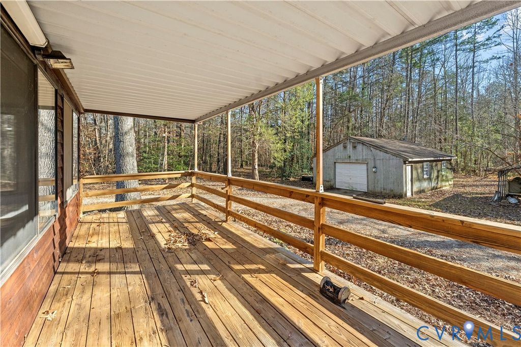 Welcome home to a place where the quiet feels softer, the stars shine brighter, and your days slow down just enough to breathe. This charming 2-bedroom, 2-bath Rancher on 7 peaceful acres in Powhatan offers the comfort of simple living with thoughtful updates. A gently sloped ramp leads you to the wide covered front porch"”the kind made for rocking chairs, morning coffee, and listening to the world wake up. Inside, the home has been freshly painted and features new carpet in the bedrooms and living room, refreshed bathrooms with new vanities and toilets, and new lower kitchen cabinets for a clean, updated feel. The kitchen blends rustic pine cabinetry with an eat-in layout, newer stainless steel stove and microwave, and access to the four-season room, wrapped in eight windows that fill the space with natural light and year-round views of the peaceful countryside. The living room is spacious and bright, offering plenty of room to gather, unwind, and enjoy quiet evenings at home. Both bedrooms are generously sized with ceiling fans and share a hall bath with a tub/shower combo. Downstairs, the basement offers a large open area with a wood-burning stove and recessed lighting, a roomy walk-in closet, and a flexible bonus space that leads straight outside. A full bath with shower makes the area great for guests. It's also perfect for hobbies, a workshop, extra living space, or future expansion. Outside, the property truly shines with a large covered back deck, a powered 1-car garage, a spacious metal Quonset hut with a garage door and concrete floor, and two additional sheds"”plenty of space for storage, equipment, and projects. A water softener is already in place for convenience. Whether you're dreaming of a peaceful retreat, space to spread out, land to ride your ATV, or a place to build your next chapter, this Powhatan property welcomes you with open arms. Property is SOLD AS IS.