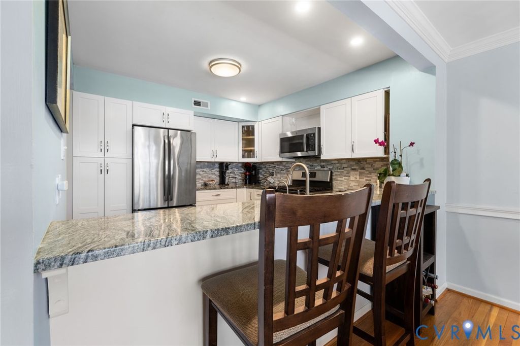 This beautiful, updated townhome is just steps from the Southampton Recreation Association and a short walk to the James River and Pony Pasture. As soon as you enter, you will be impressed with the thoughtful upgrades and open floorplan. Off the dining room are sliding glass doors to a peaceful, private backyard setting. The remodeled kitchen features granite countertops and stainless steel appliances. An open floor plan centers around a cozy gas fireplace in the living area, wood floors, complemented by an updated half bath and convenient storage under the stairs. Upstairs are new wood floors. Both bedrooms feature ensuite baths, including a fancy, heated toilet in the primary suite. Second bedroom ensuite has recently been remodeled. The one-car garage includes a refrigerator, along with new storage and bike racks. New HVAC system in 2024. Step outside to relax on your back deck and enjoy your professionally landscaped yard. HOA fee covers roof repair and replacement, siding repair and replacement, gutters, downspouts, limited grass cutting, and more. This one truly has it all