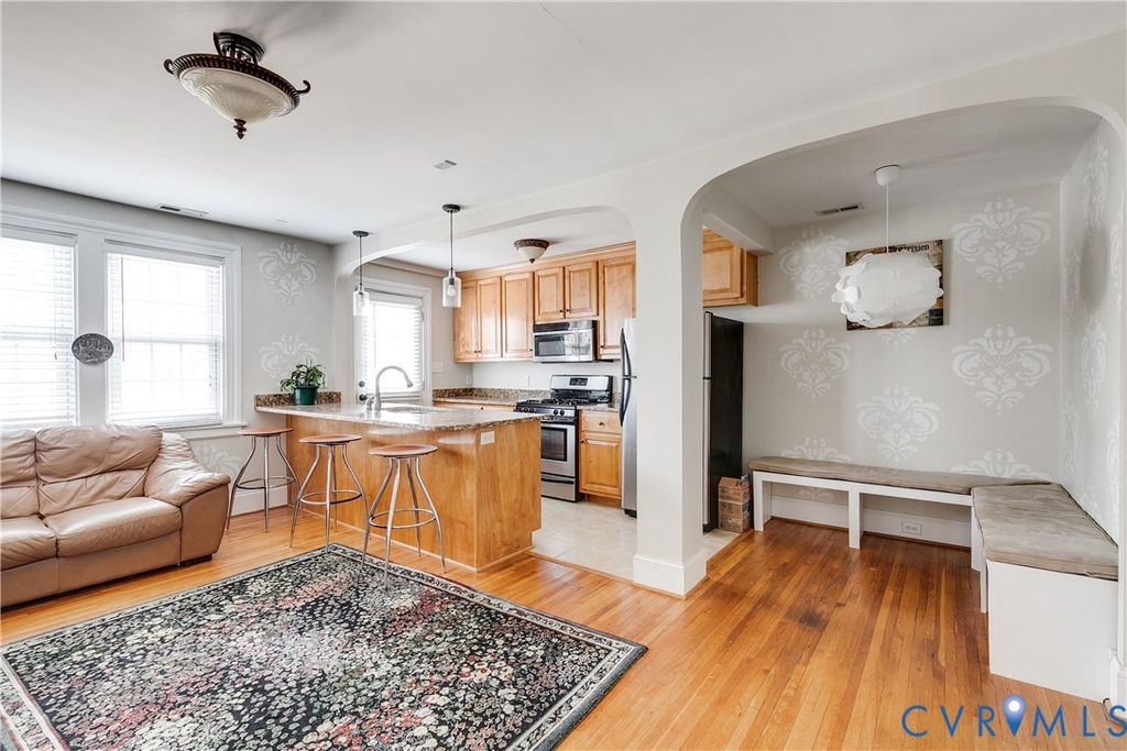 Perfectly located in RVA's Near West End, this exceptionally maintained two-bedroom condo features hardwood floors throughout and an open concept that combines kitchen and living areas and a cozy dining nook with custom built-in seating. The wide-open kitchen is designed for entertaining and everyday use and offers granite countertops and lots of storage. Both bedrooms are generously sized and offer private access to a shared Jack-and-Jill bathroom w/ tile surround tub/shower. The spacious primary bedroom opens to a private front balcony that sets this home apart from others in the building! The entire condo has been thoughtfully maintained, with hallways freshly painted and new carpet installed in 2020. Additional features include secure entry, OFF-STREET parking, and extra storage space in the unfinished basement. Enjoy a walkable lifestyle close to The Continental, Jack Brown's and many other neighborhood favorites! Easy access to Libbie/Grove, Carytown, Willow Lawn, and Scott's Addition!