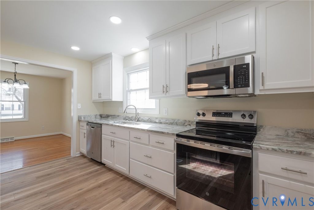 Great remodeled 3 bedroom, 2 bath brick rancher. New LVP in the family room utility room and kitchen. The bathrooms have ceramic tile. All other floors are beautiful hardwood. All new interior paint. New stove, fridge and microwave. New kitchen cabinets and island with granite tops. New insulation and vapor barrier. New concrete driveway. There is new drywall in the family room and 2 front bedrooms. There is a detached garage in the fenced in back yard.