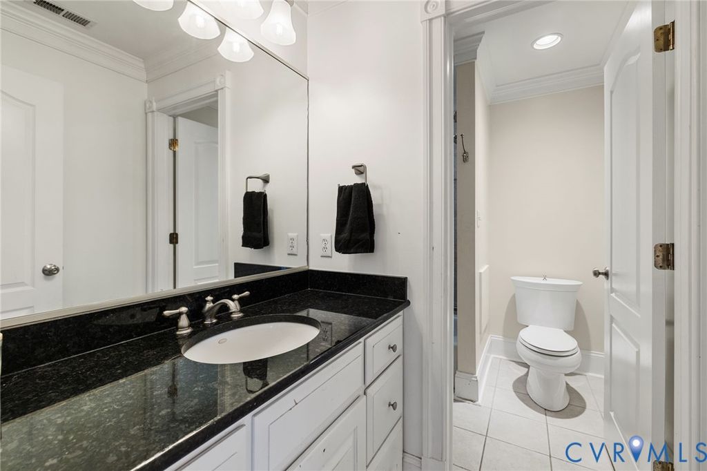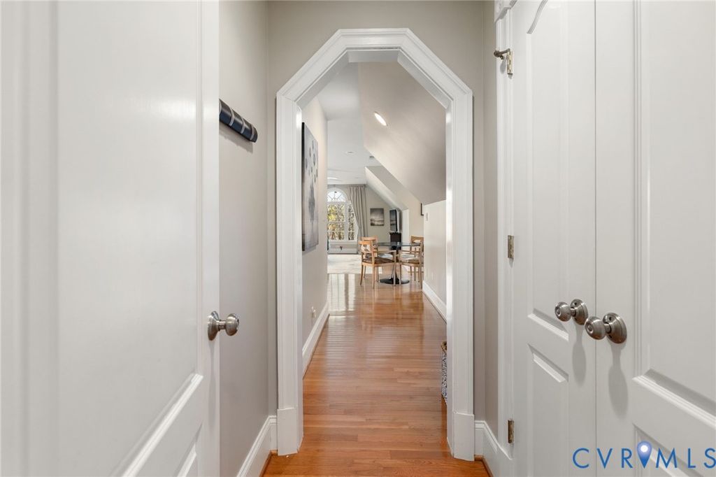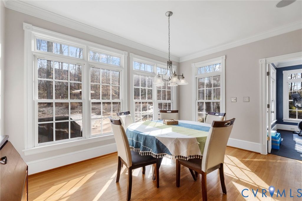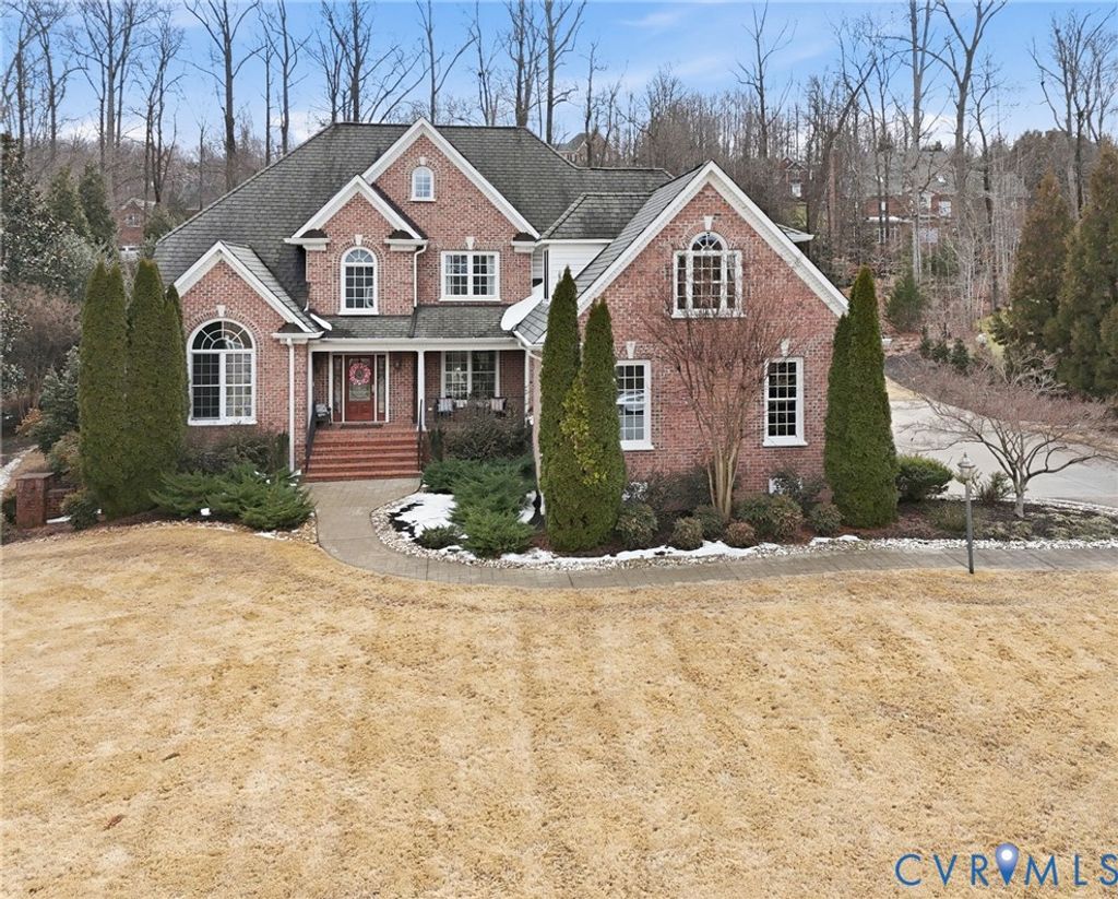 From its striking brick facade to its thoughtfully designed interior, this custom home in Queens Grant is the definition of sophisticated living. Showcasing a stunning brick exterior, lush professional landscaping & aggregate walkway, this home makes an unforgettable first impression. Step inside a grand 2-story foyer & immediately appreciate the rich HW that flow seamlessly throughout entire home. Flanking the foyer is formal dining adorned w/arched doorways, decorative columns & detailed wall molding, perfect for hosting memorable gatherings. Opposite the dining, private home office features French doors & vaulted ceiling, creating an inspiring, light-filled workspace. Expansive 2-story family room is truly breathtaking, highlighted by interior balcony overlook, gas FP & custom built-in bookcases &cabinetry. Direct access to outdoor patio makes entertaining effortless. Kitchen is a chef's dream, boasting granite counters, waterfall island w/bar seating, Wolf gas stove & oven, SS appliances, built-in microwave & refrigerator. Versatile bonus room offers endless possibilities, ideal for a playroom, home gym, or additional lounge space. 1st-floor primary is a luxurious retreat featuring spacious WIC w/custom closet system. Spa-like en suite includes separate granite vanities, jetted tub & walk-in shower w/glass enclosure & built-in tile bench. Upstairs, find 4 generously sized BRs, all w/HW &WIC. Fourth BR also includes a large kitchenette w/beverage fridge, perfect for game room or multi-generational living. Outdoor space is a true oasis w/stamped concrete covered patio leading down to beautifully designed, fully fenced in-ground pool. Plans are available for a future pool house, offering even more potential to elevate this backyard retreat. Additional highlights include a full-house water filtration system & double tankless water heaters for ultimate efficiency and comfort. This extraordinary Queens Grant residence delivers luxury, function & resort-style living in one of Chesterfield's most coveted communities.
