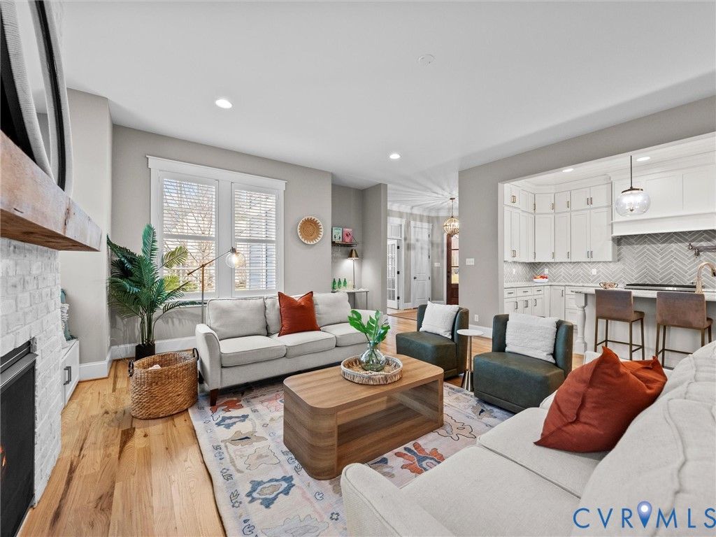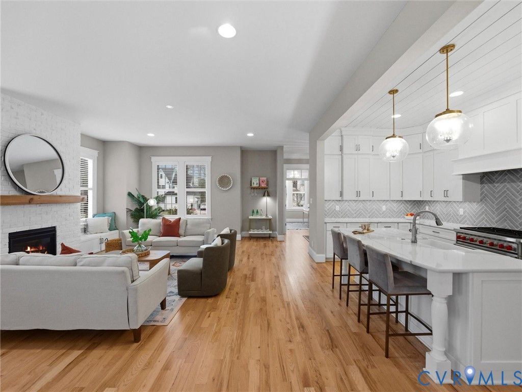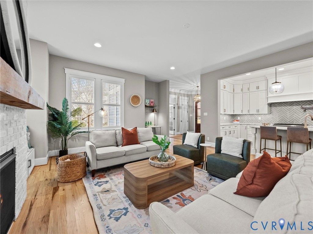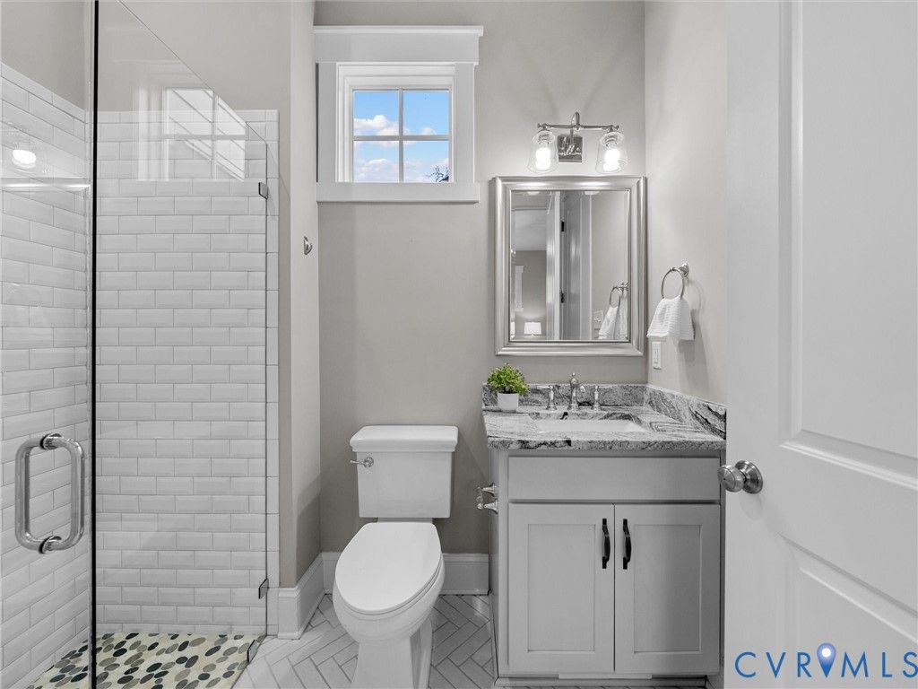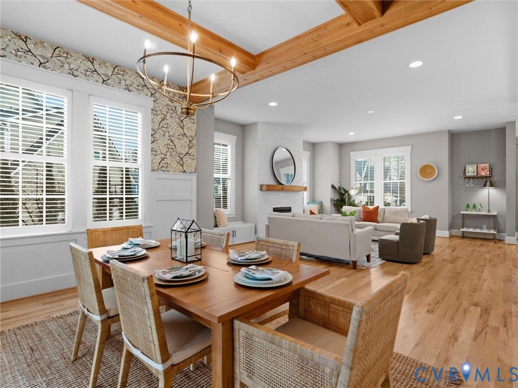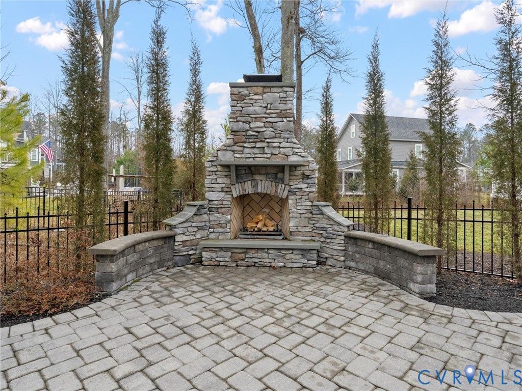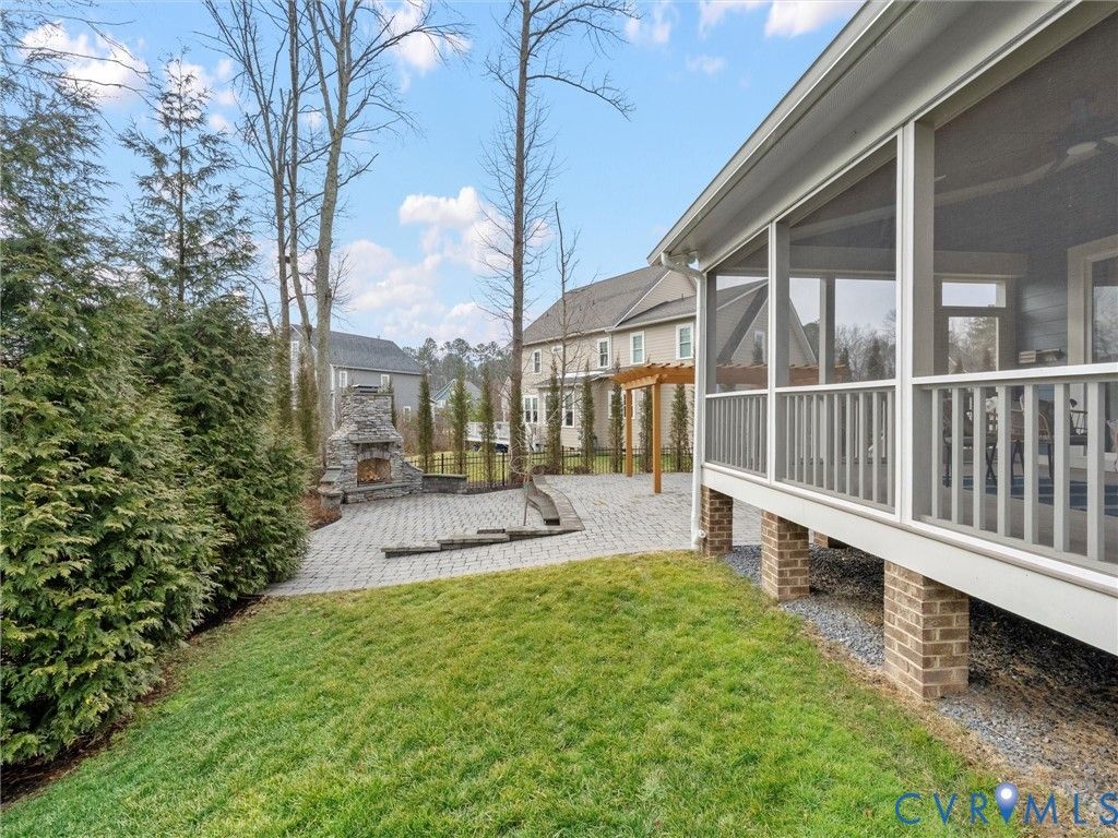 Welcome to this stunning three-story Craftsman home perfectly situated on a spacious corner lot in a rare double cul-de-sac setting. Step inside the solid wood front door with adorned beveled glass to rich hardwood floors that flow throughout the main living areas, creating warmth and timeless elegance. Just off the foyer, a designated private office with elegant glass French doors provides the perfect work-from-home space, combining functionality with refined style. The inviting family room centers around a charming gas brick fireplace, ideal for cozy evenings at home, while the dining room showcases striking exposed beams that add architectural character and classic Craftsman detail. The gourmet kitchen, complete with a 6 burner, gas Wolf Range opens seamlessly to the living and dining spaces. Tucked off the living space is a coveted first floor bedroom with attached full bath featuring a zero entry shower. Upstairs, two spacious secondary bedrooms share a well-appointed Jack-and-Jill bath, offering both convenience and privacy. Another bedroom features its own private full bath, perfect for guests or multigenerational living. The primary suite is a true private retreat with space for a sitting area, creating a peaceful haven to unwind at the end of the day. The oversized walk-in closet provides exceptional storage with ample room for custom shelving, drawers, and seasonal wardrobe organization. The spa-inspired primary bathroom exudes luxury, featuring dual vanities, a soaking tub, and a spacious walk-in shower. Thoughtfully designed for everyday convenience, the bathroom offers direct access to the laundry room, creating a seamless flow that makes daily routines effortless. The expansive third-floor living space offers incredible versatility - ideal as a private guest suite, teen retreat, or bonus room, complete with a full bath and walk-in closet. Outdoor living is just as impressive, with a screened porch overlooking a beautifully crafted paver patio featuring an outdoor fireplace and fenced yard.
