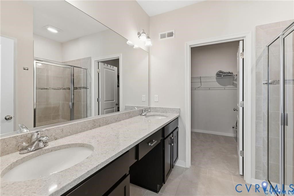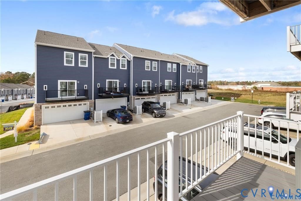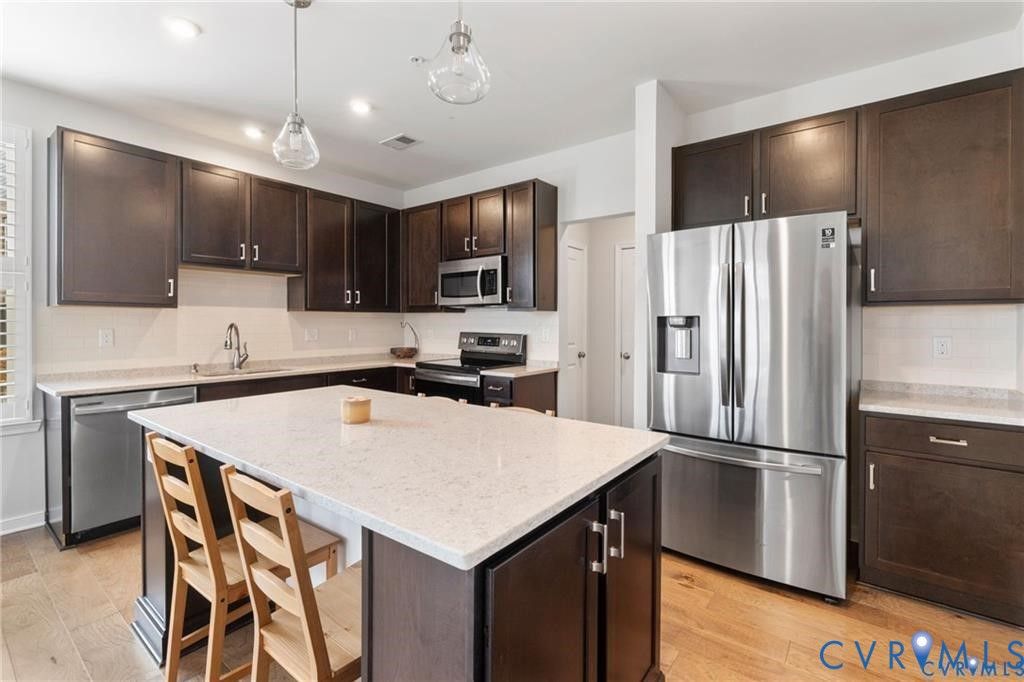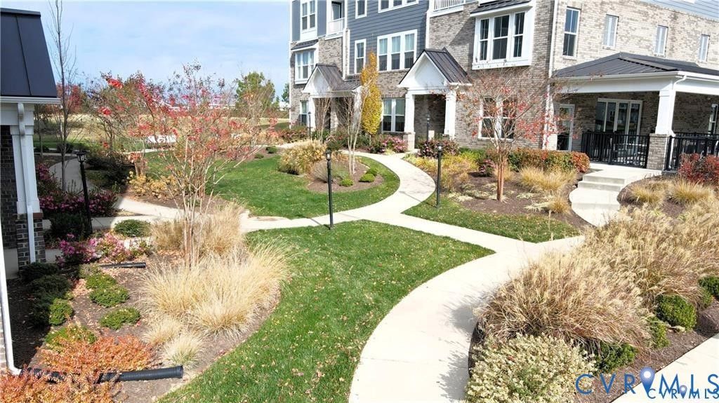 NEW PRICE DROP! Welcome to this beautifully maintained 3 bedroom ground level end unit in the highly sought-after Cosby High School district, offering extra sunlight w/additional end unit windows and timeless plantation shutters throughout. The covered front stoop leads into an open great room made for relaxing, featuring engineered hardwoods, recessed lighting & ceiling fan. The space flows into a stunning kitchen w/quartz countertops, a center island w/ available seating for four, 42" cabinetry, stainless appliances, tile backsplash, pendant lighting & recessed lighting. Completing the first level is a convenient half bath and direct access to the attached rear-entry garage. Upstairs, the spacious primary suite includes two walk-in closets and ensuite with tiled walk-in shower, glass door, double quartz vanity & tile floors. Bedroom two features its own walk-in closet, while bedroom three includes a double-door closet and access to the rear balcony with Trex-style decking and outdoor lighting. A full hall bath with tile, tub/shower, linen and laundry closets w/ washer/dryer & additional utility closet finish off the 2nd level. With 3 bedrooms, 2.5 baths, 1,510 sq ft, ground-level entry, generous storage & a prime end-unit location, this home blends comfort, efficiency & modern style. Sitting just off the beautifully appointed courtyard and steps away from the community's included clubhouse indoor & outdoor spaces, featuring a firepit lounge space, fitness center and gaming tables, this unit's community location can not be beat. Come see this wonderful home in the heart of Chesterfield near ALL the amenities.