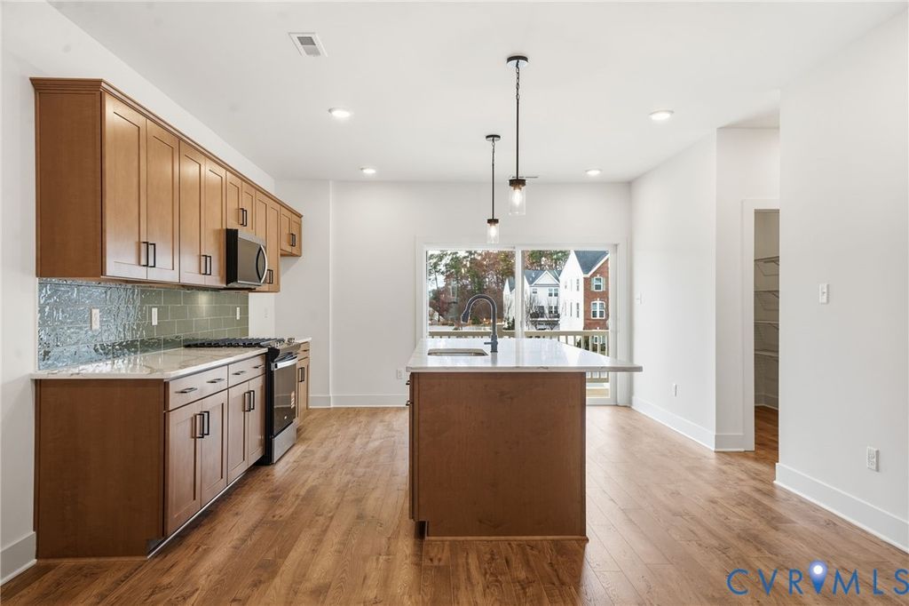 Welcome to the Laurel Grand by Main Street Homes! This BRAND NEW Energy Advantage 3-story townhome blends modern design with exceptional craftsmanship. Thoughtfully designed for comfort, it features 4 bedrooms, 3.5 baths, oak stairs from the 1st to 2nd floor, rear-entry 2-car garage, tankless water heater, rear covered deck, and durable Hardie-plank siding. The first floor includes a large bedroom and full bath. The open-concept second floor is an entertainer's dream, with a spacious great room, dining area, and powder room. The rear-layout kitchen showcases upgraded Level 3 cabinets, quartz countertops, ceramic tile backsplash, stainless-steel appliances, gas stovetop, walk-in pantry, and an extended island. Upstairs, the primary suite features a huge walk-in closet and ensuite bath with ceramic tile shower, double vanity, and private water closet. Two additional bedrooms, a full bath, and a convenient laundry room complete the third floor. Shire Walk offers sidewalks, benches, green spaces, and a community gathering area with pergola and fire pit. This low-maintenance Henrico County community is near dining, shopping, and entertainment at Short Pump Town Center. Just 12 miles from Richmond International Airport, Henrico County combines natural beauty with top-tier recreation. With over 40 parks featuring lakes, rivers, and trails, it also offers golf, tennis, pickleball, cricket fields, disc golf, skateparks, and youth/adult leagues. Residents enjoy championship pickleball at Pouncey Tract, cricket tournaments at Deep Run and Castle Point, and premier sports complexes.