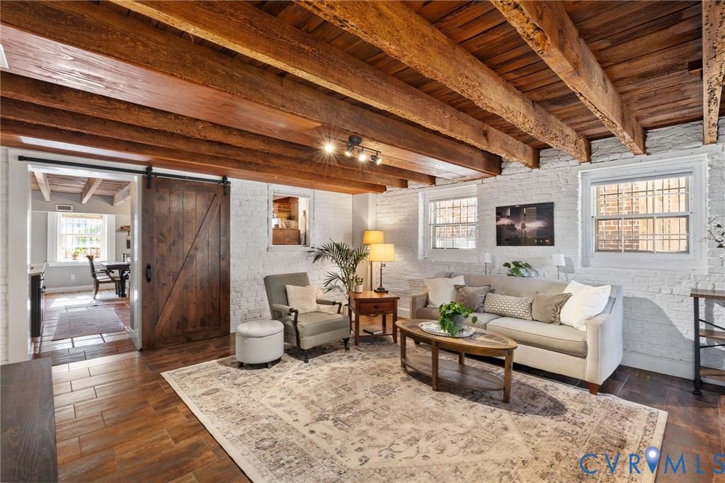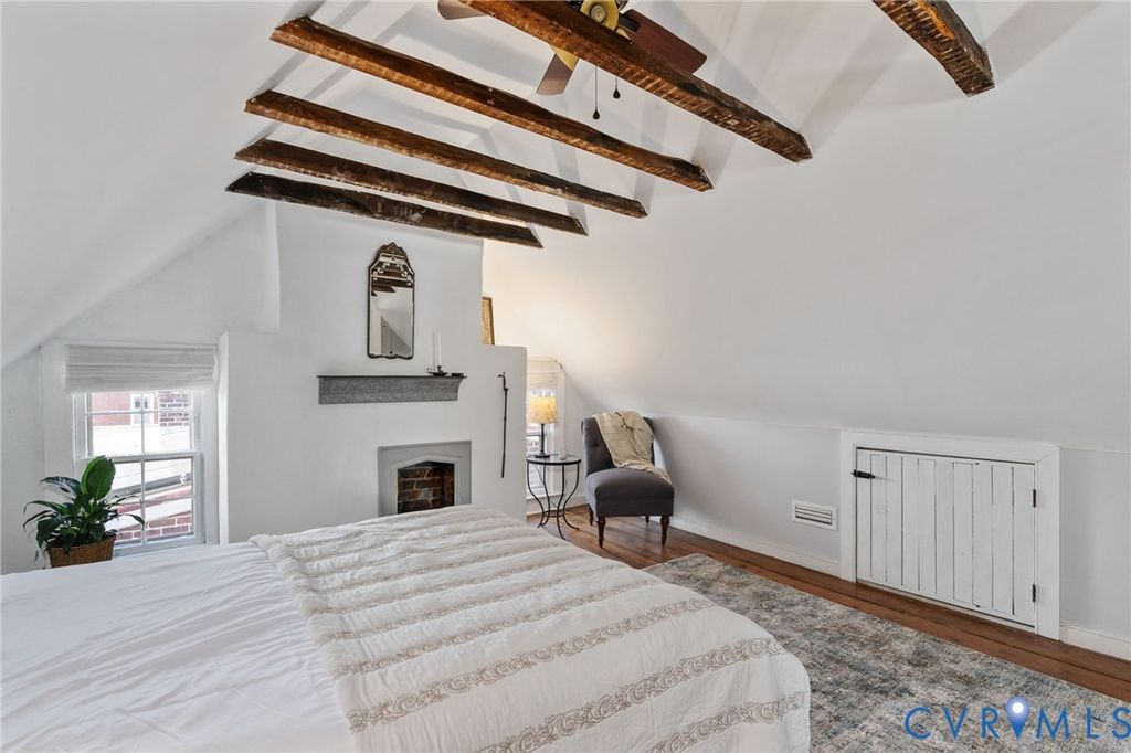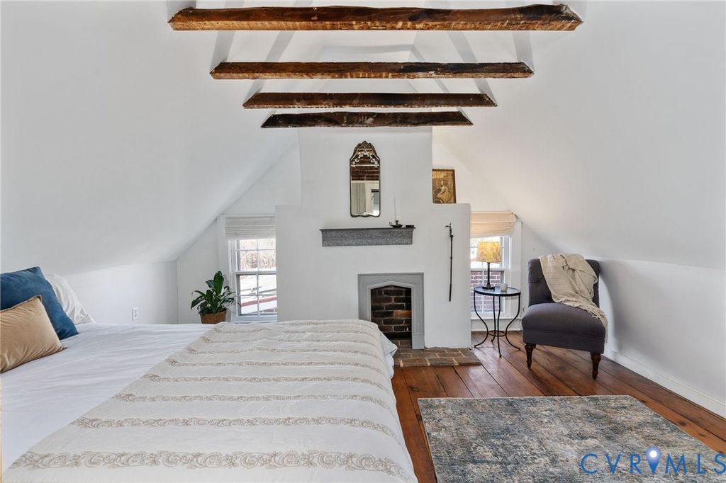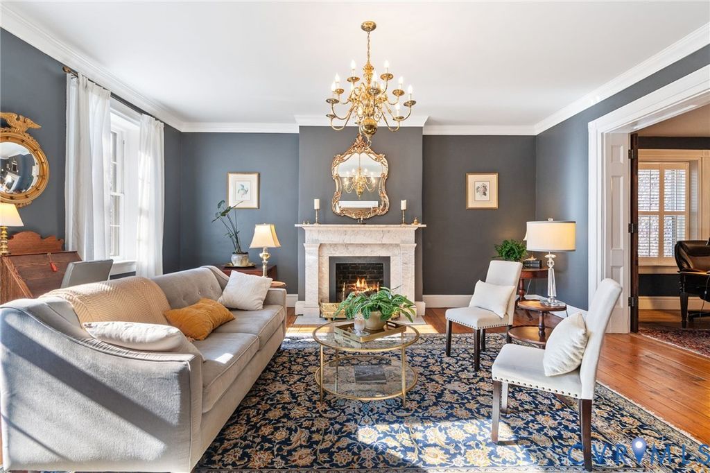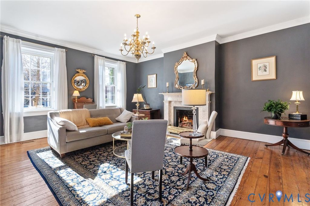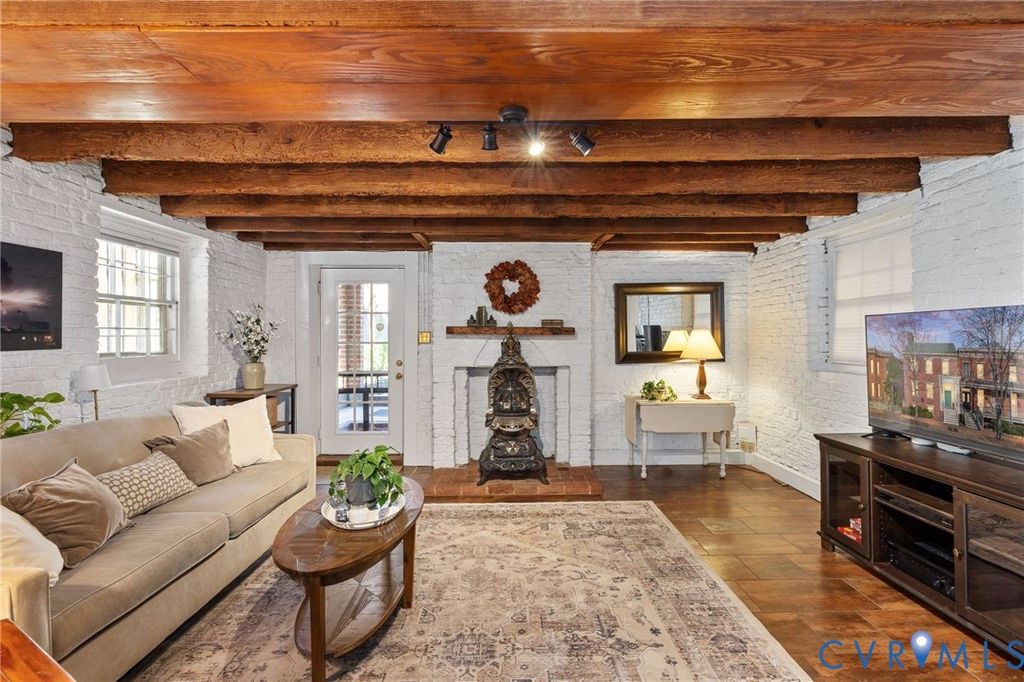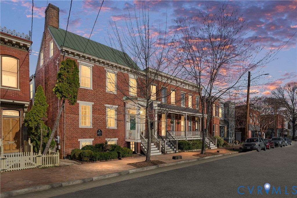 Looking for a truly historic gem? The Adams-Crump House (c. 1813) stands as one of the neighborhood's finest examples of early Federal architecture with later Greek Revival influence. This beautifully restored brick residence offers approximately 3,800 square feet across four finished levels, including a finished English basement, and retains remarkable original details such as heart pine floors, original hardware, multiple fireplaces, and historically appropriate moldings. The main level features a gracious entry hall with the original staircase, a formal living room at the front, and a large rear office or library with fireplace and built-in bookcases. Original working French doors allow the spaces to flow together or remain private. A light-filled morning room overlooks the garden. The finished English basement showcases exposed brick and beams, a spacious eat-in kitchen, and a welcoming family room centered around an antique stove, with direct walk-out access to the garden. The second floor includes two generous bedrooms with fireplaces, a primary bath, and a traditional trunk room ideal as a dressing room or closet. The third floor offers a private retreat with a bedroom, fireplace, sitting room, exposed beams, and additional attic storage. A three-story rear veranda with double balconies overlooks the mature backyard garden and offers sweeping city views and spectacular sunset vistas. The landscaped grounds feature established perennials, front and rear irrigation, and a dedicated fire pit area. A tool and storage shed adds convenience. The fenced rear yard also includes two off-street parking spaces on a private parking pad with a 30-amp RV hookup. Located on wide, tree-lined 27th Street and walkable to parks, restaurants, coffee shops, and neighborhood shops, this is a rare opportunity to own a true Church Hill landmark. Fire in the fireplaces has been digitally added to the photos.