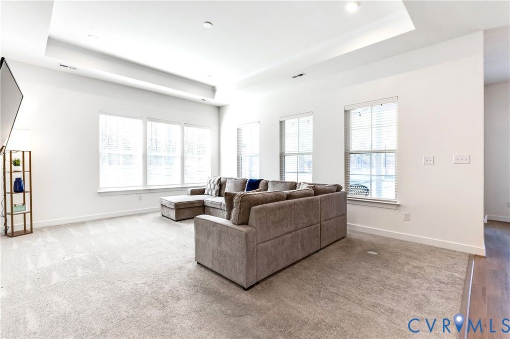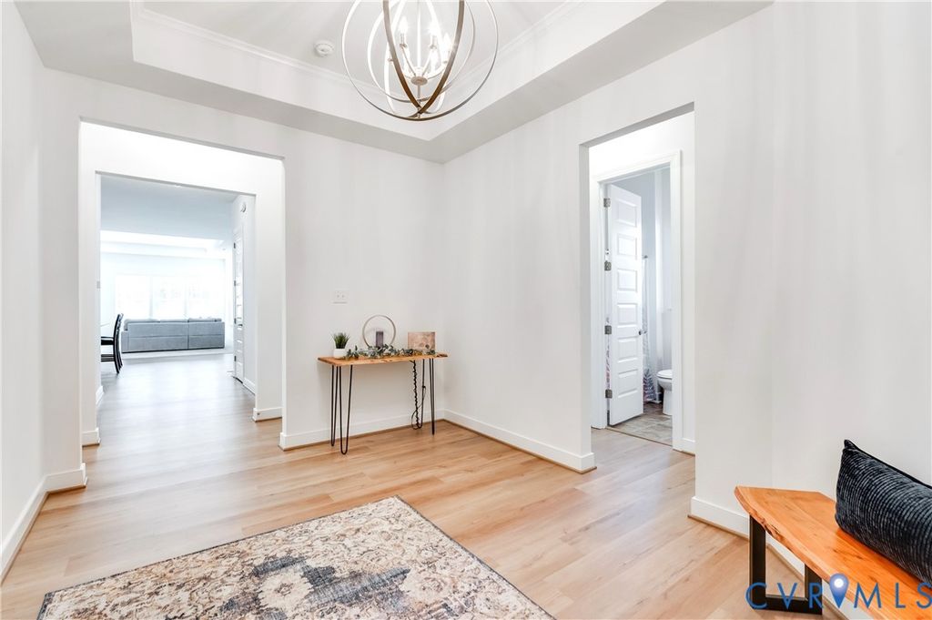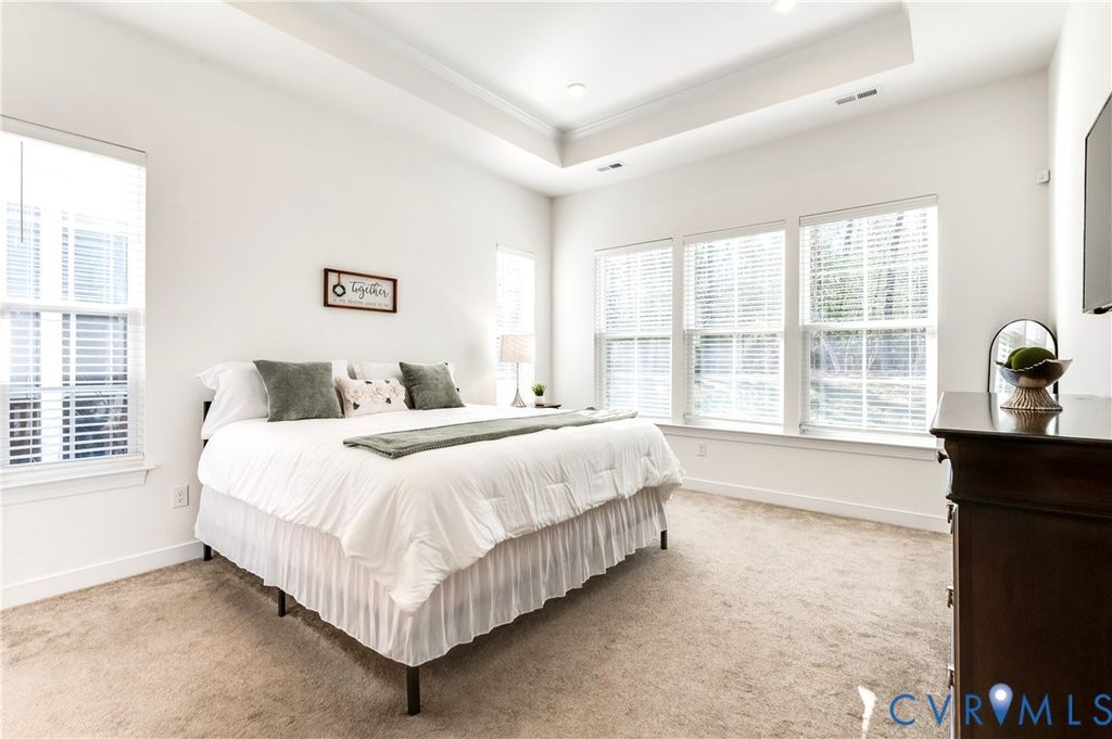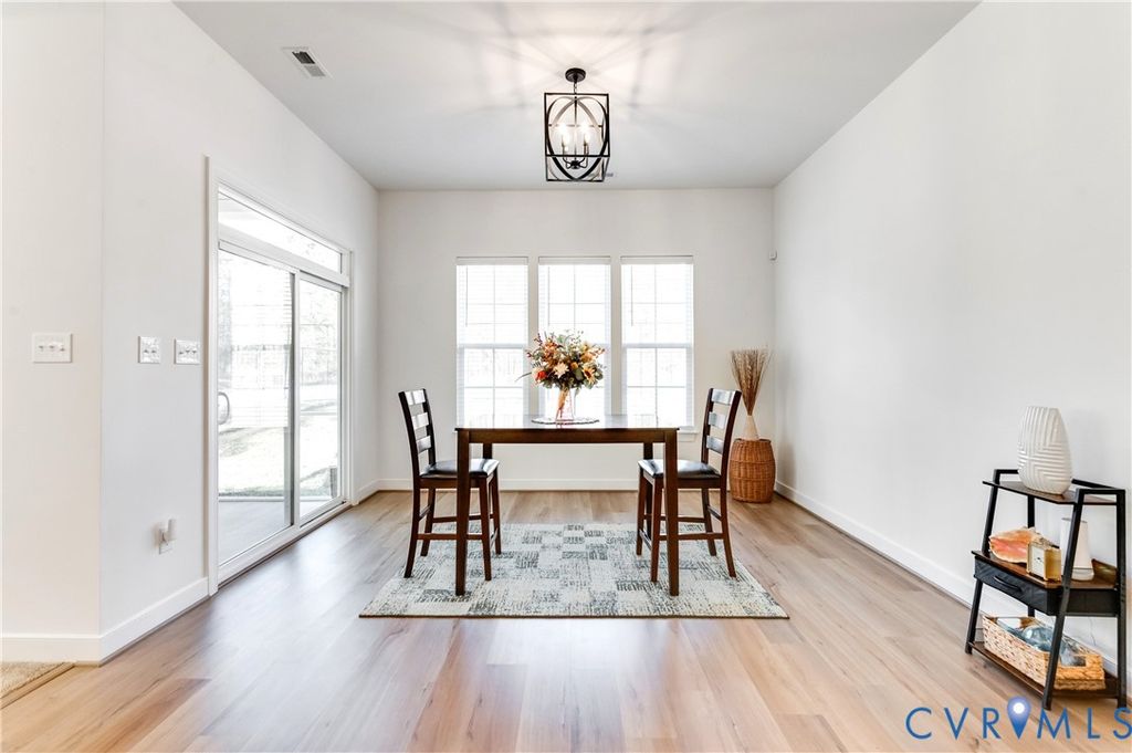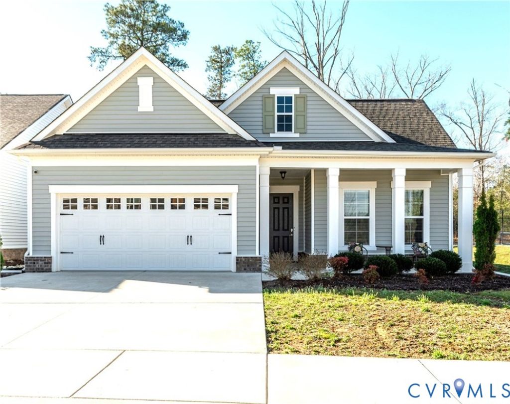 MOVE-IN READY, SPACIOUS, TRANSISTIONAL RANCH IN SOUGHT-AFTER Twin Rivers at Meadowville Landing will NOT disappoint! Walking up, imagine relaxing on the front porch. Upon entering, a Spacious Foyer welcomes with LVP Flooring, a 10 Ft. Tray Ceiling, and a large Chandelier. To the right, awaits 2 Spacious Bedrooms separated by a Full Bath with one Bedroom having direct access. Across the Foyer, a Bedroom Ensuite with an Ample-Sized Full Bath provides privacy for in-laws or guests. Straight ahead opens into a Stunning Kitchen and Breakfast Room with LVP Flooring. The extraordinary Kitchen boasts upgraded 42-inch Wall Cabinets, Granite Countertops, Large Walk-in Pantry, Recessed and Pendent Lights, Stainless Appliances, and a Large Prep Island with a Countertop Overhang for Seating. The Spacious Breakfast Room provides lots of natural lighting with Large Triple Windows and direct access to a Spacious Screened Patio conveniently located for entertaining and relaxing day and night with String Lights! Back inside, imagine family time and entertaining friends in the Huge, Bright Family Room showcasing Lots of Windows, a 10-Ft Tray Ceiling with Crown Molding, Recessed Lights, and Prewired for a Ceiling Fan. Want to see more? The Spacious Primary Bedroom Ensuite awaits with a Tray Ceiling, Plenty of Windows for Natural Lighting, and an Over-Sized Closet. The Bathroom features a Granite-Top Raised Height Double Vanity, a Large Walk-In Shower, Ceramic Tile Floor, Water Closet, and Linen Closet. Ready to see more? Don't miss the Laundry Room, the Drop-Zone Hall Tree, and the Extra Room perfect for an Office, Hobby or whatever you envision. Additional features include 2-inch Window Blinds throughout, Rinnai Tankless Gas Water Heater, Whole-Yard Irrigation, Security System and a Backyard backing up to trees!