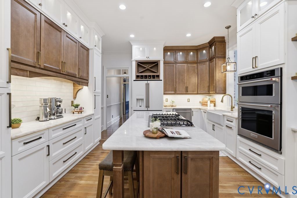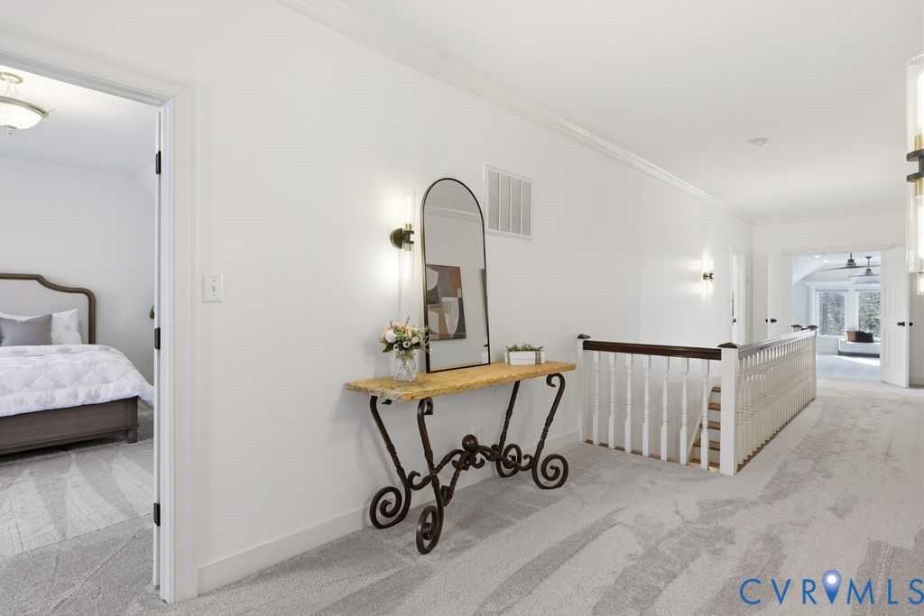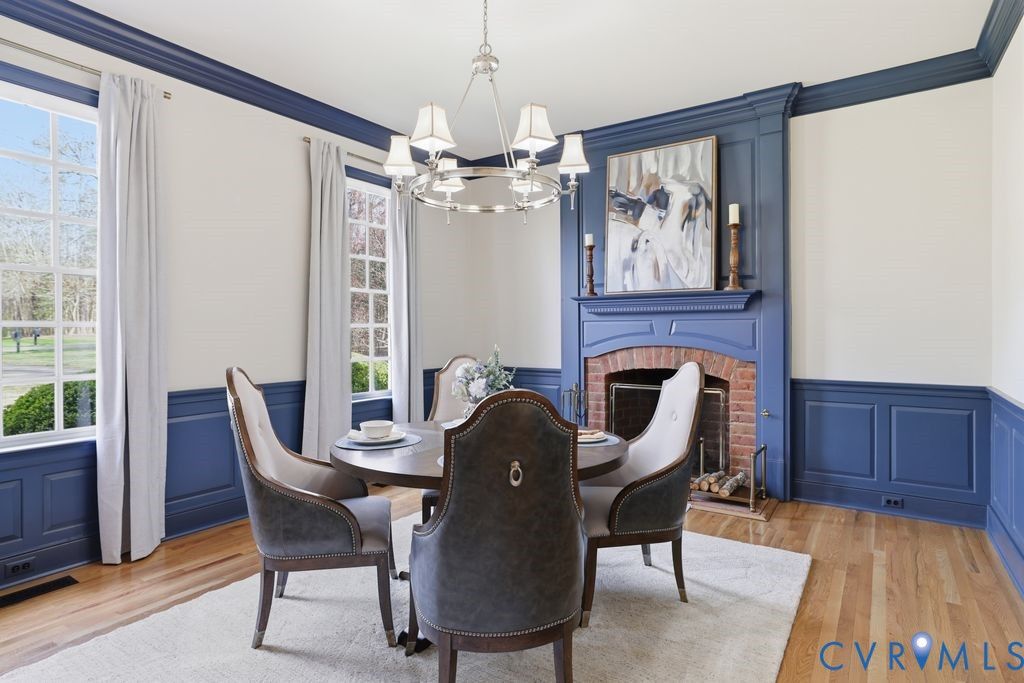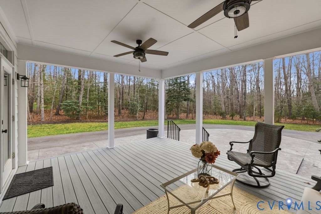 Nestled within the prestigious Woodland Pond community, this custom-built J.D. Robbins home captures the Williamsburg-inspired architecture while seamlessly incorporating today's classic modern elegance. Privately situated on a 2.4 acre oasis which directly borders Virginia's largest state park, "Pocahontas State Park" and framed by lush landscaping, this home offers a rare combination of refined craftsmanship and estate-style living just minutes from Richmond and modern conveniences. The quality is unmistakable, with 10-foot ceilings on the main level, 9-foot ceilings on the second, wide hallways, trim packages, detailed brick hearths and period-style millwork create a sense of integrity that is increasingly hard to find. The thoughtfully renovated kitchen is a dream with "Crystallo Superiore" quartzite countertops, beautiful modern cabinets, Kraus farmhouse sink, Kitchen-Aid appliances including a built-in oven, 5-burner gas cooktop with direct vent, built-in pantry and microwave with convection/air fry capability. Retreat to the first-floor primary suite that offers a floor to ceiling modern wardrobe wall unit, soaking tub, dual vanities and a generous walk-in closet. Secondary spaces are equally well-appointed, with spacious bathrooms featuring new vanities and quartzite countertop. The outdoor setting is as compelling as the interior with a massive covered porch overlooking the stamped concrete patio, two gardens - one designed for seasonal plantings and the other is ideal for cultivating fresh herbs/vegetables for homegrown living. There's also abundant storage in the oversized garage with transfer switch ready for generator or RV hook up and detached shed with new cabinetry and electrical. Highlights: Over $200k in updates since 2017, Complete Kitchen & Pantry & Laundry reno 2025, Paint 2025, Carpet 2025, Refinish Hardwood 2025, Vanities 2025, HVACs 2013 & 2020, Roof 2017, Water Heater 2016. Complete list of updates in supplements. Pool/Tennis/Pickleball/Clubhouse can be acquired through Woodland Pond.
