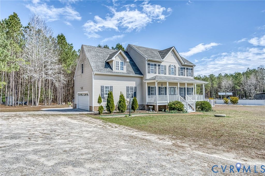 Welcome to 3800 Willow Creek Dr located in "Sweet Home" Disputanta! Located on over 6 acres in a rural setting on a quiet cul-de-sac road, this 4-bedroom, 1978-square-foot home offers privacy, space, and flexible living. The large covered front porch welcomes you as you arrive at the property and is perfect for an early morning cup of coffee or relaxing on a summer afternoon enjoying a cold drink while watching a summer storm roll in. Walking inside you will find a flowing main level with a large living room complete with a gas fireplace, lots of natural light, vinyl floors and access to the rear deck and pool area. A spacious kitchen with stainless steel appliances, a walk in pantry, utility room access and an eat-in dining area with a bay window. A large formal dining area ideal for gatherings or can even be used as an office. Upstairs hosts four bedrooms and two full baths, including a generous primary suite over 187 sq ft in size with a walk-in closet, a secondary closet and a private bathroom featuring a shower/tub combo and dual vanity. The other three bedrooms are spacious with lots of natural light including the largest additional bedroom that is over 200 sq ft, carpeted, lots of natural light and is perfect for a bedroom, play room, office, storage or a rec room. The residence includes an attached 2-car garage with 528-square-foot of space with access to the kitchen area, a fridge, a TV and its own dedicated AC system via a window unit. Outdoor living shines with abundant yard space for gardening or recreation. The above ground pool offers a space to relax as does the rear deck. The partially fenced in yard allows privacy but is also big enough for gatherings around the dual fire pit.. Backyard farmers will love the dedicated vegetable wash off station and chicken coop. The property's cul-de-sac road minimizes traffic while maintaining easy access to major routes"”Route 460, Interstate 95, I-295, I-85 for straightforward commutes. Schedule your showing today!