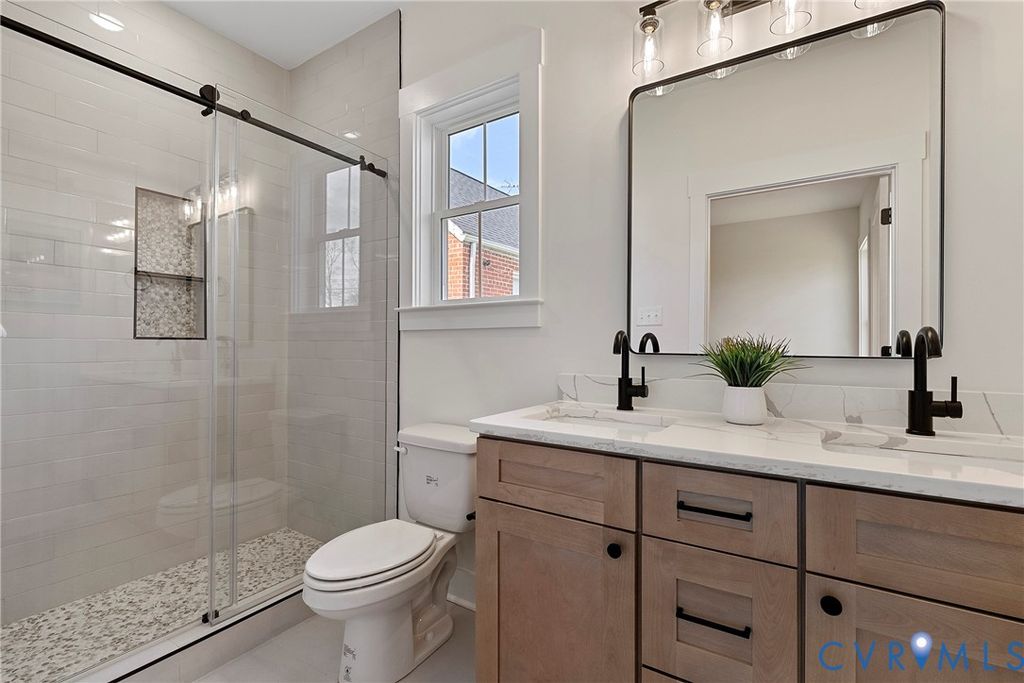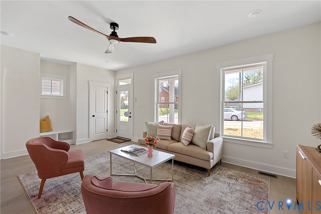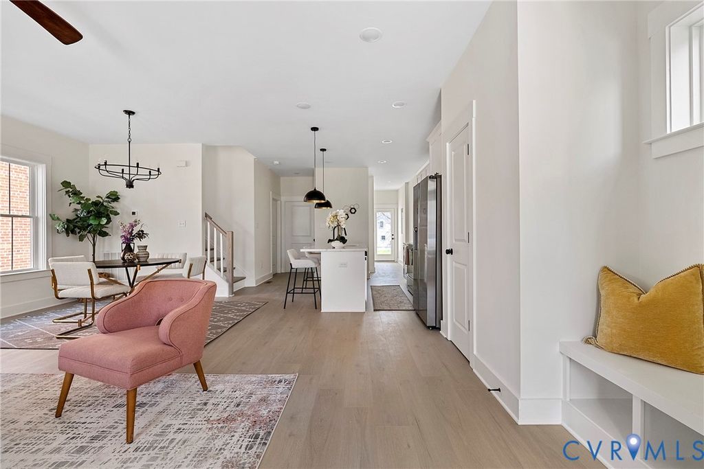 NEW CONSTRUCTION in the city! Welcome to 5202 Campbell Avenue, where modern design meets thoughtful functionality and standout curb appeal. From the moment you arrive, the double-width sidewalk, fresh landscaping, HardiPlank siding, 30 yr. dimensional shingle roof, and a deep covered front porch create an inviting first impression! Inside, you'll find a bright, open-concept layout with LVP flooring, recessed lighting, and clean, modern finishes throughout. The main living area flows seamlessly into the dining space and a beautifully appointed kitchen featuring quartz countertops, true wood dovetail soft-close cabinetry, black fixtures and hardware, decorative pendant lighting, and a pantry for added storage. The first-floor primary suite offers convenience and privacy, complete with a spacious walk-in closet and a stunning en-suite bath showcasing tile flooring, a double vanity with quartz counters, and an oversized walk-in shower with floor-to-ceiling tile, penny tile flooring, and frameless glass doors. A stylish half bath for guests, along with a dedicated laundry area, completes the first level. Upstairs, a versatile loft area provides the perfect space for a home office or flex area, along with two generously sized bedrooms and a full bath featuring tile flooring, quartz countertops, and a tiled tub surround. Step outside to enjoy the rear porch, large backyard, and off-street parking accessible from the alley. With quality craftsmanship, modern finishes, and a functional layout, this home is a must see gem in the heart of Richmond!