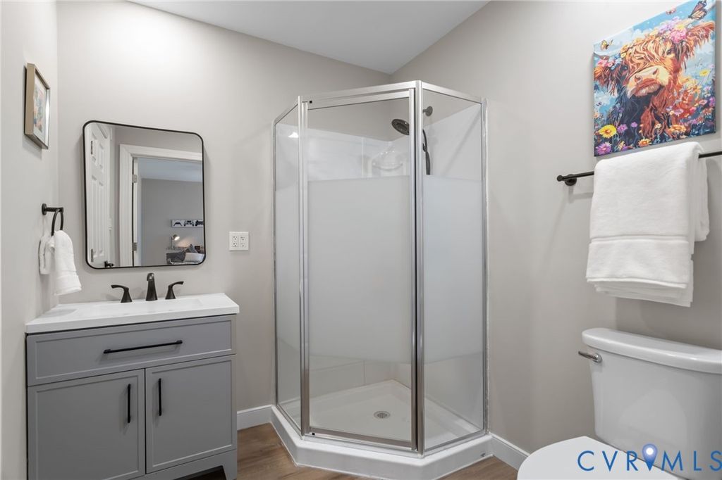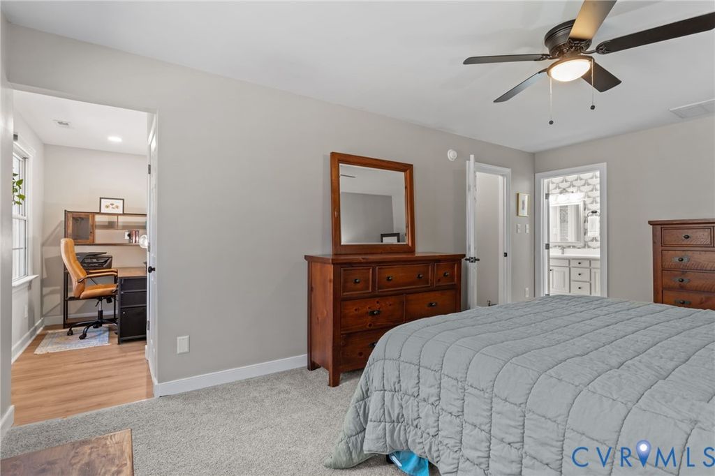 Welcome to 24221 Pear Orchard Rd - an inviting, private retreat set on 5.83 acres in the heart of Moseley. Tucked well back from the road, this peaceful property offers quiet surroundings, new fencing ideal for pets or livestock, and beautifully refreshed outdoor spaces including freshly painted porches, decking, and a relaxing 3-season screened-in porch. Inside, fresh neutral paint, new light and plumbing fixtures, glossy hardwood floors, and wonderful traffic flow create a bright, cohesive feel throughout. The main level welcomes you through the foyer into a formal dining room, flowing seamlessly into the open, sun-filled kitchen with granite countertops, stainless steel appliances (including a new dishwasher and over-the-oven microwave), and recently-refreshed cabinets. The kitchen opens to a spacious family room anchored by a cozy gas fireplace - perfect for everyday living and entertaining alike. Upstairs, the thoughtfully designed layout includes a generous primary suite with an updated ensuite bath featuring a double vanity, walk-in closet, and a separate glass-enclosed shower and toilet area. An adjoining finished space off the primary - complete with plumbing and electricity - offers flexibility as a secondary laundry room, office, workout room, or private retreat. Additional bedrooms include one with an ensuite bath, two more bedrooms served by a shared bath with double vanity, one of which is a spacious room over the garage. A massive walk-up attic with lighting provides exceptional storage or future expansion potential. Additional highlights include updated bathrooms throughout, a new water filtration and softening system added in 2025, newer roof installed in 2023, and efficient two-zone heating and cooling. Currently located in the Cosby District, this home is zoned for the soon-to-open Western Area elementary and high schools and the new Deep Creek Middle School. Offering privacy, space, and modern updates, this home delivers the perfect blend of comfort, functionality, and serenity.