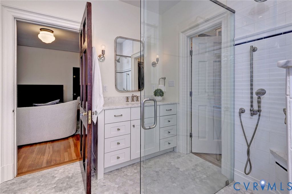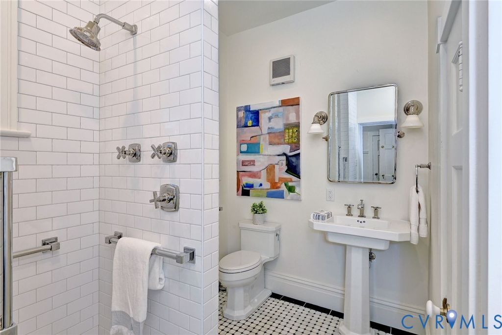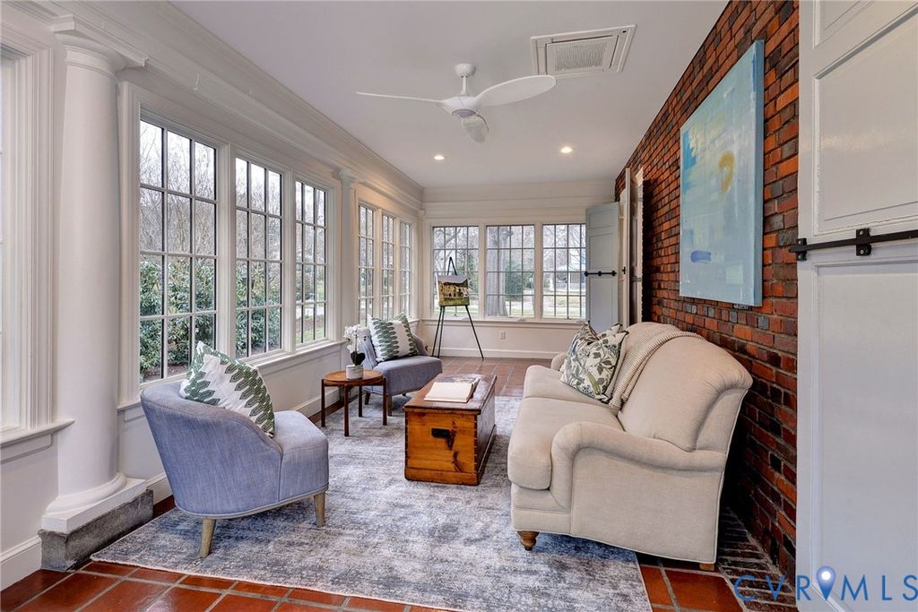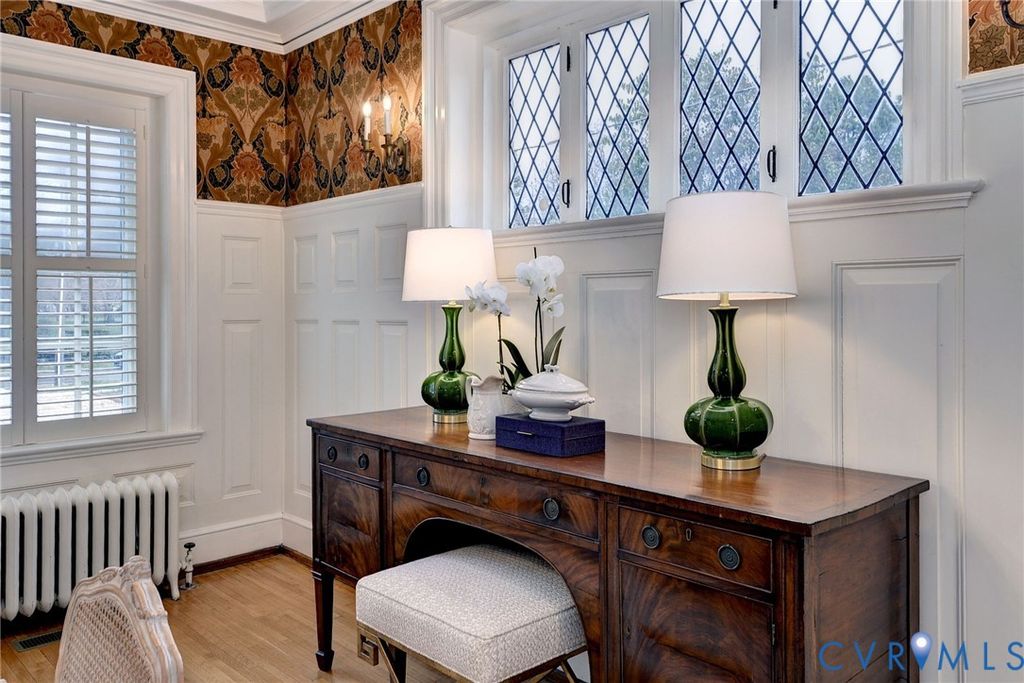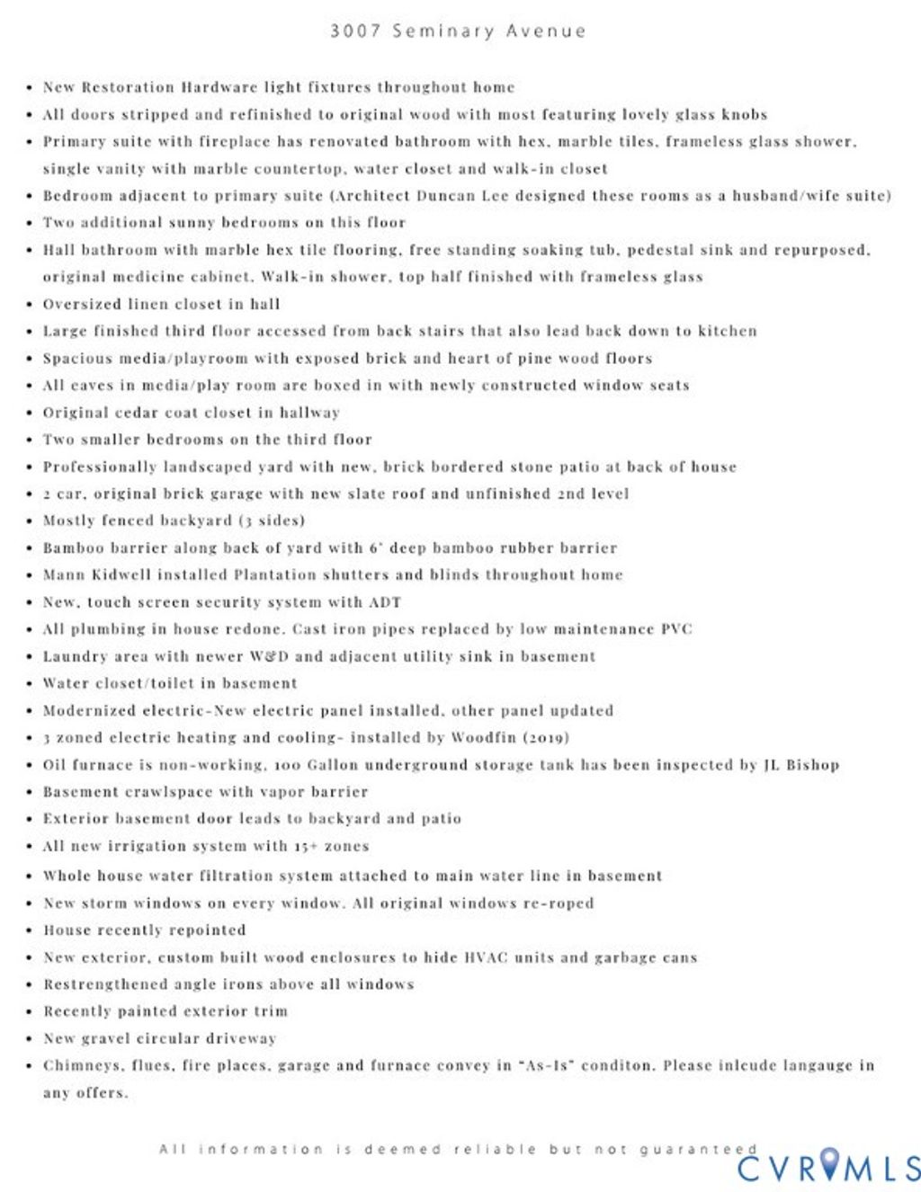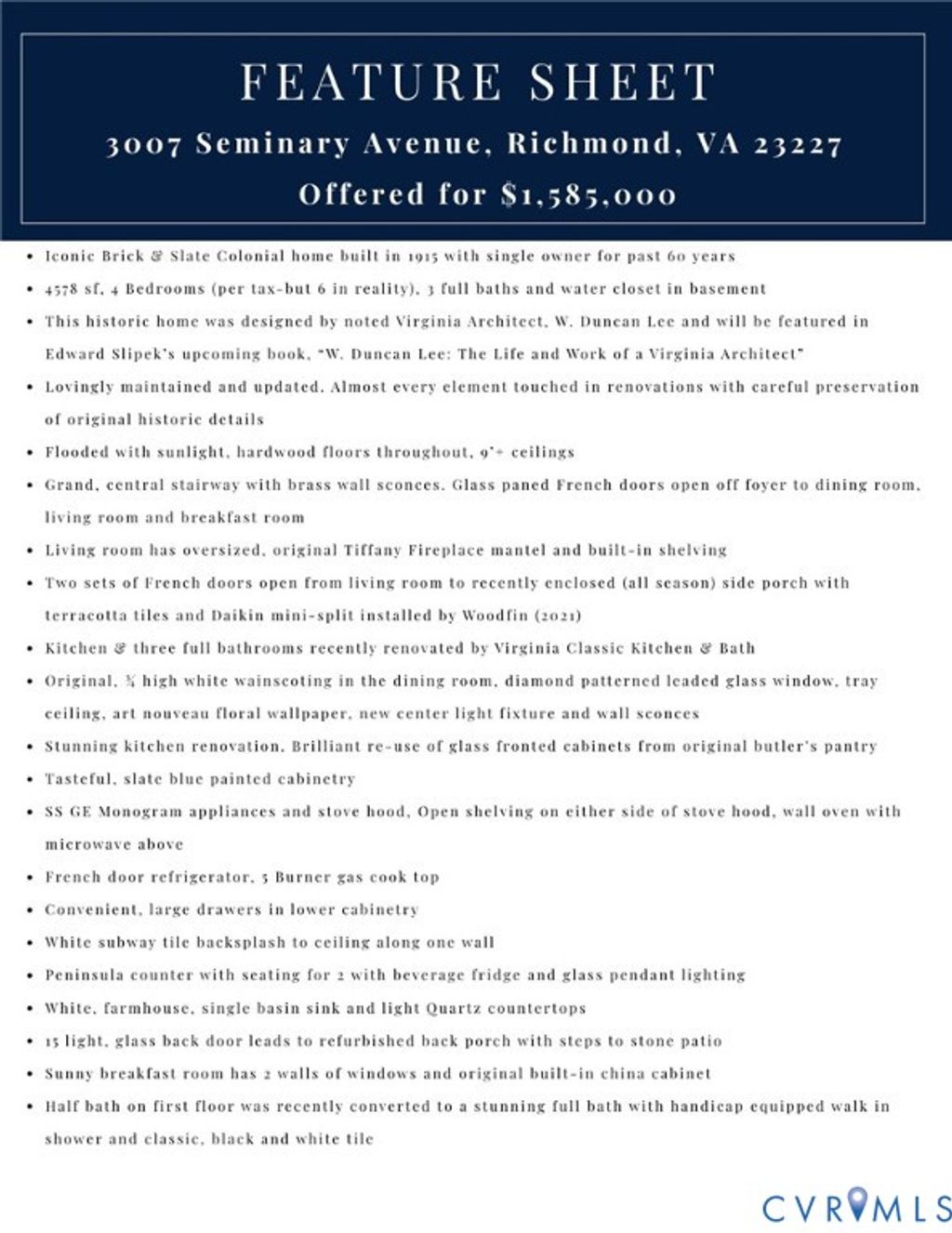 A distinguished 1915 brick and slate Colonial designed by noted Virginia architect W. Duncan Lee. This rare historic residence has been owned by the same family for 60 years. Meticulously maintained and thoughtfully renovated, it blends modern upgrades with preserved architectural detail. Enchanting light-filled interiors feature hardwood floors, high ceilings, a grand foyer with brass sconces, sweeping center stairway and French doors connecting formal living, dining, and breakfast rooms. The living room includes an original Tiffany mantel, built-ins, and access to a sunlit, all-season porch with terracotta tile and mini-split. The dining room showcases dramatic original wainscoting, leaded glass, diamond patterned window, and tray ceiling. A renovated kitchen by Virginia Classic Kitchen & Bath incorporates original butler's pantry cabinetry, custom slate-blue cabinets, quartz counters, porcelain farmhouse sink, and GE Monogram appliances. Features include subway tile, open shelving, peninsula seating, wine fridge and glass pendants. A glass door opens to the rear porch, stone patio, and backyard. Upstairs are four bedrooms, including a primary suite with marble tiled bathroom and walk-in closet. The third floor offers ann oversized media/playroom with exposed brick & heart of pine floors, two additional bedrooms, and an original cedar closet. Exterior highlights include a brick-bordered stone patio, professionally landscaped yard with rubber bamboo barrier, circular gravel drive, and two-car brick garage with unfinished 2nd level & new slate roof. Updates include repointed brick, restored windows, new storm windows, updated systems, 15 zone irrigation, and security system. Two-zone HVAC (2019) plus mini-split (2021) on all season, enclosed porch. Basement includes laundry, utility sink, water closet and walk-out exterior access. Washer & Dryer and wine fridge all convey. Please see detailed Feature Sheet and floor plans in supplements section. Located in Historic Ginter Park.